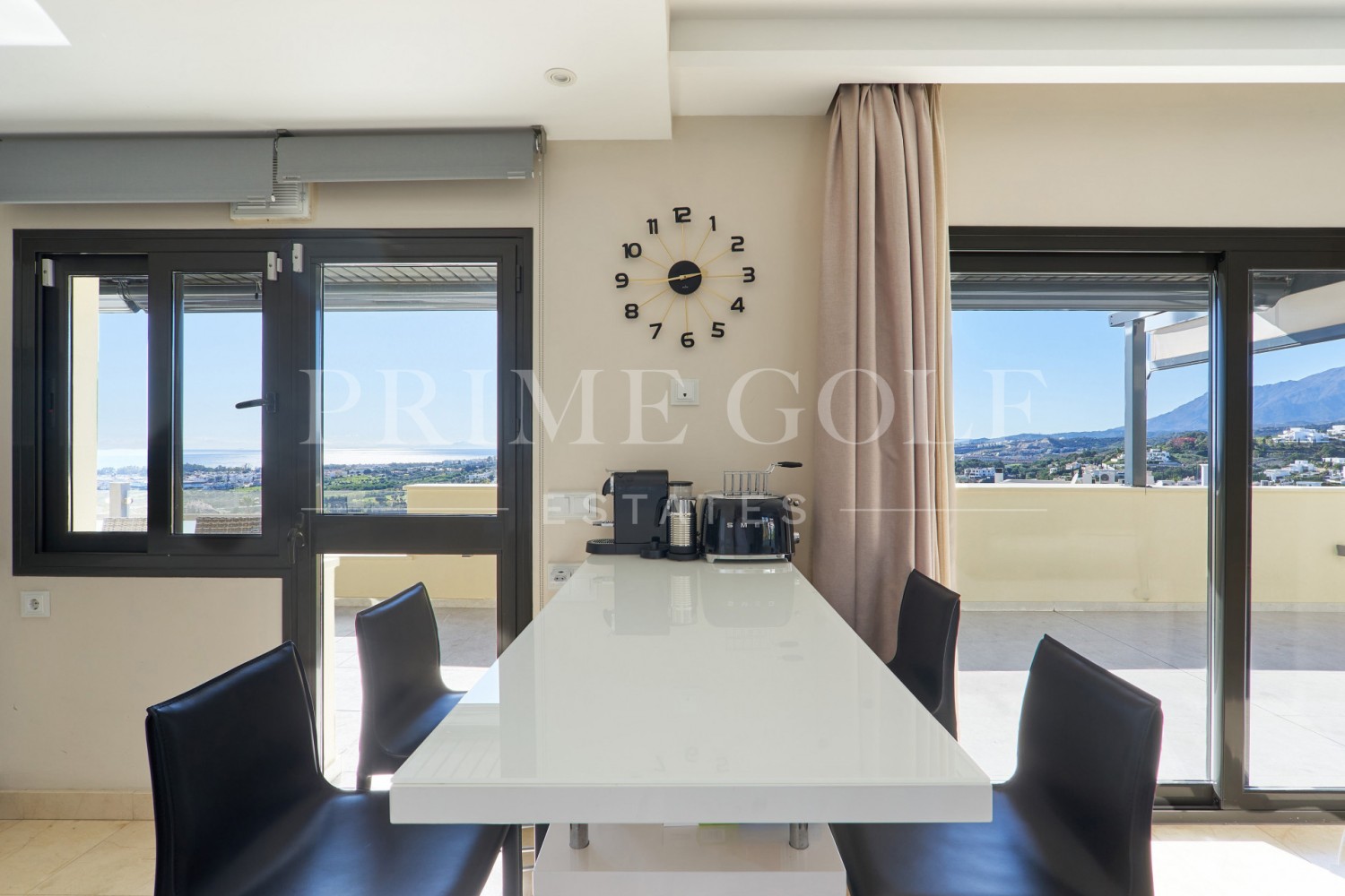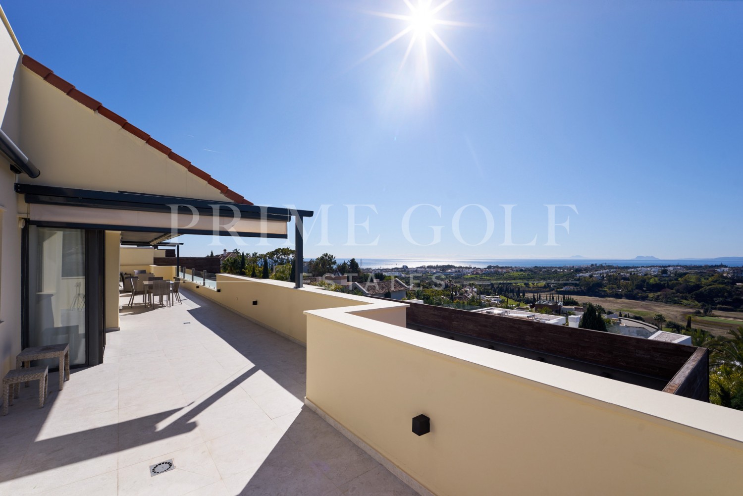 The highlight of this penthouse is the outdoor living with its private terrace offering panoramic views of the sea, mountains, golf courses. Residents can also enjoy three communal swimming pools and a beautiful garden, as well as access to a tennis/paddle court, mini golf. The property is part of a gated community with a secure entrance, video intercom and lift, providing peace of mind and convenience. Additional features include electric blinds, double glazing, storage and fibre internet.