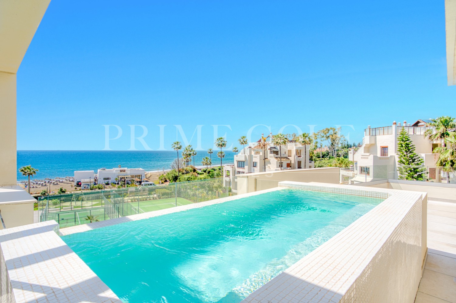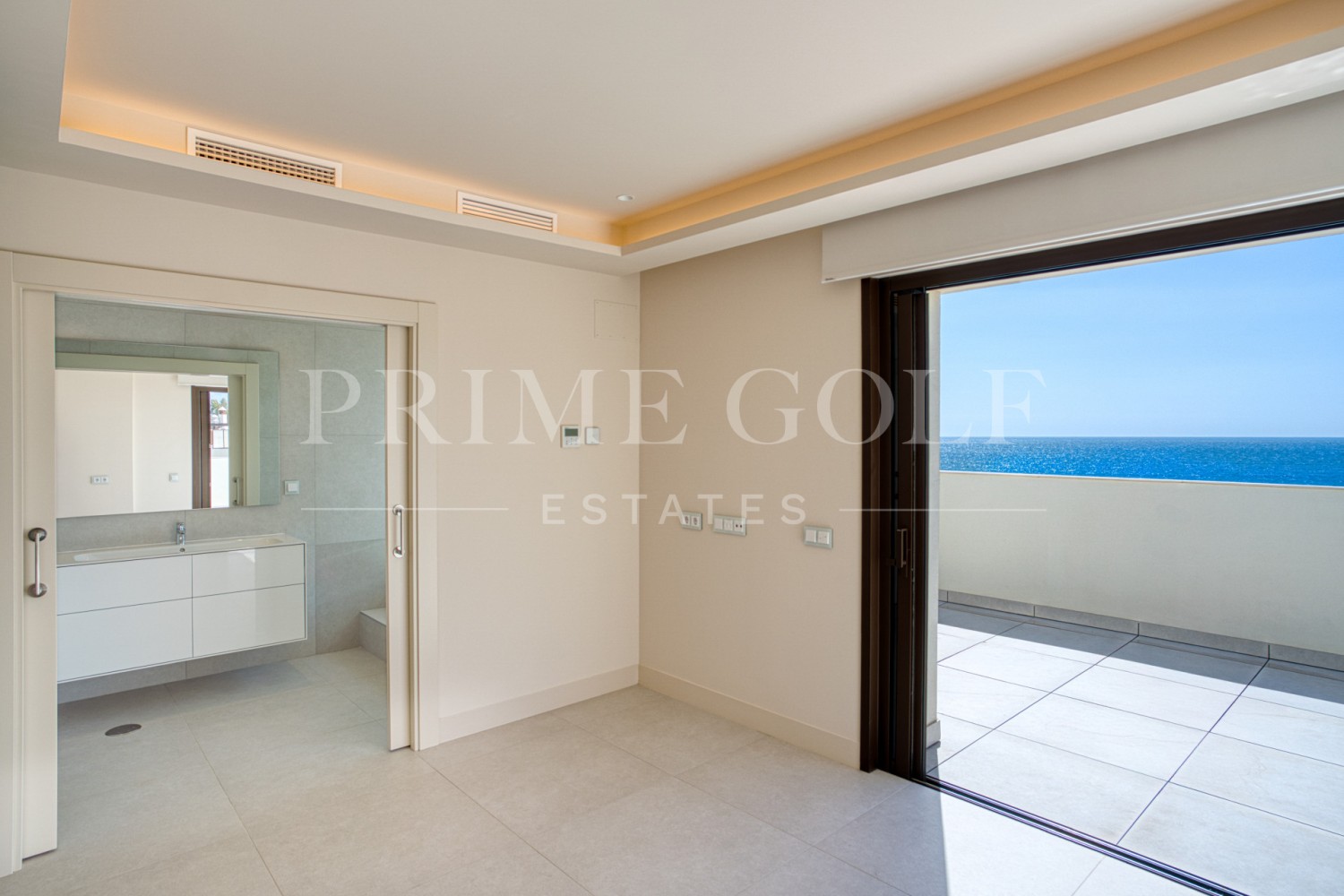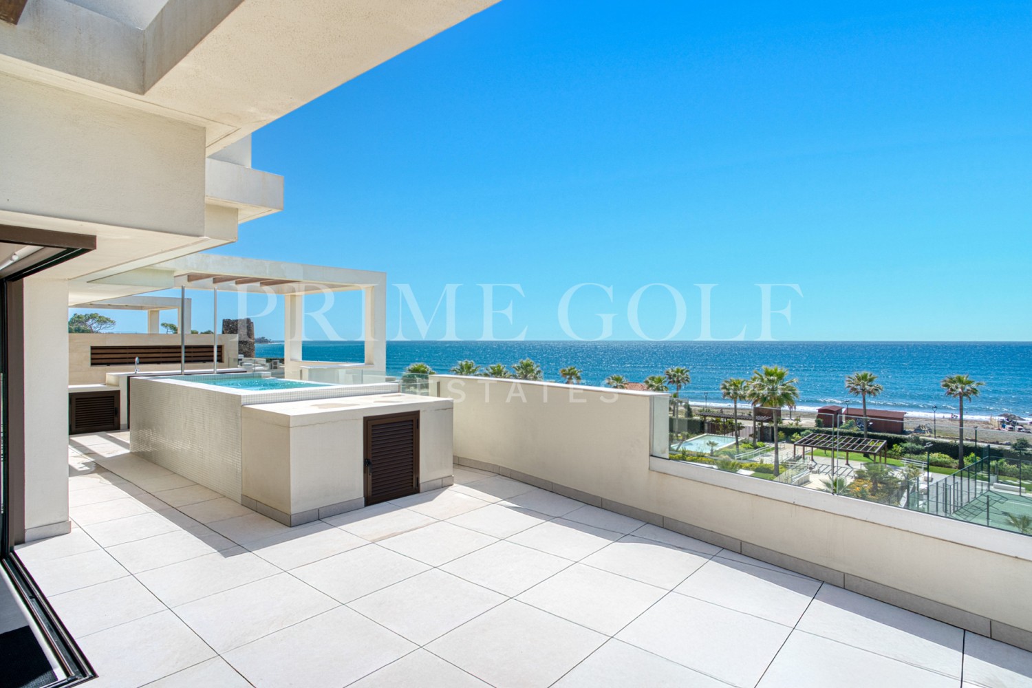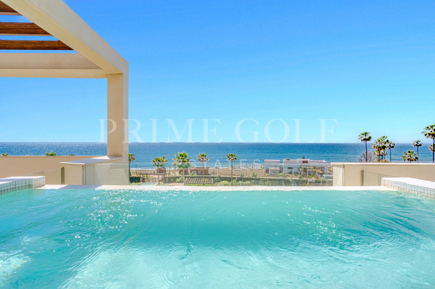 Luxurious four-bedroom duplex penthouse located in a frontline beach community on Marbella’s prestigious New Golden Mile. This magnificent property offers breath-taking views of the Mediterranean Sea, Gibraltar, and the North African coastline. The property features four bedrooms and four bathrooms, including an elegant master suite on the upper floor with a spacious private terrace and spectacular panoramic views. The penthouse is offered unfurnished, allowing you to tailor the interior to your personal style. The fully equipped kitchen blends seamlessly with the home’s modern design. The upper floor also boasts a stunning solarium with private plunge pool, perfect for enjoying the sun and sea views. Additional features include two underground parking spaces and a large storage room. The residential community offers a wide range of top-class amenities: an outdoor infinity pool, children’s pool, playground, tennis and paddle courts, two fitness centres, and a jacuzzi. With direct access to the beach and a prime location near exclusive beach clubs, fine dining restaurants, high-end shops, golf courses, and more, this penthouse is an exceptional opportunity to enjoy a sophisticated lifestyle in one of the most sought-after areas of the Costa del Sol.