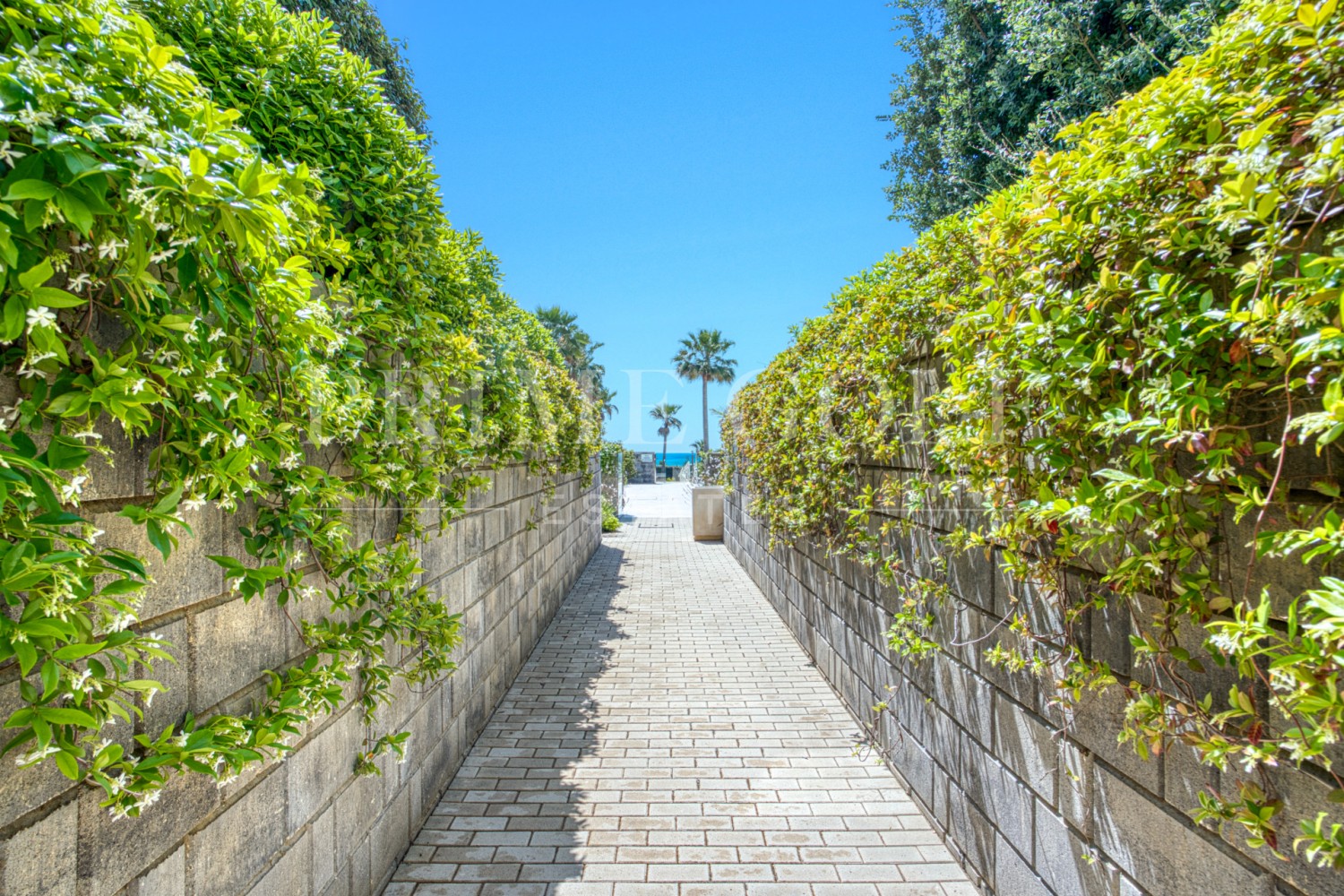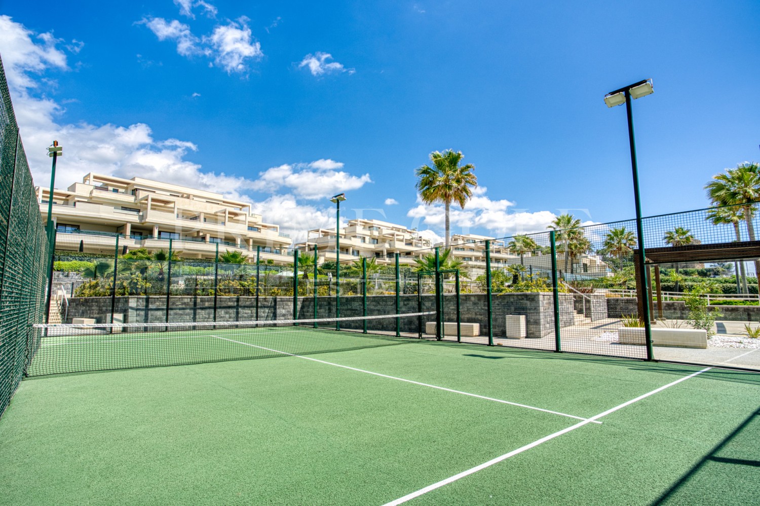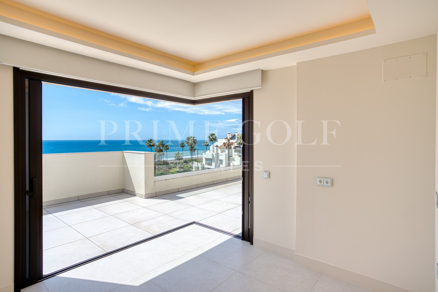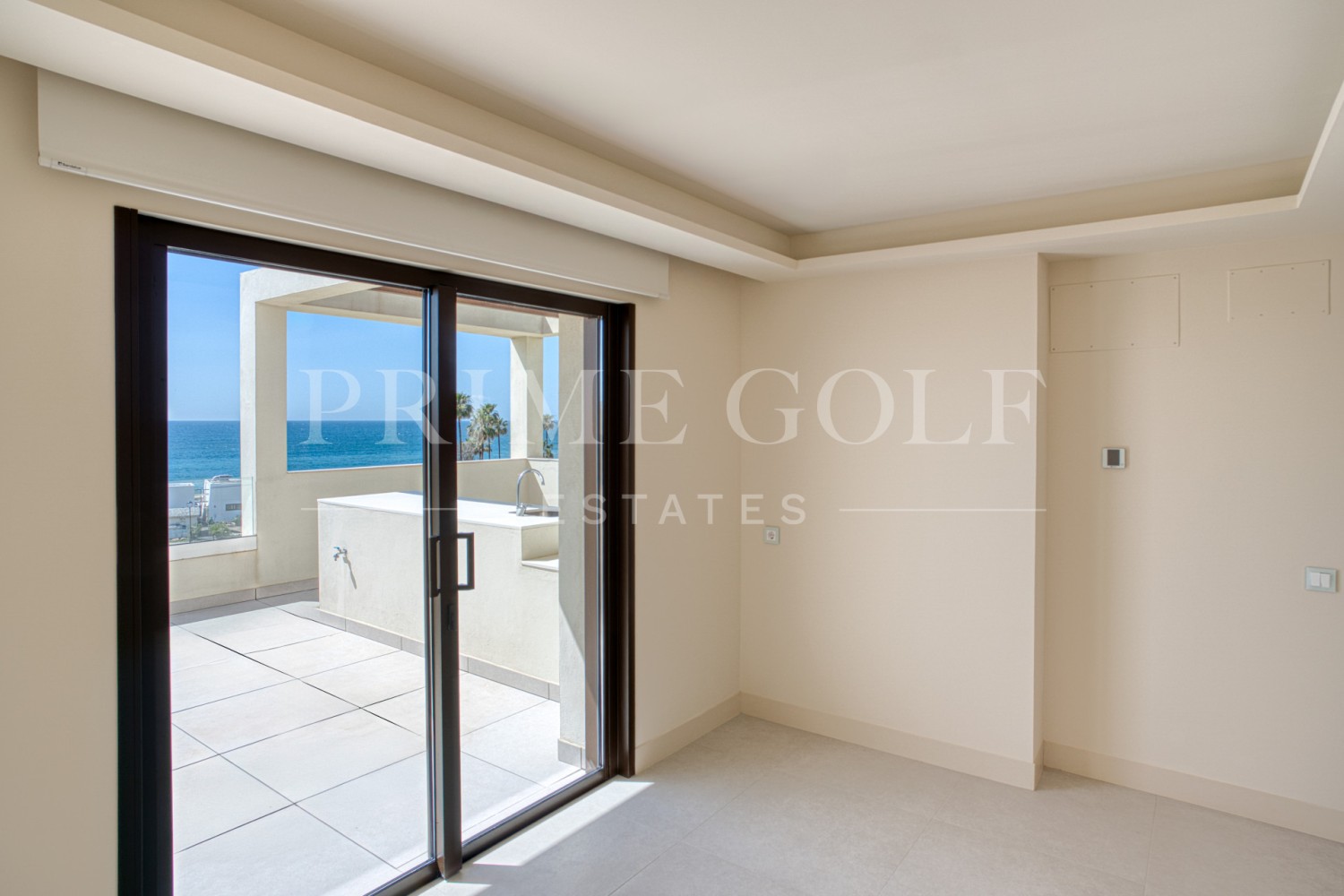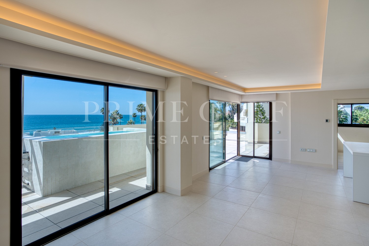 Luxurious four-bedroom duplex penthouse located in a frontline beach community on Marbella’s prestigious New Golden Mile. This magnificent property offers breath-taking views of the Mediterranean Sea, Gibraltar, and the North African coastline. The property features four bedrooms and four bathrooms, including an elegant master suite on the upper floor with a spacious private terrace and spectacular panoramic views. The penthouse is offered unfurnished, allowing you to tailor the interior to your personal style. The fully equipped kitchen blends seamlessly with the home’s modern design. The upper floor also boasts a stunning solarium with private plunge pool, perfect for enjoying the sun and sea views. Additional features include two underground parking spaces and a large storage room. The residential community offers a wide range of top-class amenities: an outdoor infinity pool, children’s pool, playground, tennis and paddle courts, two fitness centres, and a jacuzzi. With direct access to the beach and a prime location near exclusive beach clubs, fine dining restaurants, high-end shops, golf courses, and more, this penthouse is an exceptional opportunity to enjoy a sophisticated lifestyle in one of the most sought-after areas of the Costa del Sol.