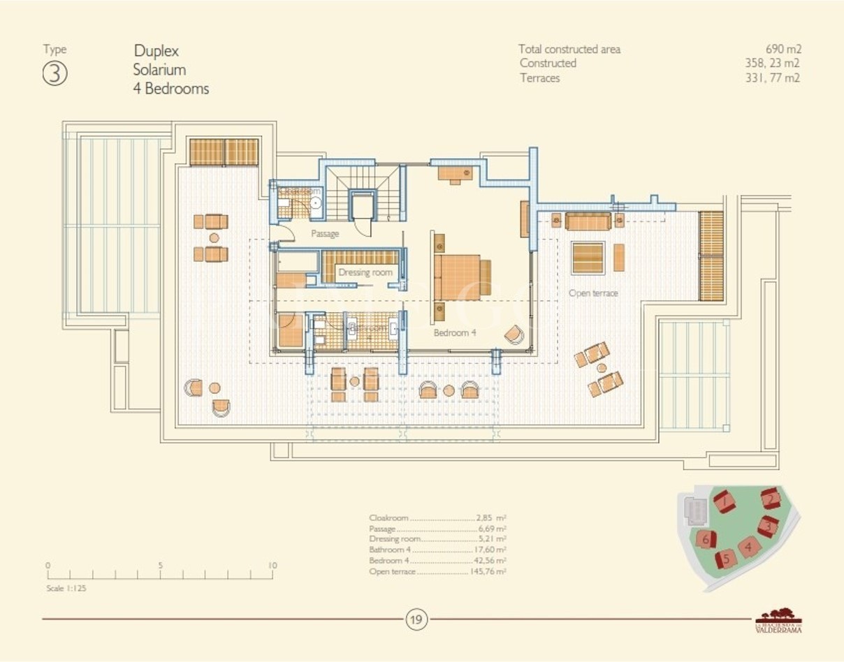 It is accessed from the first floor via stairs or elevator to the main floor divided into living / dining room of ample dimensions and exit to the east/south facing terrace overlooking the complex. Equipped kitchen, laundry terrace, guest bathroom and sleeping quarters area. There are three bedrooms with en suite bathrooms and closets.