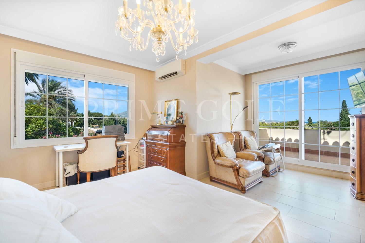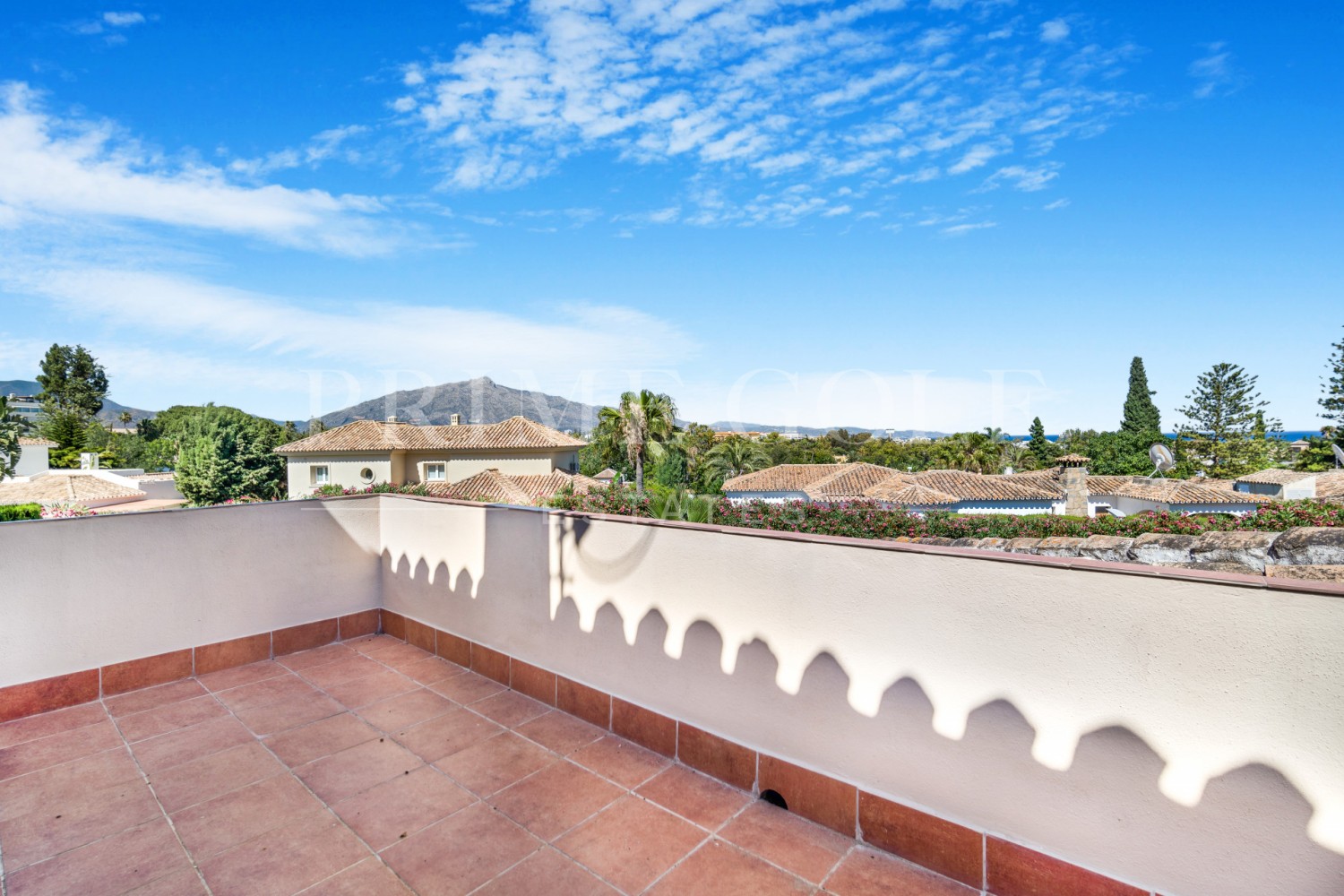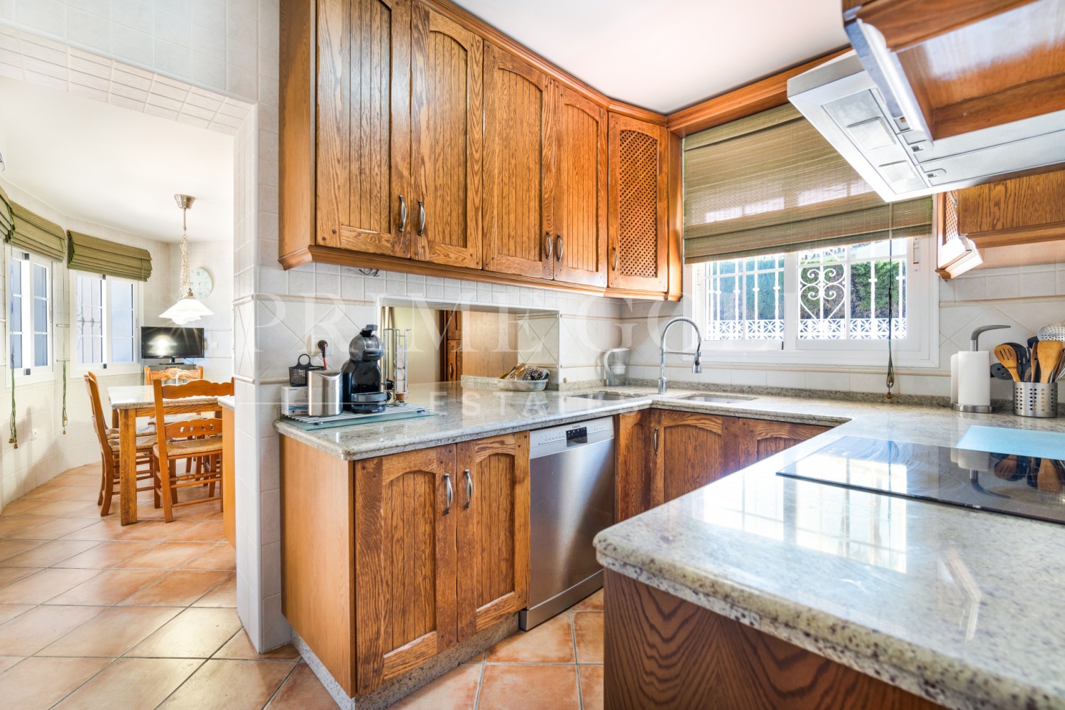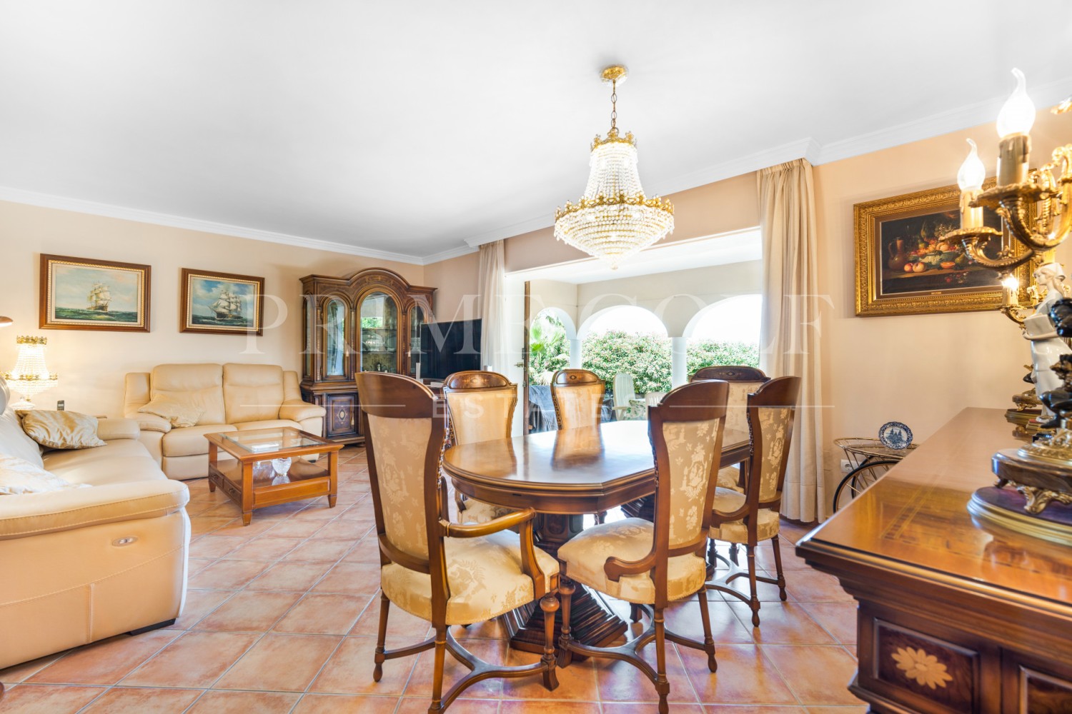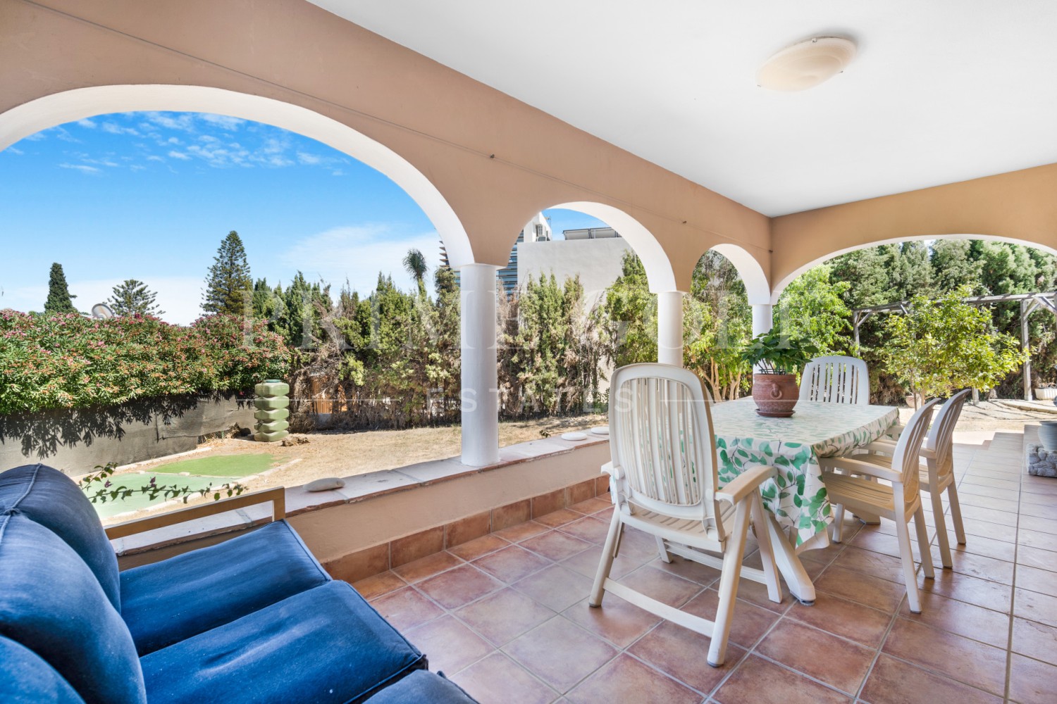Excellent four bedroom south facing villa in a residential area of Guadalmina Alta; just a short drive to local amenities, the beach, Marbella and Puerto Banus. The property is distributed over two levels; the entrance has a spacious hall; open plan living and dining room with sliding doors leading to the private terrace and garden; bedroom which is currently being used as an office; fully fitted kitchen; two guest bedrooms; guest bathroom; and a guest toilet. There is also access from the kitchen to the converted garage which is now a large multi-purpose room which could be used as an additional bedroom or gym. The upper-level leads to the master suite with walk in closet and private terrace with partial sea views. Other features include a spacious driveway and private car port and hot and cold air conditioning.