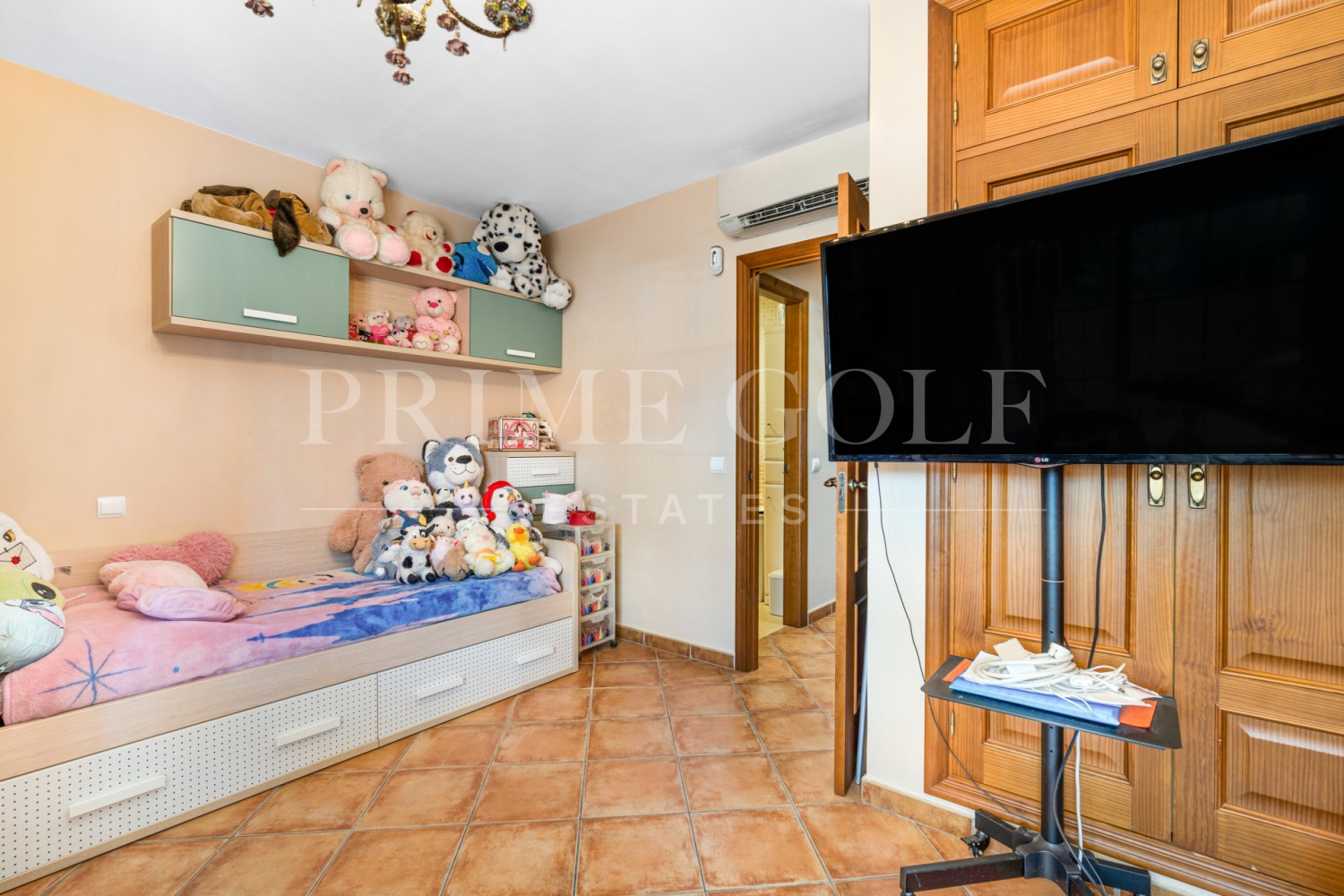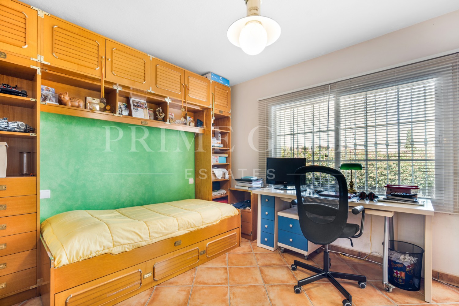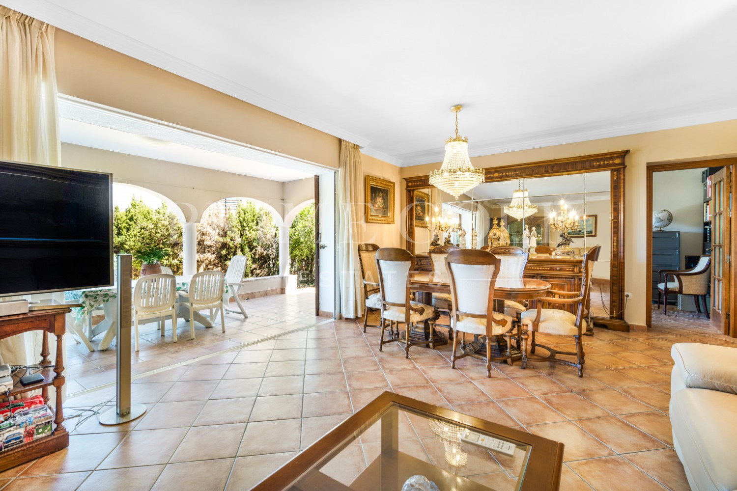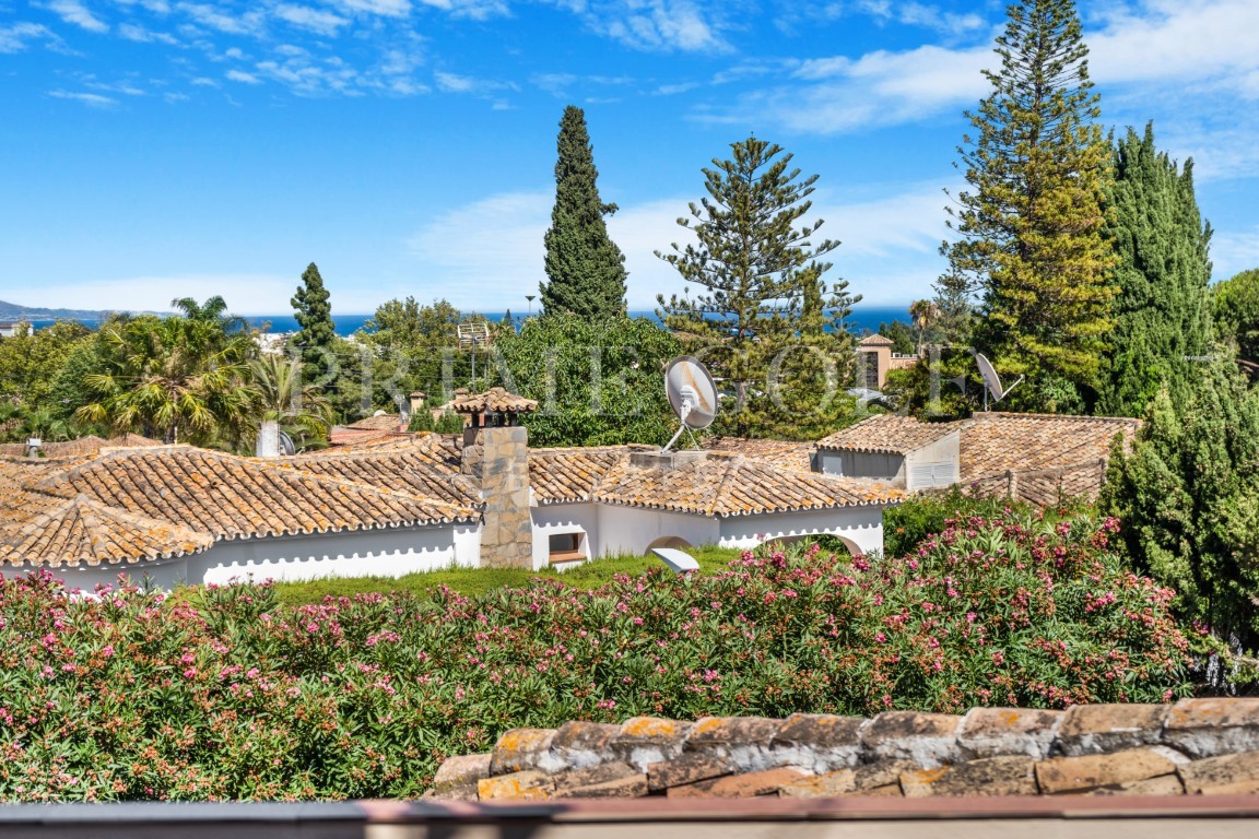 Excellent four bedroom south facing villa in a residential area of Guadalmina Alta; just a short drive to local amenities, the beach, Marbella and Puerto Banus. The property is distributed over two levels; the entrance has a spacious hall; open plan living and dining room with sliding doors leading to the private terrace and garden; bedroom which is currently being used as an office; fully fitted kitchen; two guest bedrooms; guest bathroom; and a guest toilet. There is also access from the kitchen to the converted garage which is now a large multi-purpose room which could be used as an additional bedroom or gym. The upper-level leads to the master suite with walk in closet and private terrace with partial sea views. Other features include a spacious driveway and private car port and hot and cold air conditioning.