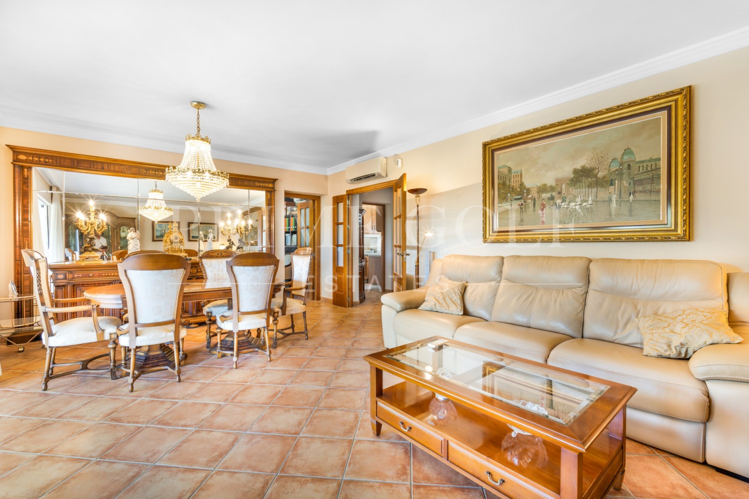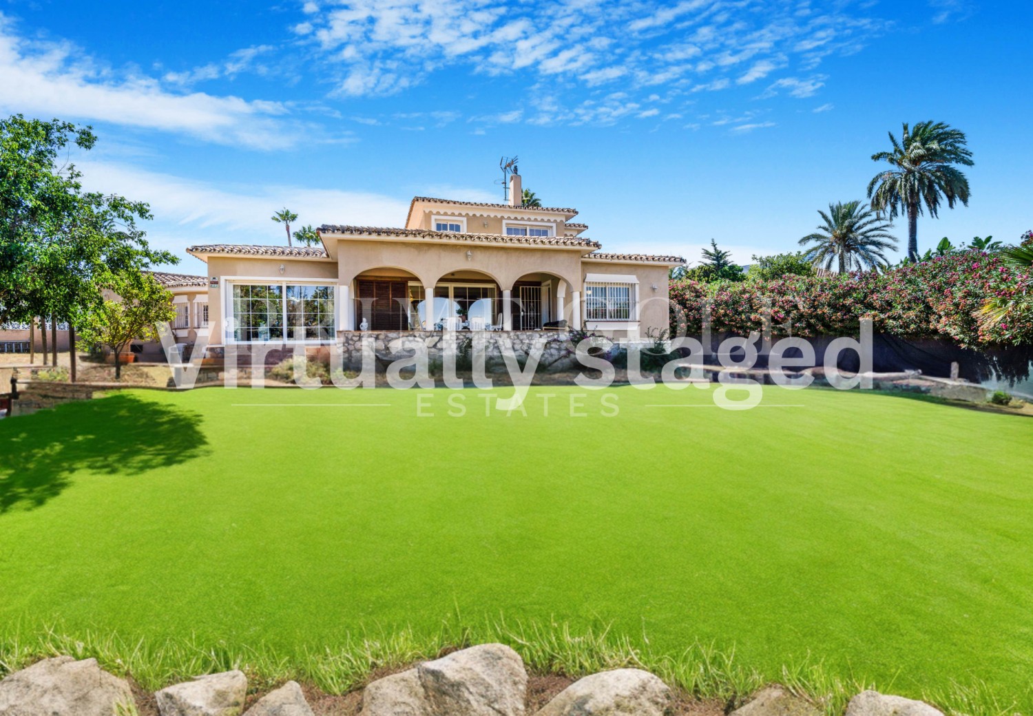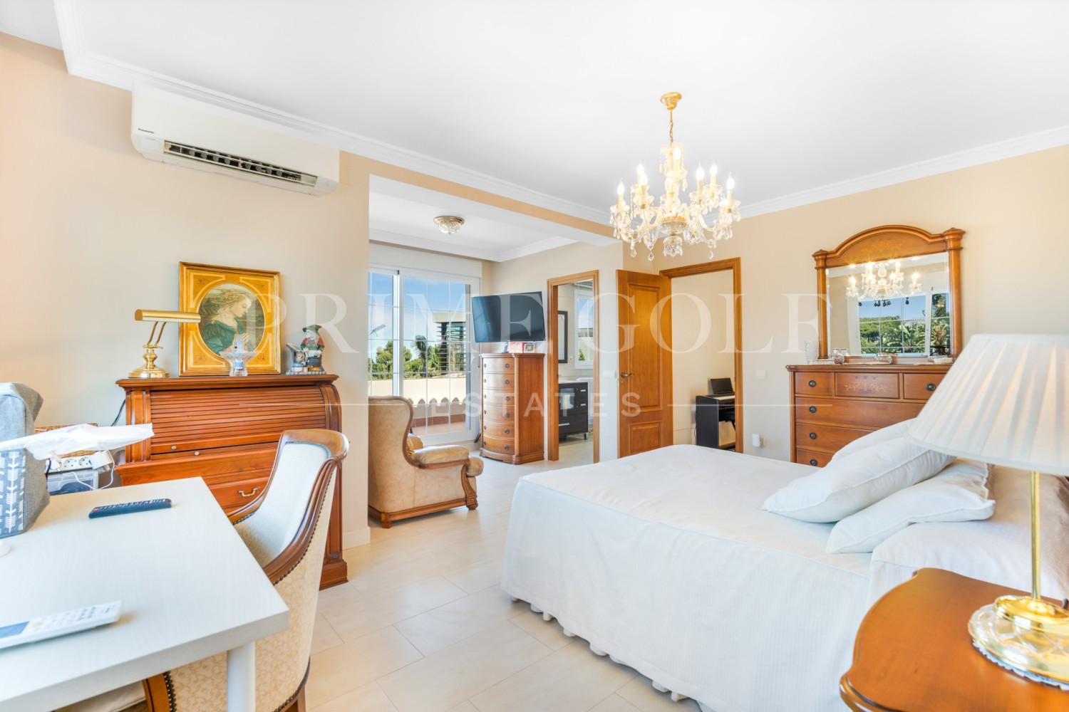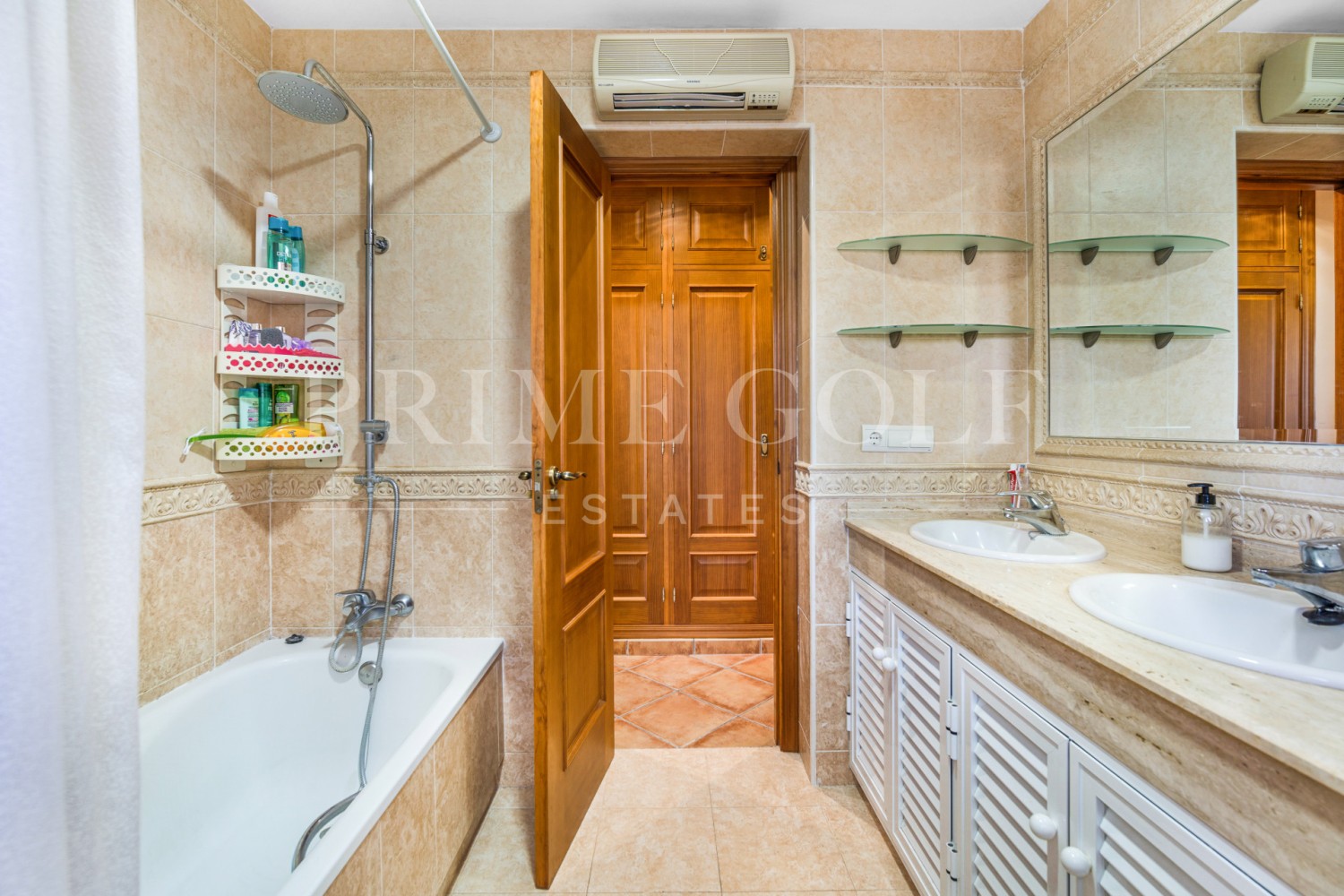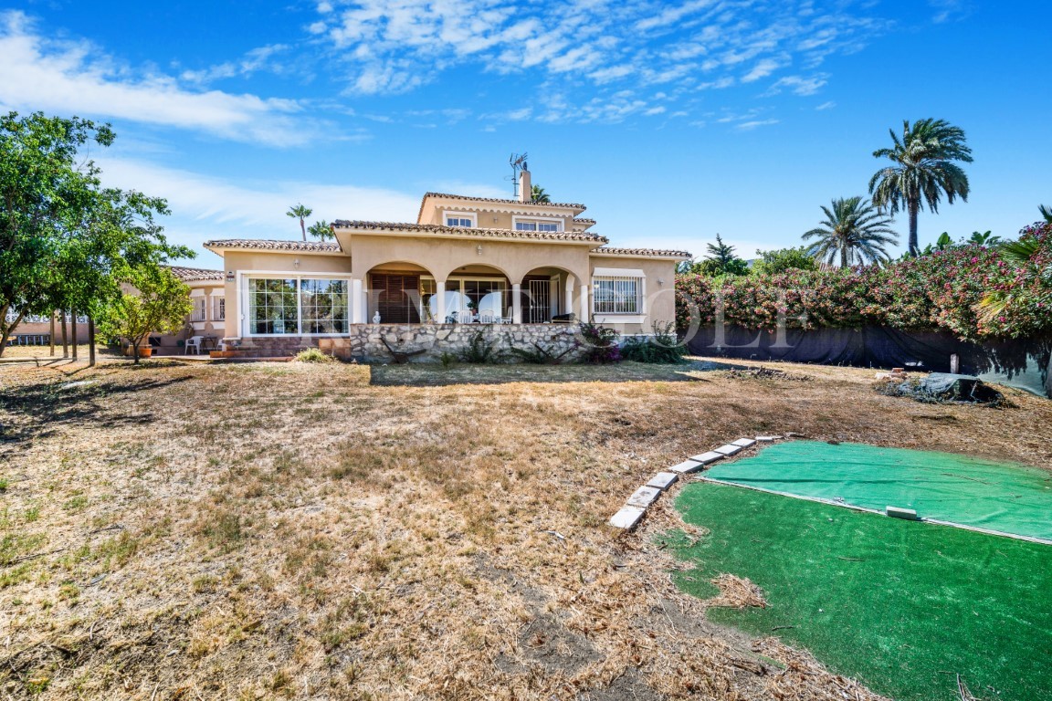 Excellent four bedroom south facing villa in a residential area of Guadalmina Alta; just a short drive to local amenities, the beach, Marbella and Puerto Banus. The property is distributed over two levels; the entrance has a spacious hall; open plan living and dining room with sliding doors leading to the private terrace and garden; bedroom which is currently being used as an office; fully fitted kitchen; two guest bedrooms; guest bathroom; and a guest toilet. There is also access from the kitchen to the converted garage which is now a large multi-purpose room which could be used as an additional bedroom or gym. The upper-level leads to the master suite with walk in closet and private terrace with partial sea views. Other features include a spacious driveway and private car port and hot and cold air conditioning.