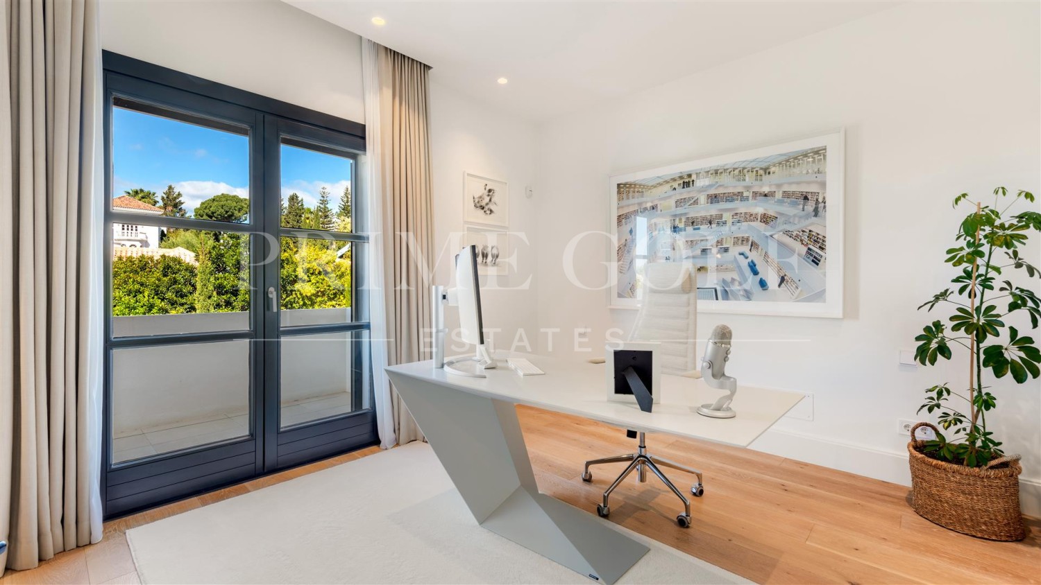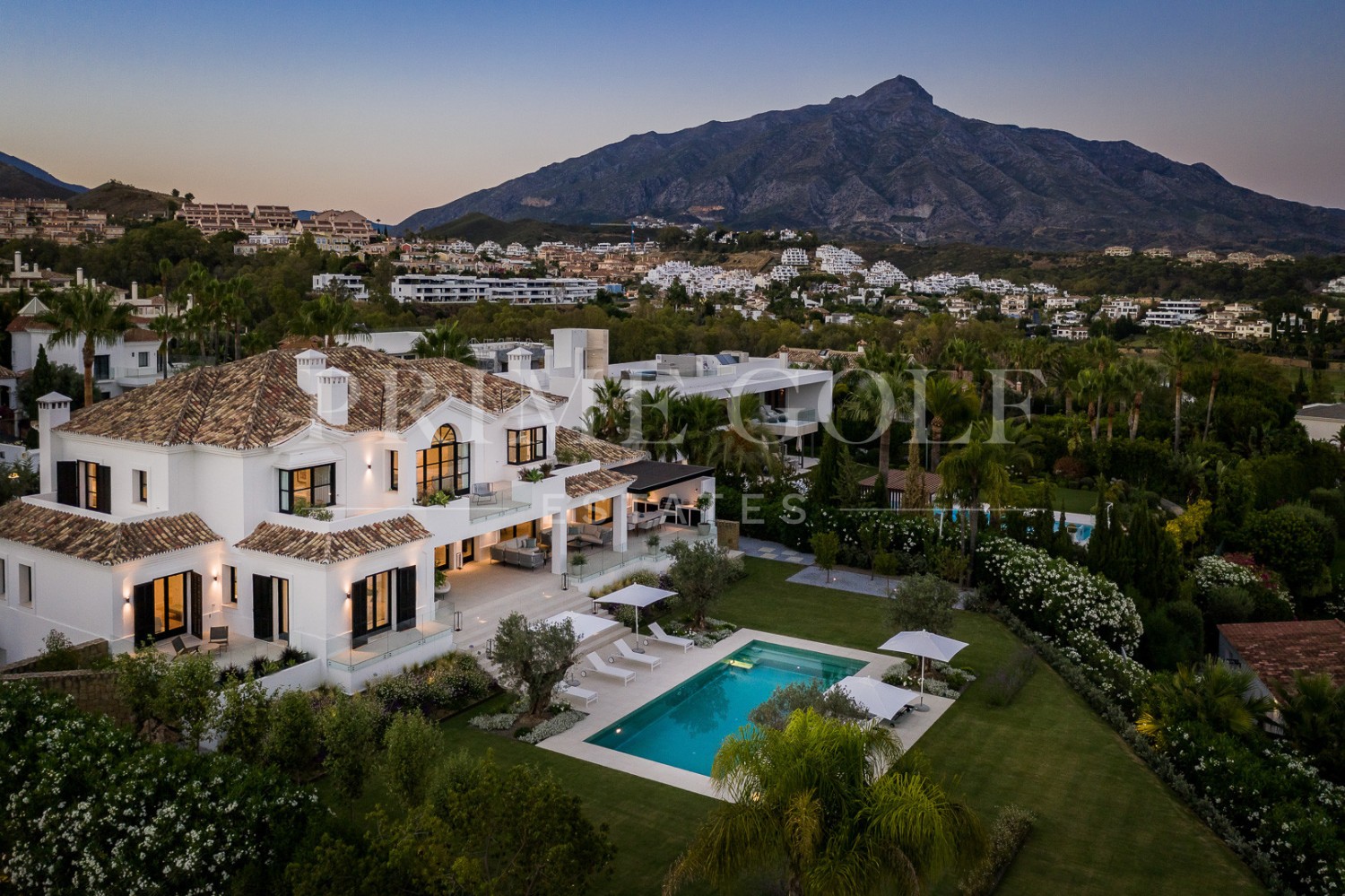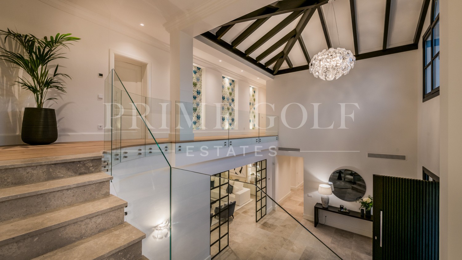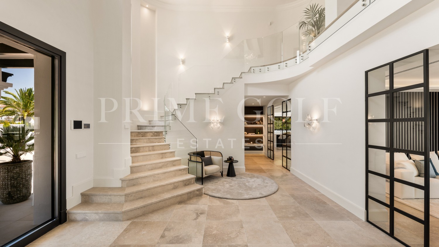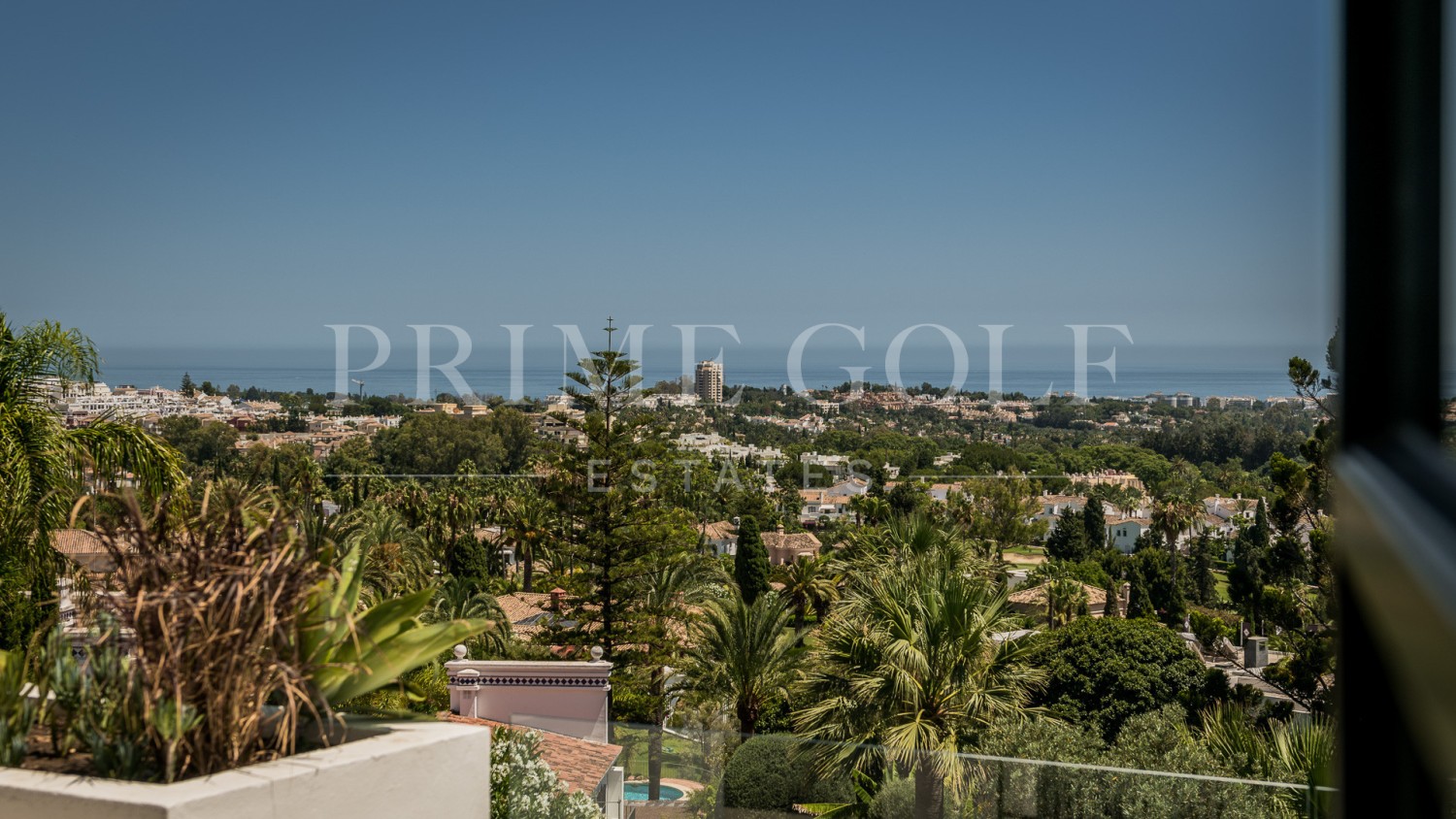 A timeless, beautiful property for sale in the prestigious community of La Cerquilla, Nueva Andalucia. Recently completely reformed to a very high standard, this stunning property is situated on the top street of La Cerquilla. It commands panoramic views over the golf valley towards the sea. The property is over 1,000m2, built over 3 levels, and sits on a plot of nearly 3,000m2, making it one of the largest villas available in La Cerquilla. An impressive entrance courtyard with room for several cars leads to a spacious entrance with a double-height ceiling and remarkable views of the sea. The hall leads directly into a spacious living room with fantastic sea views, a dining area that faces the sea, and a large open-plan kitchen with an adjacent TV / family room. These rooms overlook the sea and lead directly to the main covered terrace with an in-built barbecue and room for outside dining and lounging. Also on this level are 3 double bedrooms with en suite bathrooms and private dressing areas; one guest bedroom faces the garden, whilst the other two face the sea with private outdoor terraces.