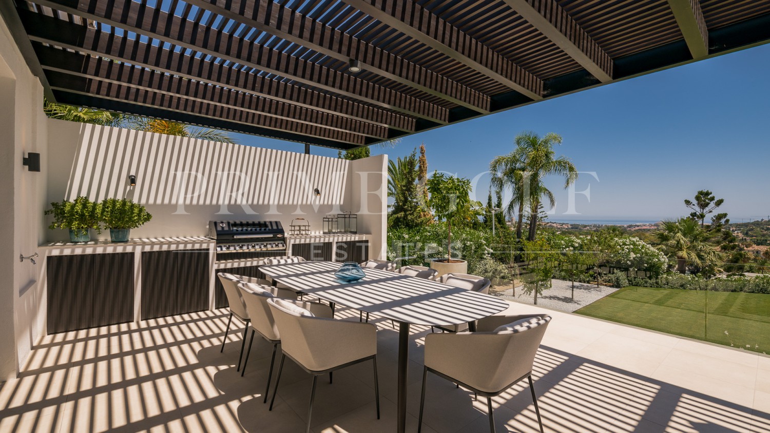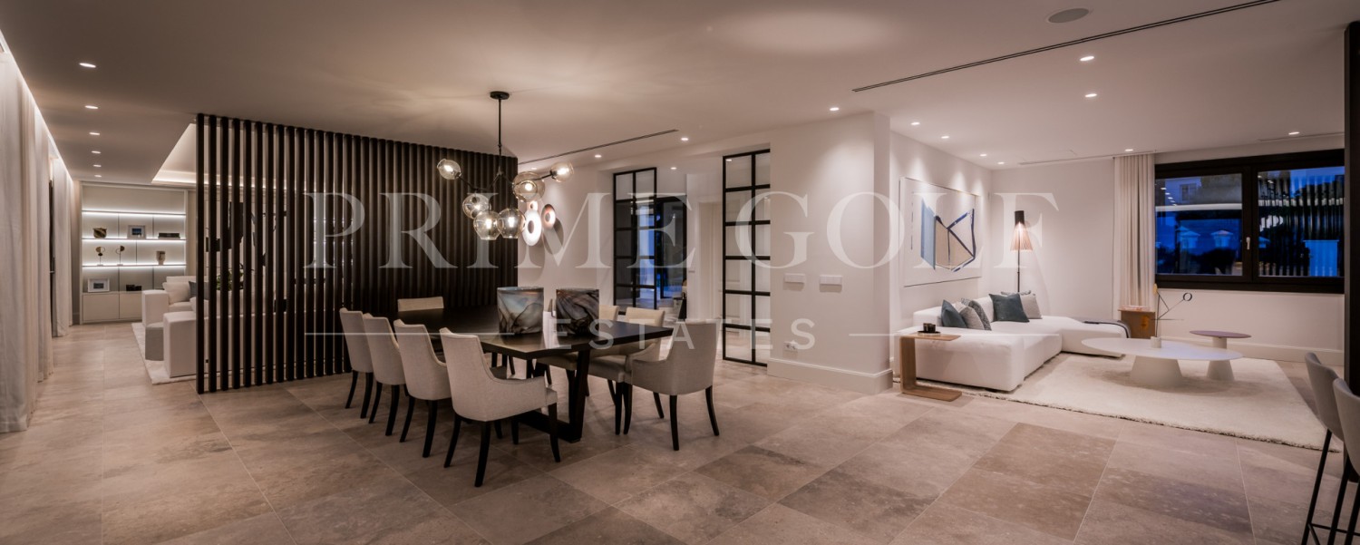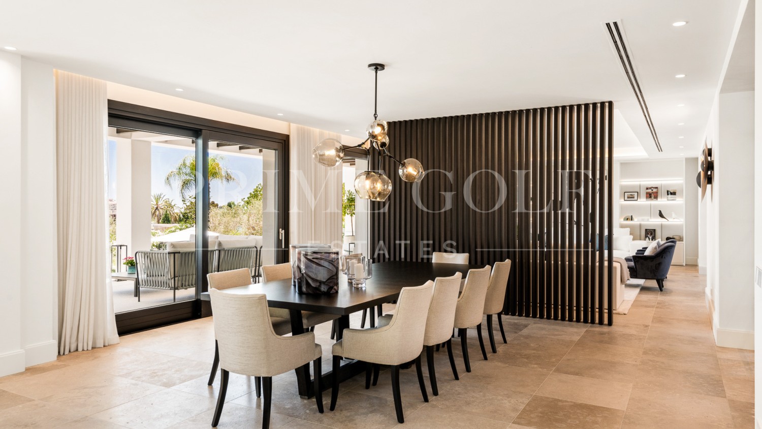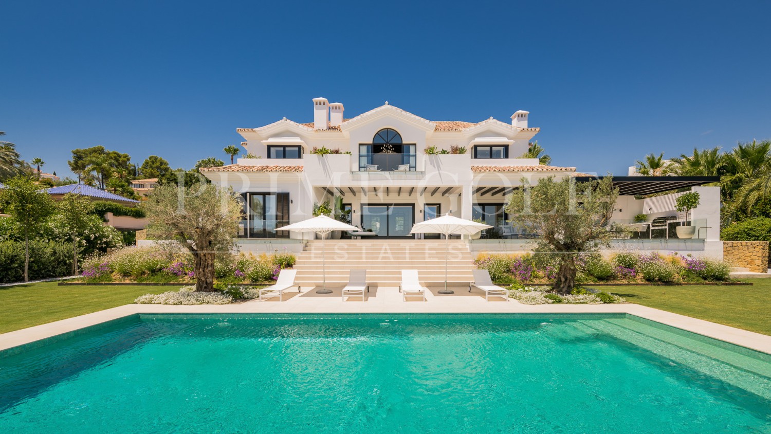 A timeless, beautiful property for sale in the prestigious community of La Cerquilla, Nueva Andalucia. Recently completely reformed to a very high standard, this stunning property is situated on the top street of La Cerquilla. It commands panoramic views over the golf valley towards the sea. The property is over 1,000m2, built over 3 levels, and sits on a plot of nearly 3,000m2, making it one of the largest villas available in La Cerquilla. An impressive entrance courtyard with room for several cars leads to a spacious entrance with a double-height ceiling and remarkable views of the sea. The hall leads directly into a spacious living room with fantastic sea views, a dining area that faces the sea, and a large open-plan kitchen with an adjacent TV / family room. These rooms overlook the sea and lead directly to the main covered terrace with an in-built barbecue and room for outside dining and lounging. Also on this level are 3 double bedrooms with en suite bathrooms and private dressing areas; one guest bedroom faces the garden, whilst the other two face the sea with private outdoor terraces.