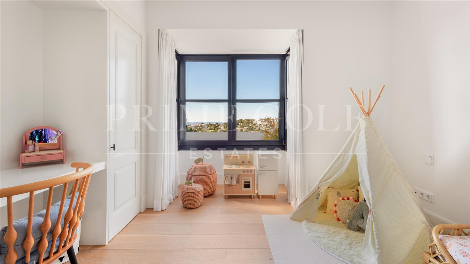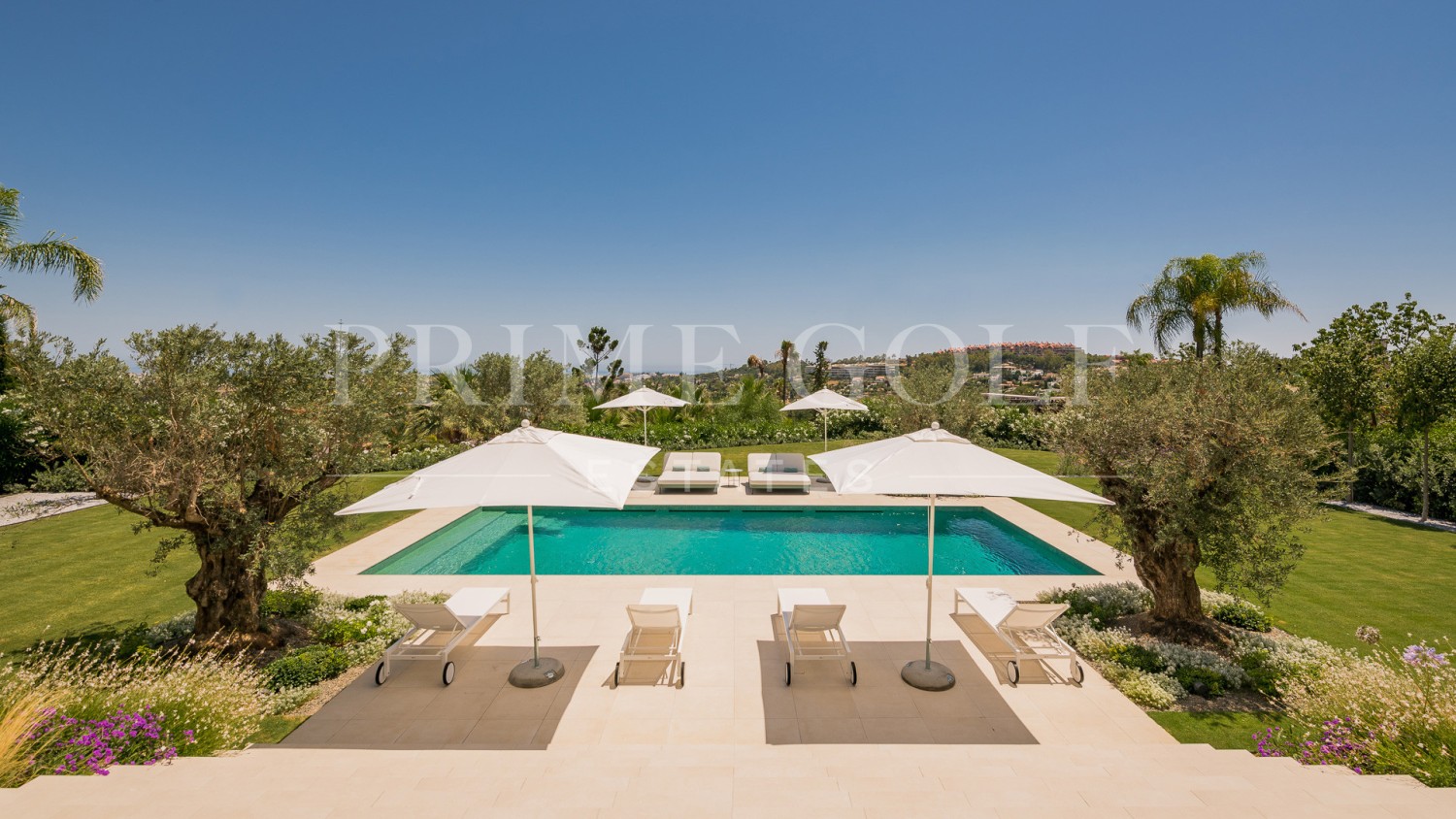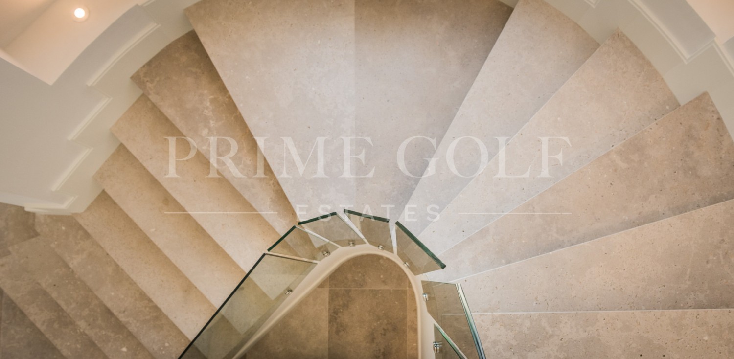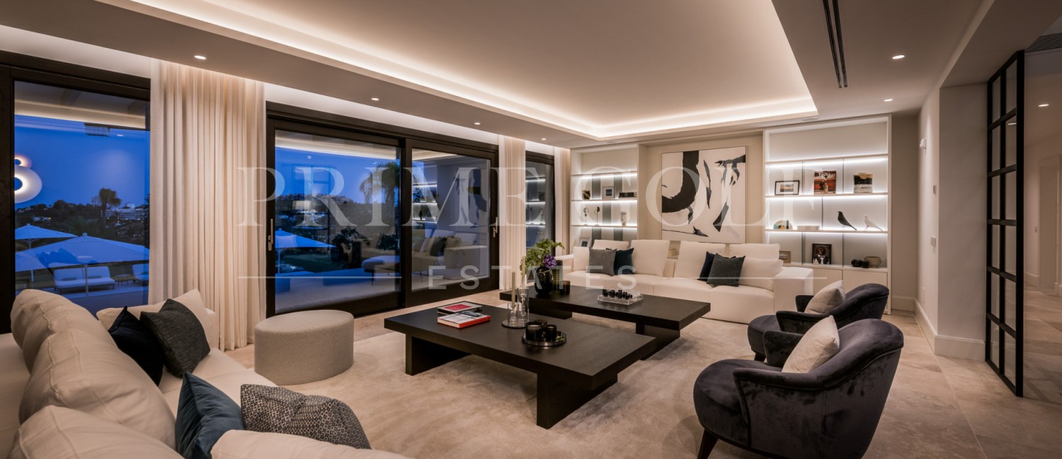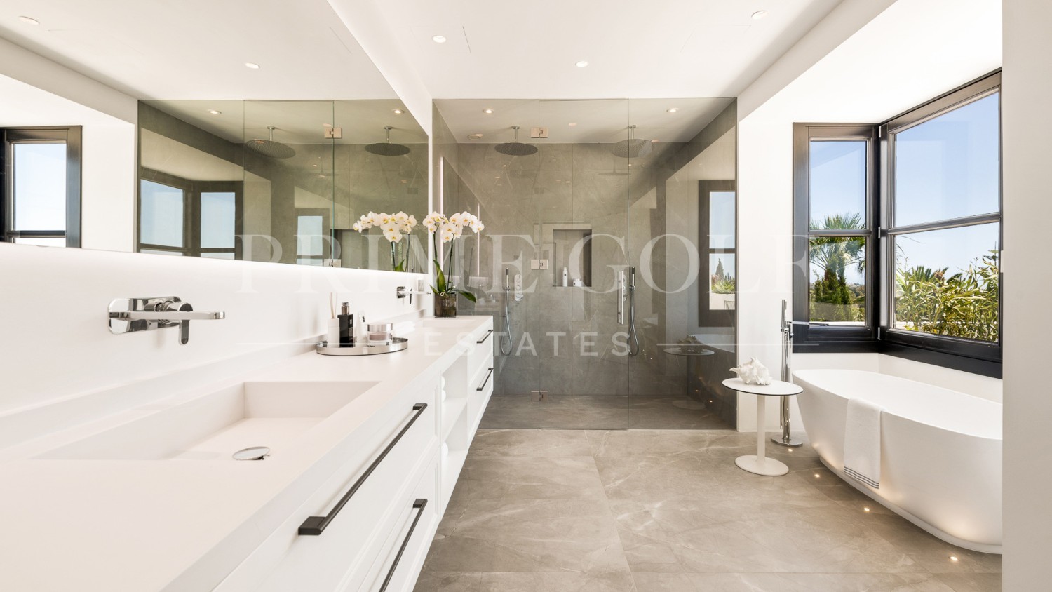 A timeless, beautiful property for sale in the prestigious community of La Cerquilla, Nueva Andalucia. Recently completely reformed to a very high standard, this stunning property is situated on the top street of La Cerquilla. It commands panoramic views over the golf valley towards the sea. The property is over 1,000m2, built over 3 levels, and sits on a plot of nearly 3,000m2, making it one of the largest villas available in La Cerquilla. An impressive entrance courtyard with room for several cars leads to a spacious entrance with a double-height ceiling and remarkable views of the sea. The hall leads directly into a spacious living room with fantastic sea views, a dining area that faces the sea, and a large open-plan kitchen with an adjacent TV / family room. These rooms overlook the sea and lead directly to the main covered terrace with an in-built barbecue and room for outside dining and lounging. Also on this level are 3 double bedrooms with en suite bathrooms and private dressing areas; one guest bedroom faces the garden, whilst the other two face the sea with private outdoor terraces.