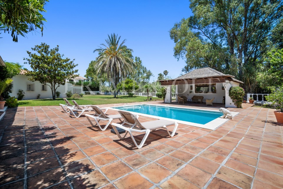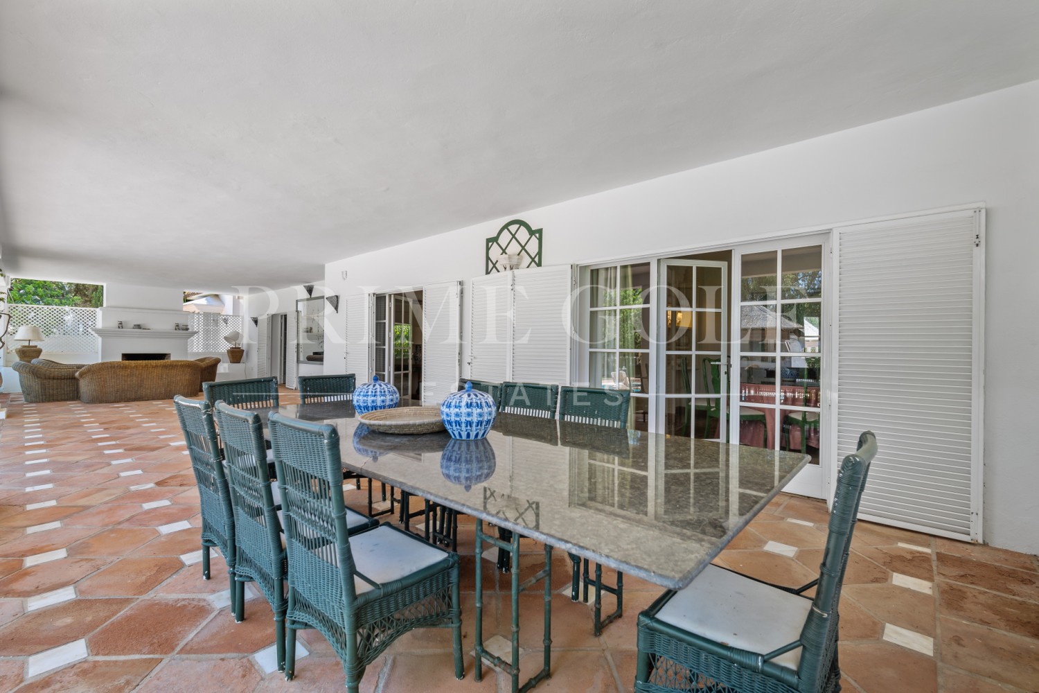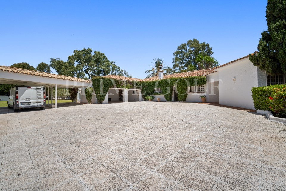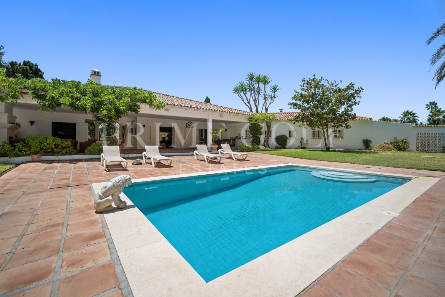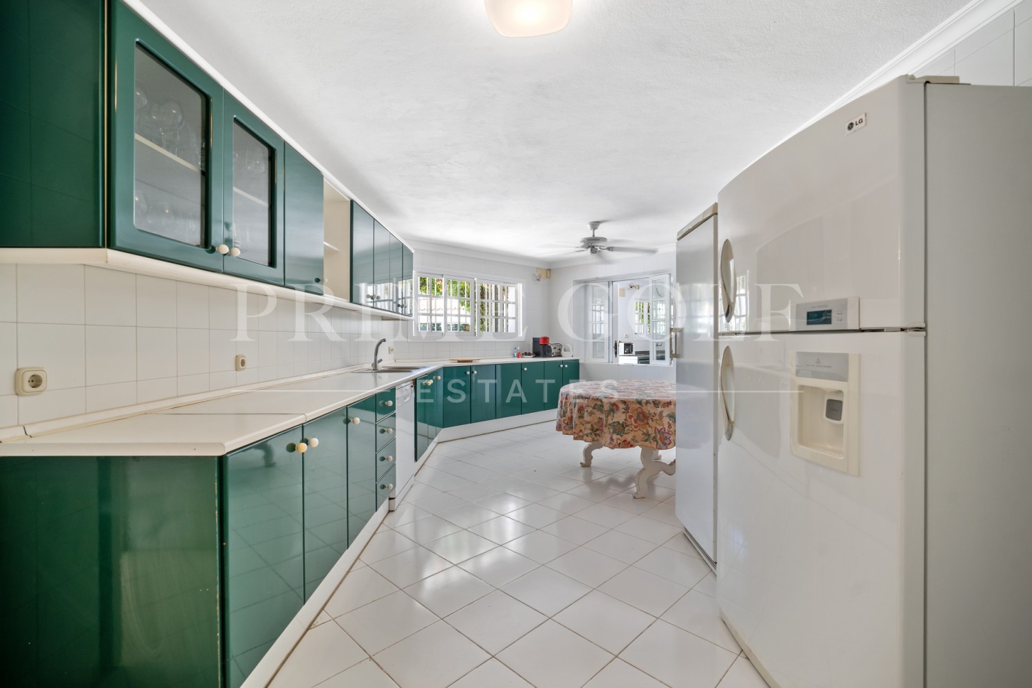 An excellent investment opportunity located in Guadalmina Baja, just five minutes from the beach! This property is set on a large plot of 4100m2 and has the possibility to remodel and build another level or divide the plot to construct two or more independent villas. Currently the villa is distributed over one level and consists of a large living room with built in fireplace; dining room; fully fitted kitchen; master suite with lounge area and walk in wardrobe; guest suite; two guest bedrooms; two guest bathrooms; and an independent apartment for service with three bedrooms; two bathrooms; kitchen; living area; and laundry room. The property has well-kept gardens, private swimming pool and a covered BBQ area with outside toilets. Other features include hot and cold air conditioning in the master suite, double garage, double car port, shutters on the windows and fitted wardrobes.