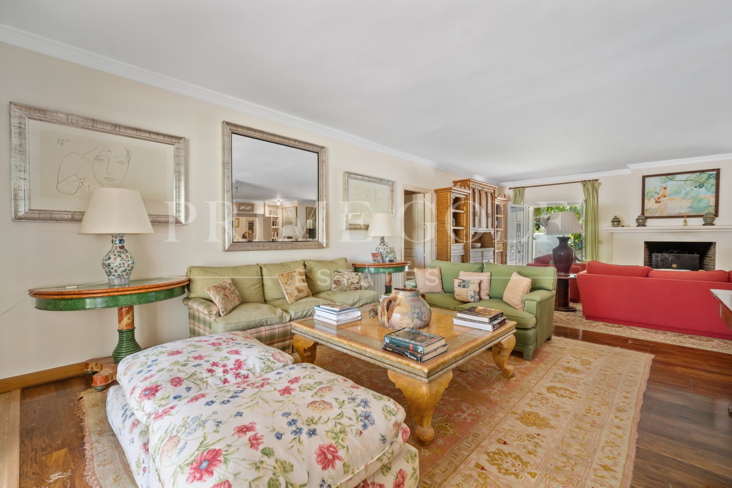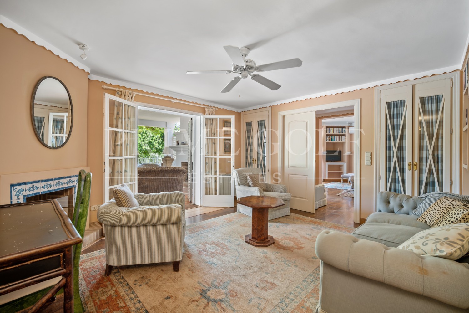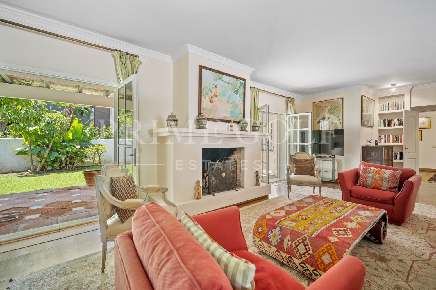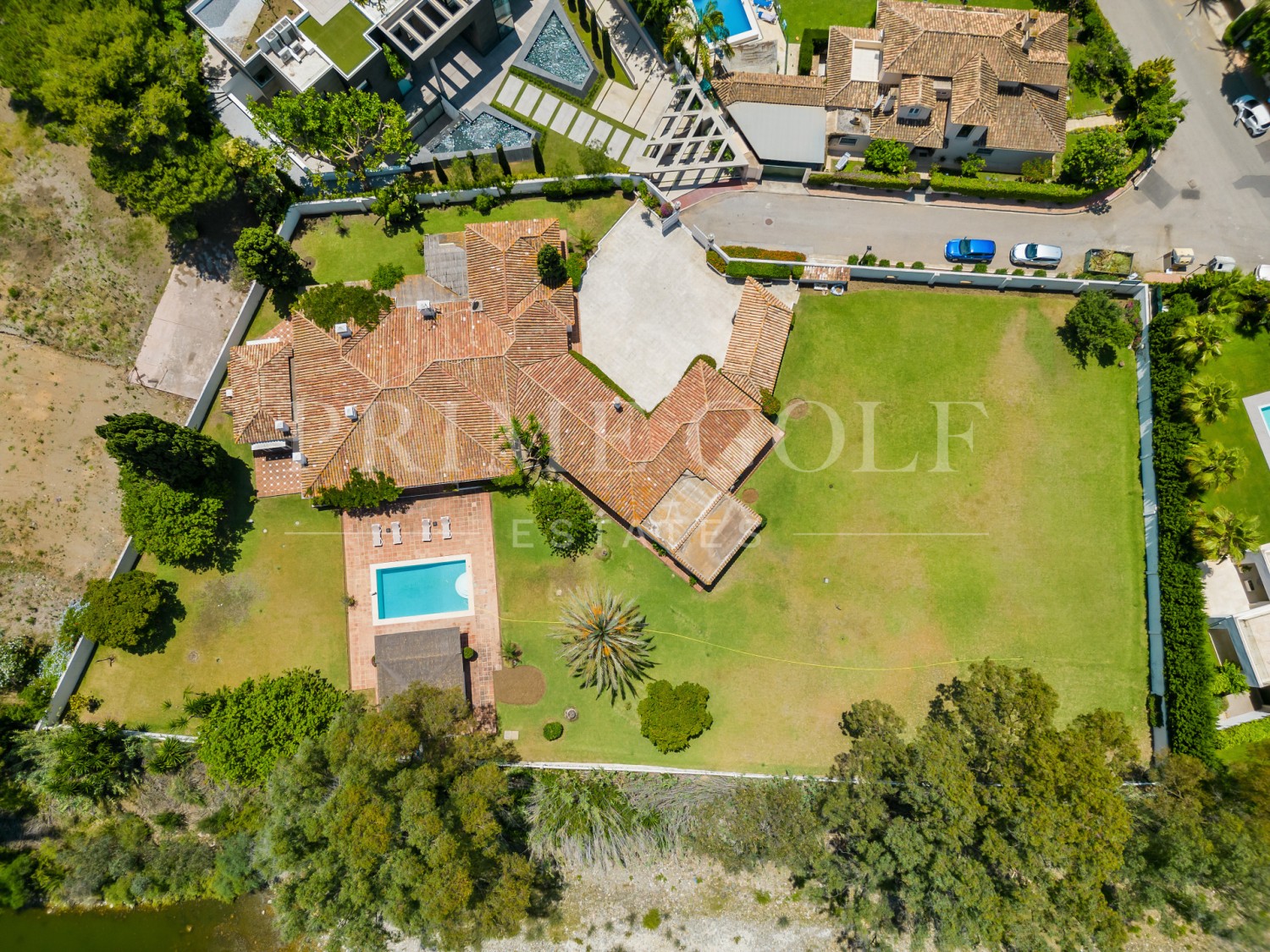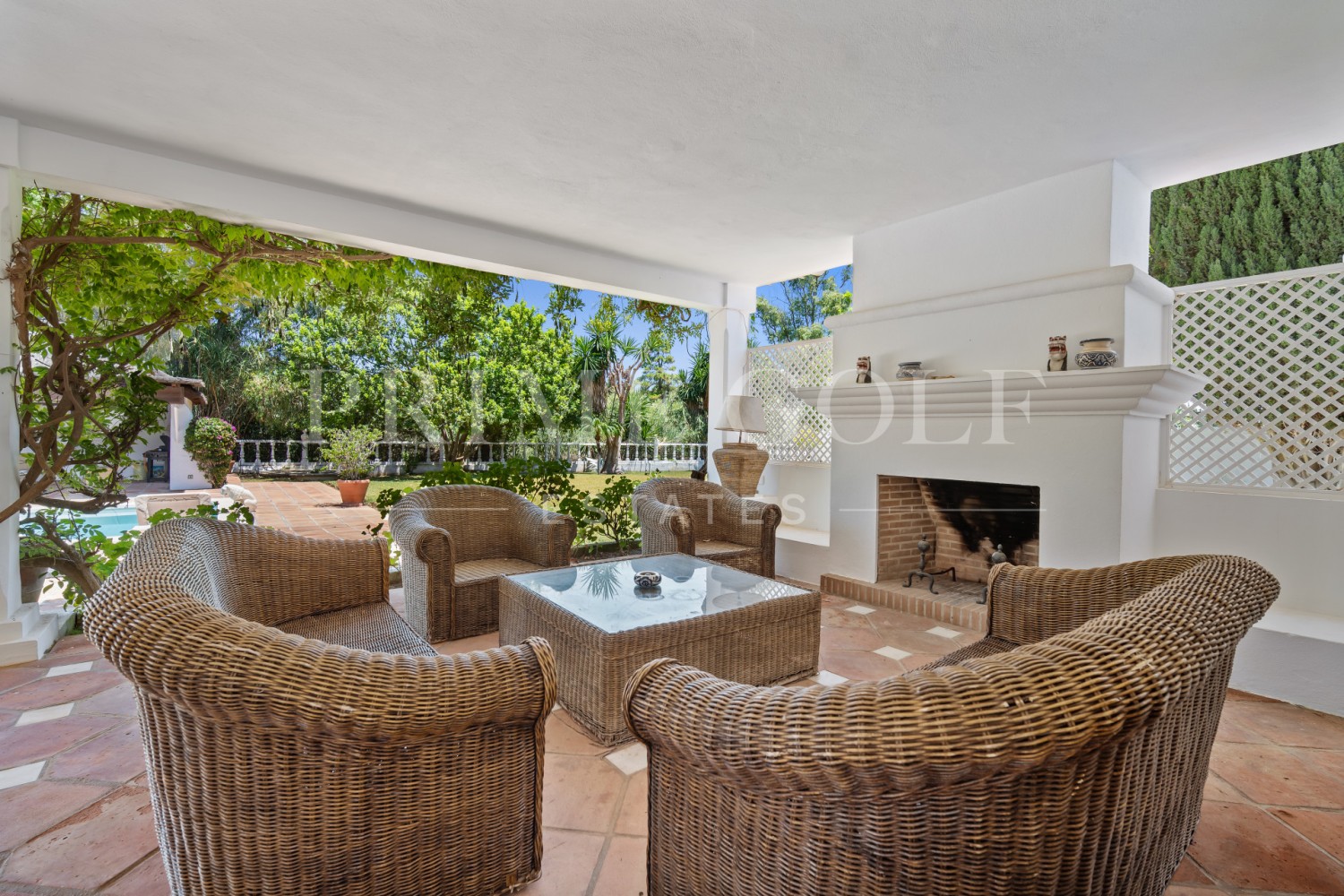 An excellent investment opportunity located in Guadalmina Baja, just five minutes from the beach! This property is set on a large plot of 4100m2 and has the possibility to remodel and build another level or divide the plot to construct two or more independent villas. Currently the villa is distributed over one level and consists of a large living room with built in fireplace; dining room; fully fitted kitchen; master suite with lounge area and walk in wardrobe; guest suite; two guest bedrooms; two guest bathrooms; and an independent apartment for service with three bedrooms; two bathrooms; kitchen; living area; and laundry room. The property has well-kept gardens, private swimming pool and a covered BBQ area with outside toilets. Other features include hot and cold air conditioning in the master suite, double garage, double car port, shutters on the windows and fitted wardrobes.