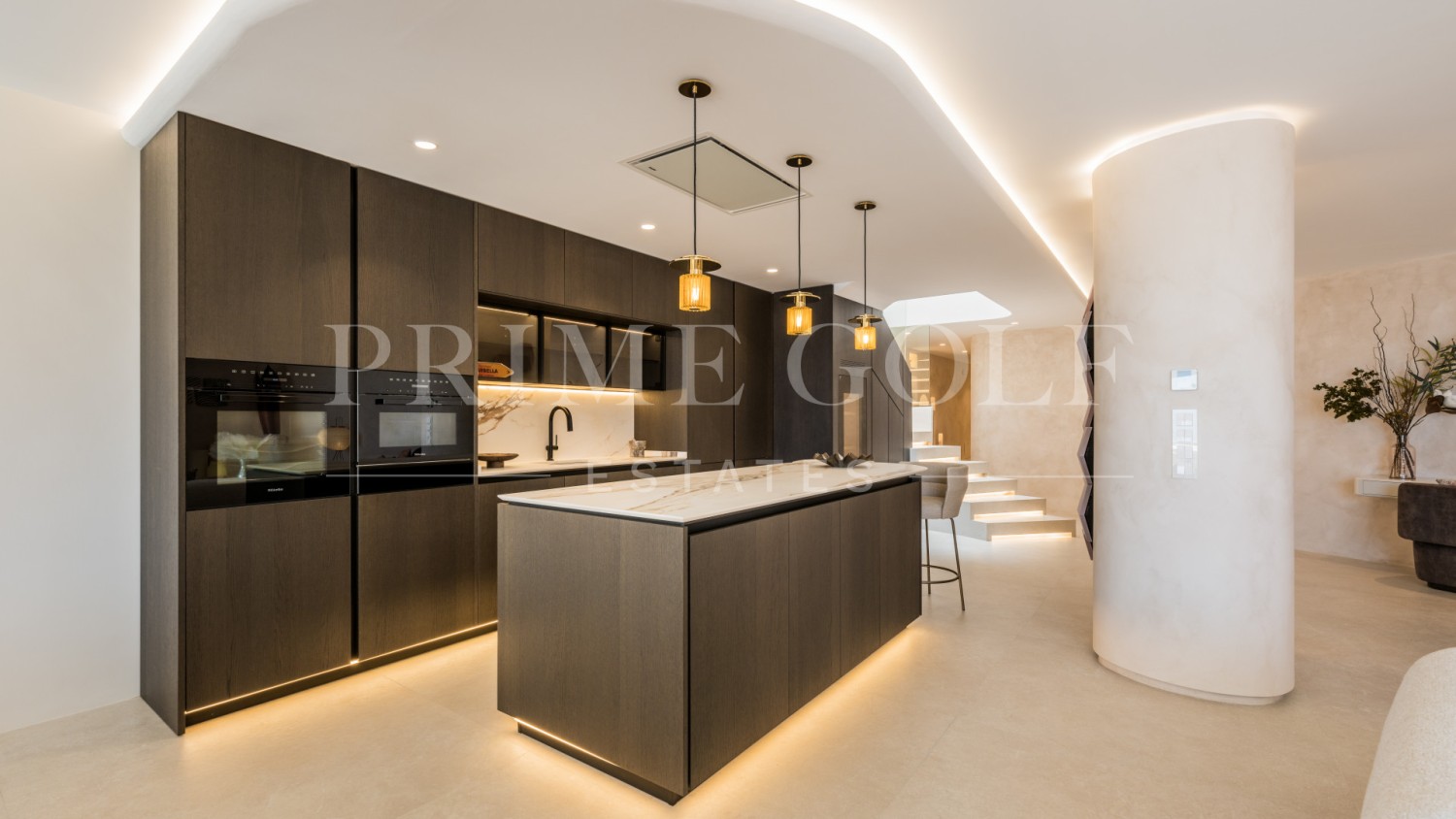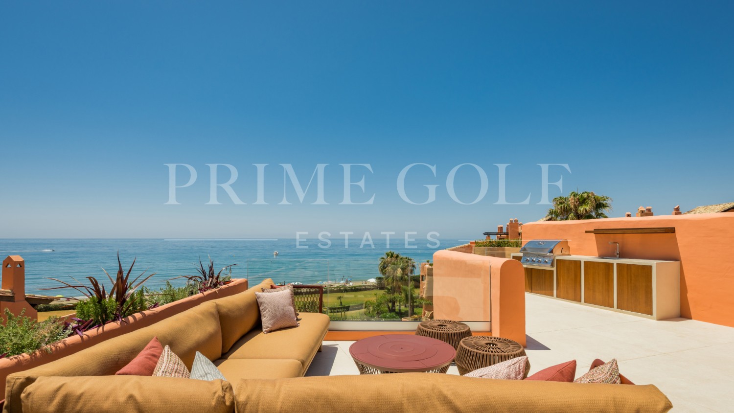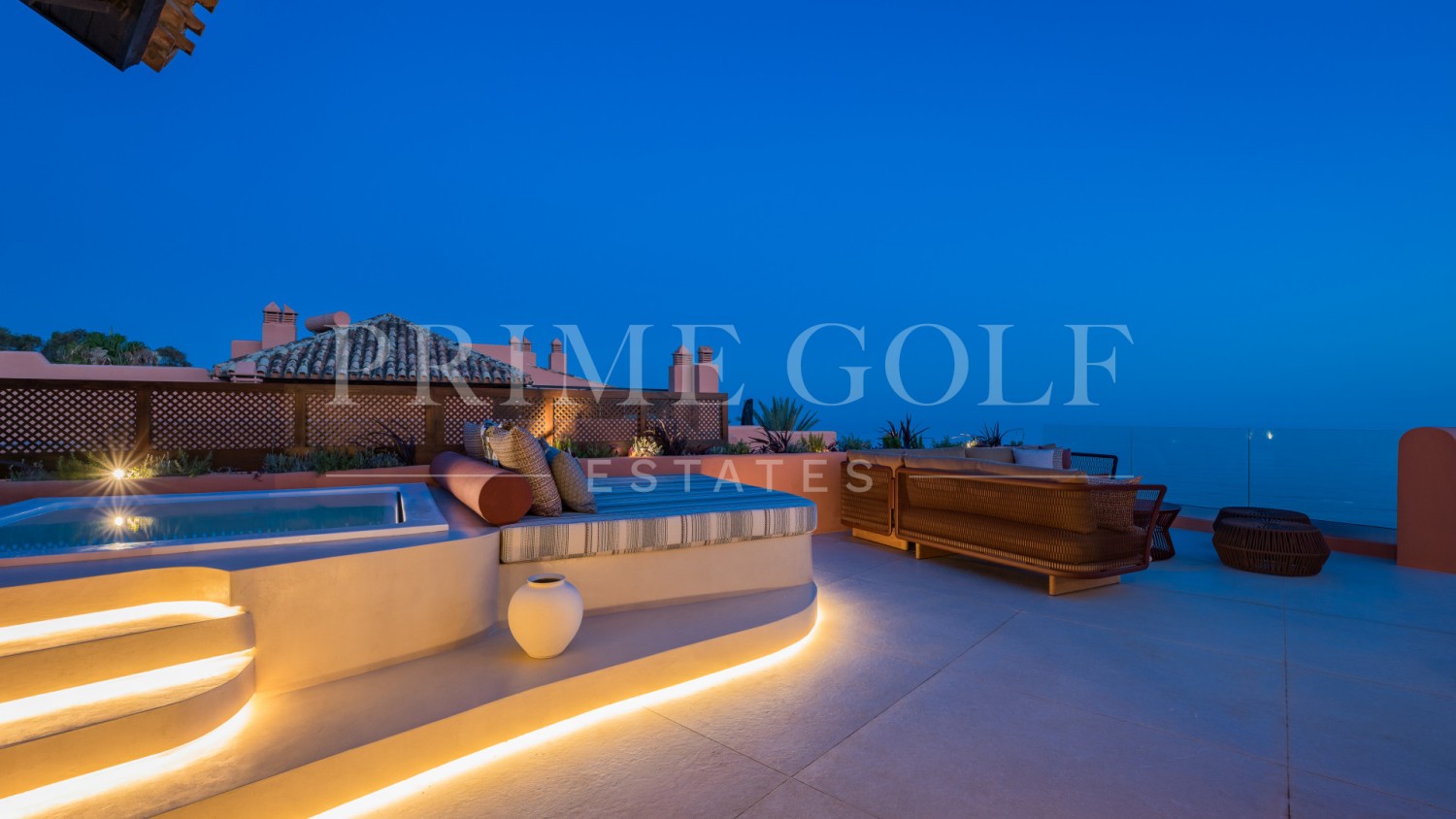 Exquisite four-bedroom, frontline beach duplex penthouse in La Morera, Reserva de Los Monteros. This beachside gated community has 24hr security, communal swimming pool, indoor pool, tropical gardens and direct access to the beach. This luxury property has been finished using high quality materials and elegant furniture. On the entrance level you have an open plan living and dining area with access to a spacious terrace with wonderful sea views; fully fitted open plan kitchen with Miele appliances; three guest suites; guest toilet; and a laundry room. The upper-level leads to the impressive master suite, complete with a walk-in closet and two private terraces. One of the terraces has a sauna and gym and the other gives access to an outdoor kitchen, jacuzzi lounge area and dining area; where you can relax and enjoy the amazing views. Other features include hot and cold air conditioning, underfloor heating, two private parking spaces and a storeroom.