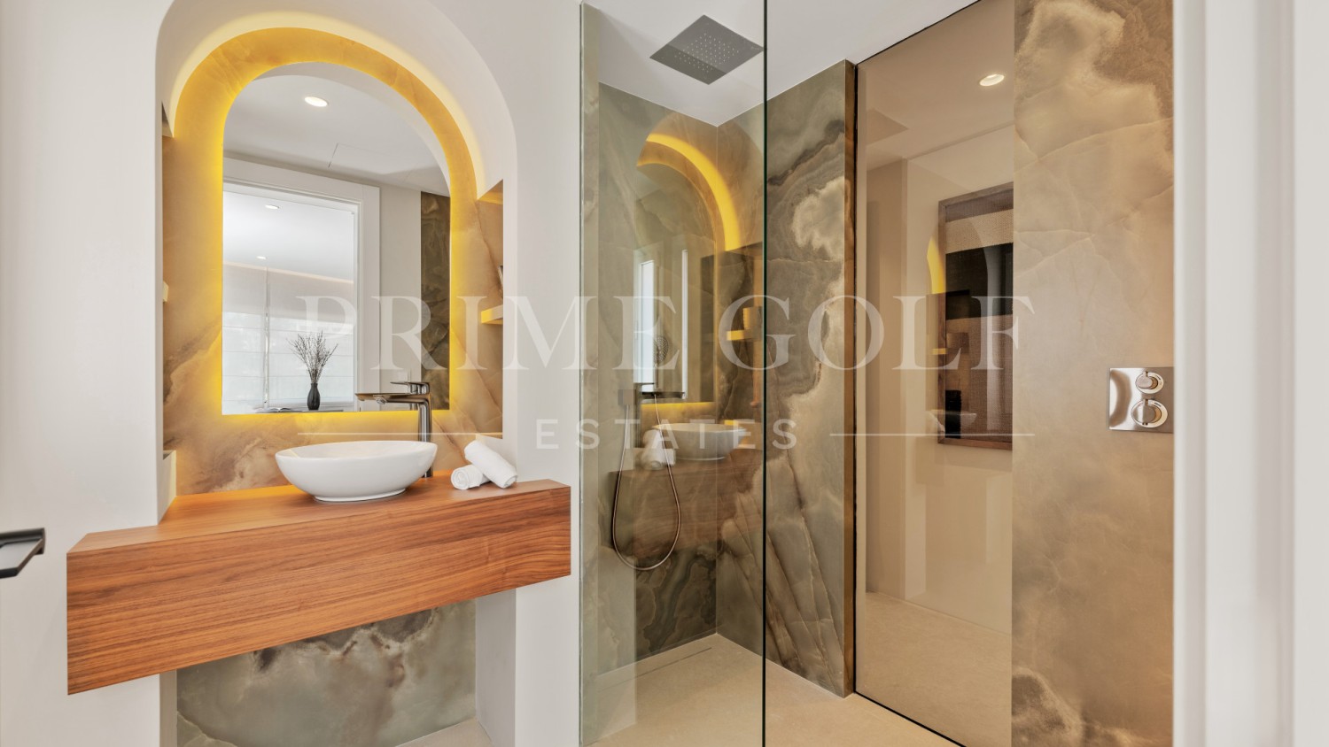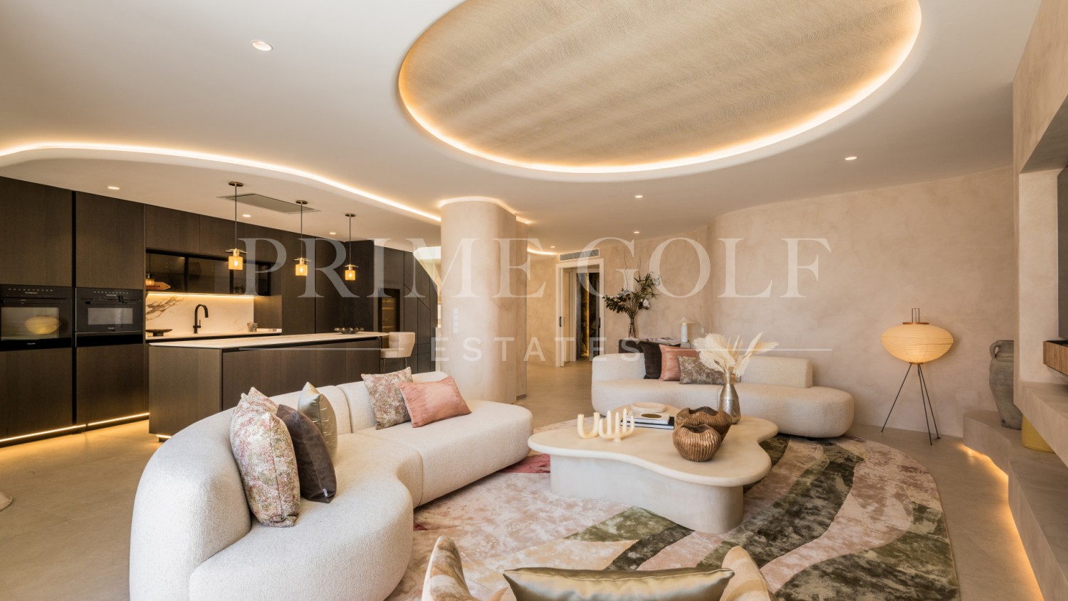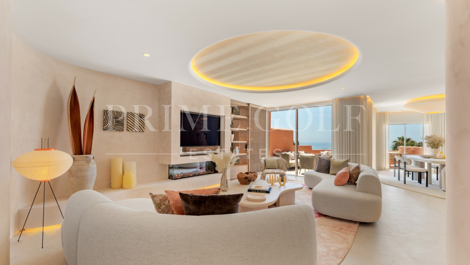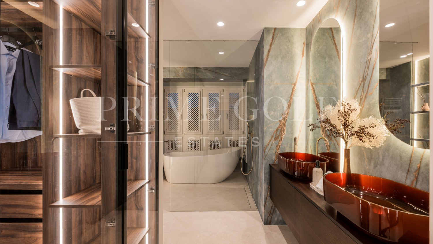 Exquisite four-bedroom, frontline beach duplex penthouse in La Morera, Reserva de Los Monteros. This beachside gated community has 24hr security, communal swimming pool, indoor pool, tropical gardens and direct access to the beach. This luxury property has been finished using high quality materials and elegant furniture. On the entrance level you have an open plan living and dining area with access to a spacious terrace with wonderful sea views; fully fitted open plan kitchen with Miele appliances; three guest suites; guest toilet; and a laundry room. The upper-level leads to the impressive master suite, complete with a walk-in closet and two private terraces. One of the terraces has a sauna and gym and the other gives access to an outdoor kitchen, jacuzzi lounge area and dining area; where you can relax and enjoy the amazing views. Other features include hot and cold air conditioning, underfloor heating, two private parking spaces and a storeroom.