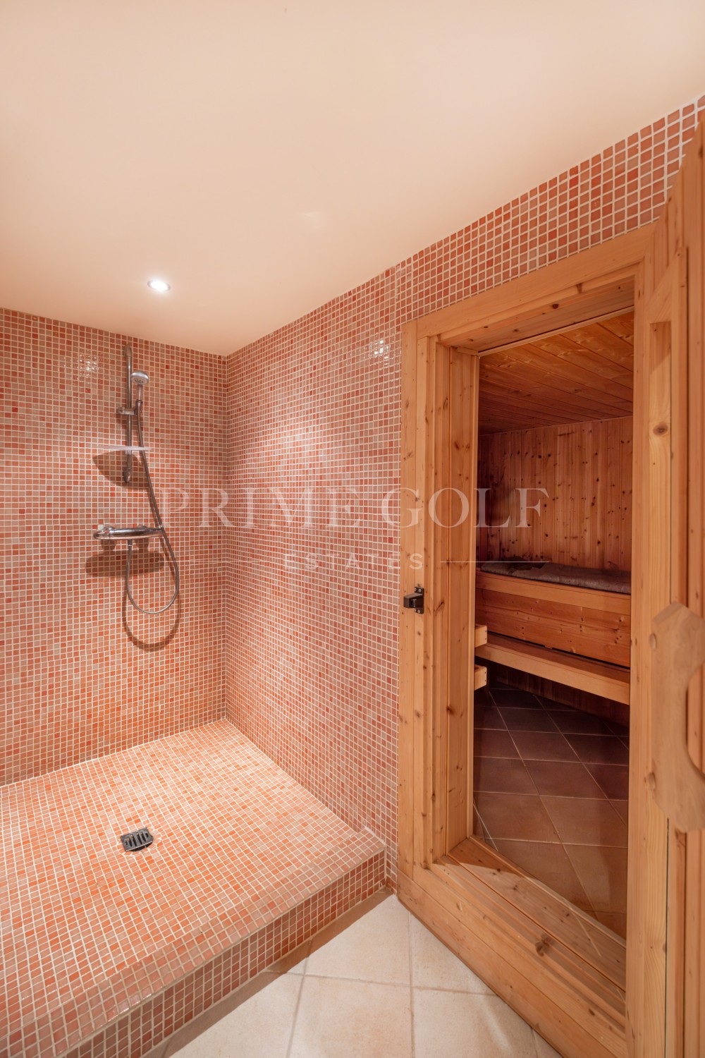 The property was originally built in 1986 and underwent renovations in 2002. The layout includes a spacious living area with seamless access to outdoor terraces, a well-appointed kitchen, and an office. The private garden and pool offer the perfect setting for outdoor relaxation, while a private garage with two parking spaces ensures convenience.