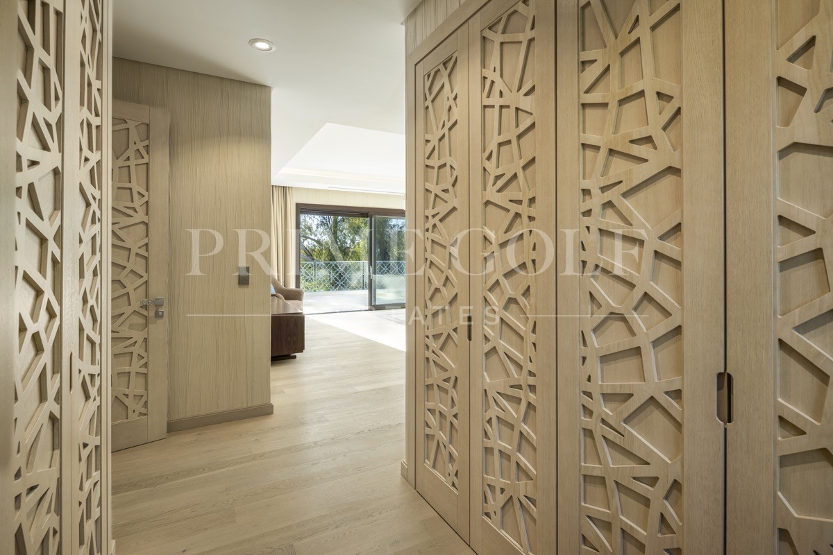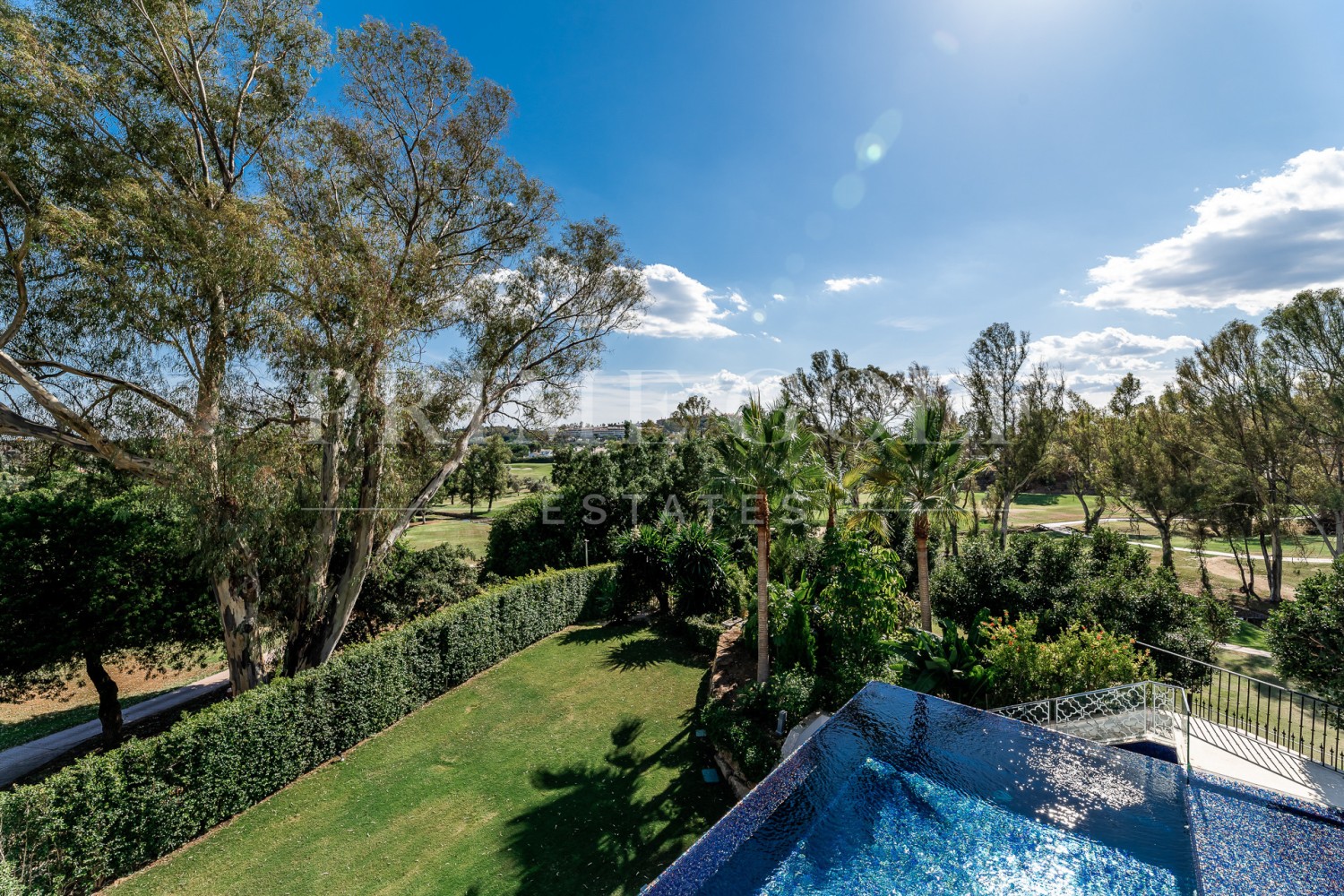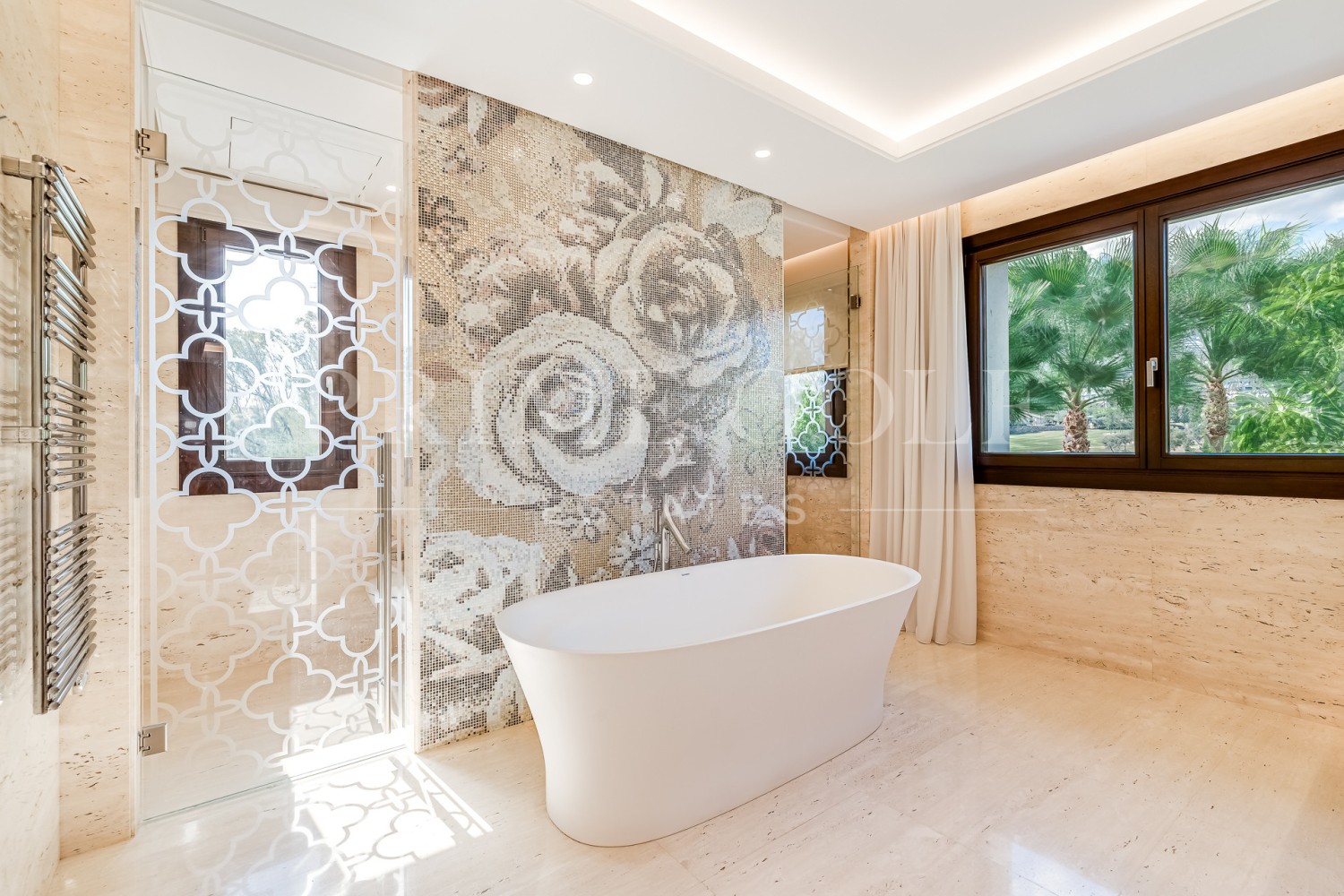 Villa Maria in Marbella's Nueva Andalucia is a luxurious blend of modern technology and nature. Situated on a Triangular Plot, Front Row Golf from both sides! At the end of a cul-de-sac for premier privacy! Villa Maria was built with no expense spared. It features only the highest quality materials, including cabinetry, doors, windows, and electric shutters throughout, all from the luxury brand Roman Clavero.