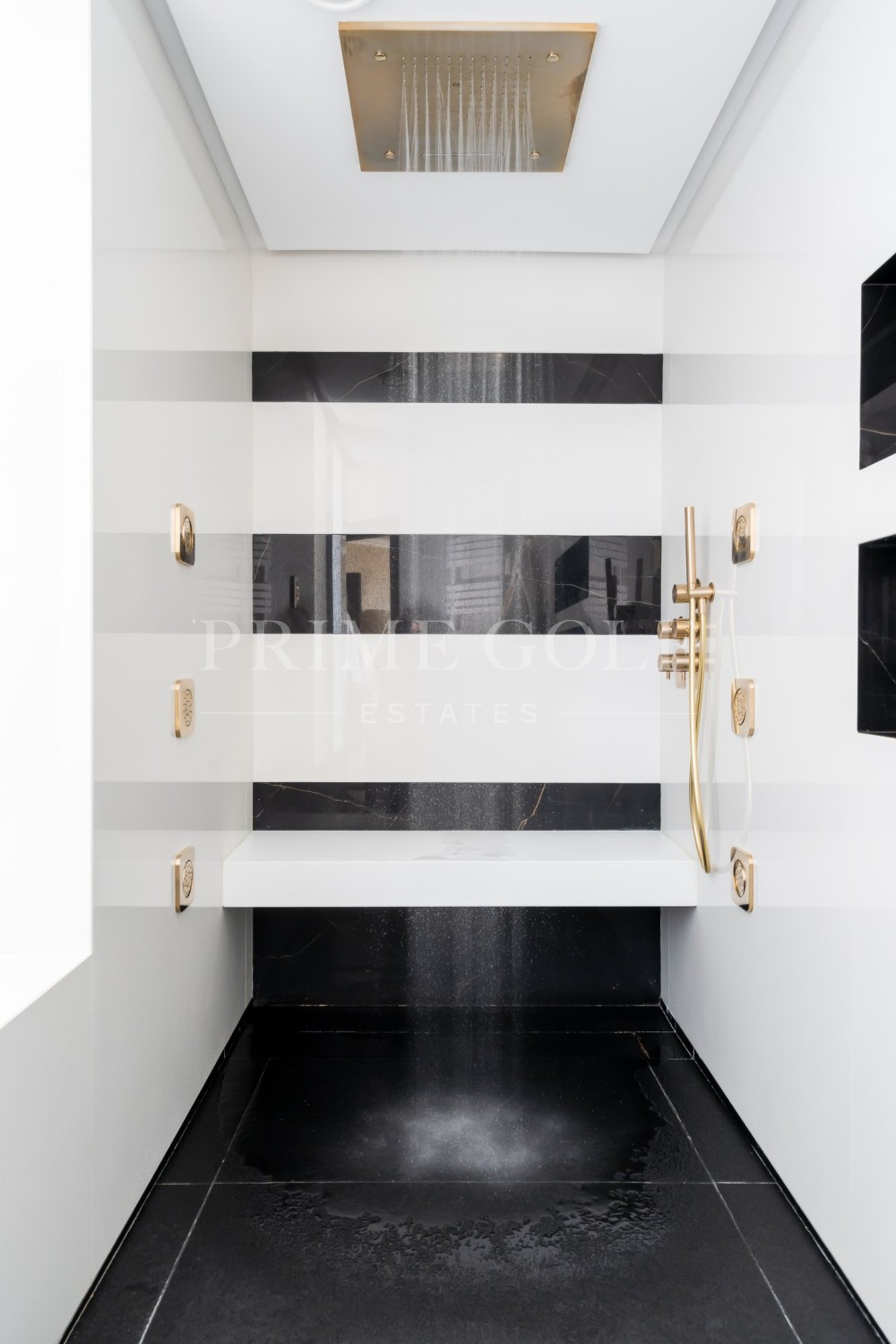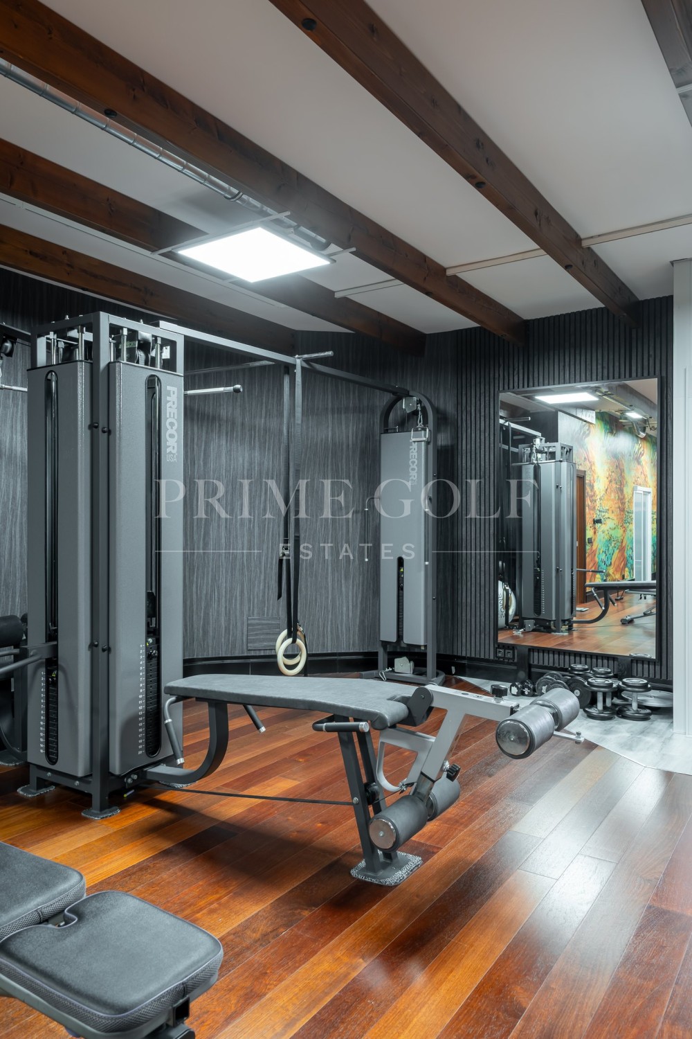 On the ground floor, there are four more bedrooms, each with a door leading straight to the garden and the pool. And there's a Finnish sauna near the pool for relaxation. Plus, there's a gym and a big garage. Down in the basement, there's a cool home theater, a place for massages, a traditional sauna plus an infrared sauna, and one more bedroom with its own bathroom.