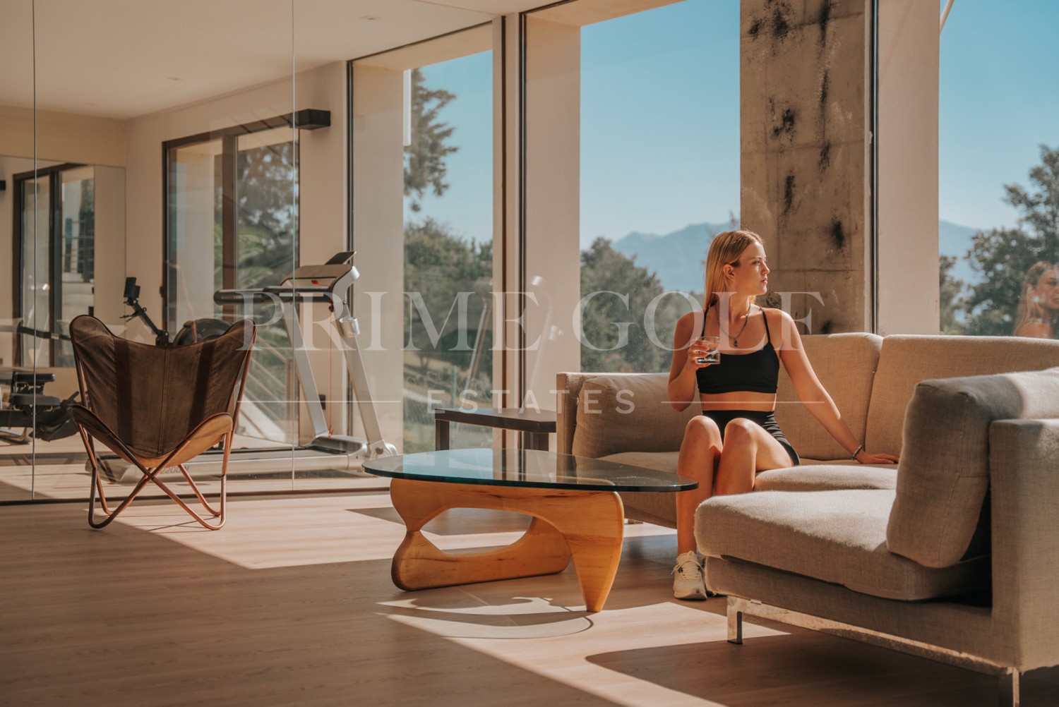 The main level offers spacious living areas, a high ceiling and big windows and doors to enhance the panoramic views. You also find the open plan kitchen with direct access to a terrace with BBQ and panoramic sea views. This level also offers two double bedrooms, one ensuite with panoramic sea views and a full bathroom. On the first floor, you find the main suite with an annexe double bedroom and luxurious bathroom with panoramic views. Another double suite and room that could be used as extra accommodation, gallery, or study room with direct access to the terrace with panoramic views. The ground level features another three ensuite bedrooms, a dedicated service room, a fully equipped gym, a cinema room, and a games room with a bar and bathroom.