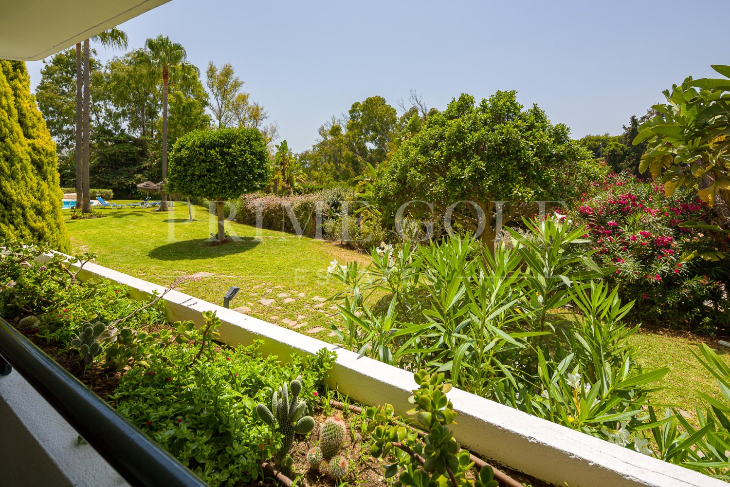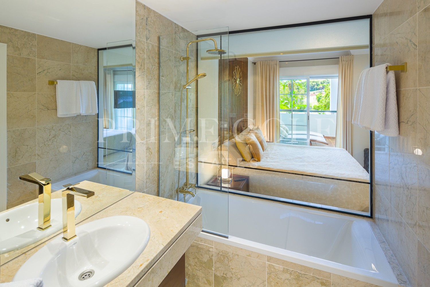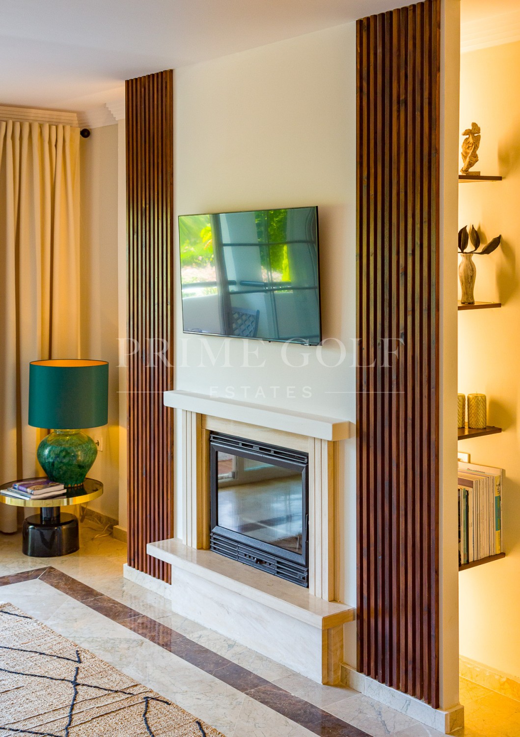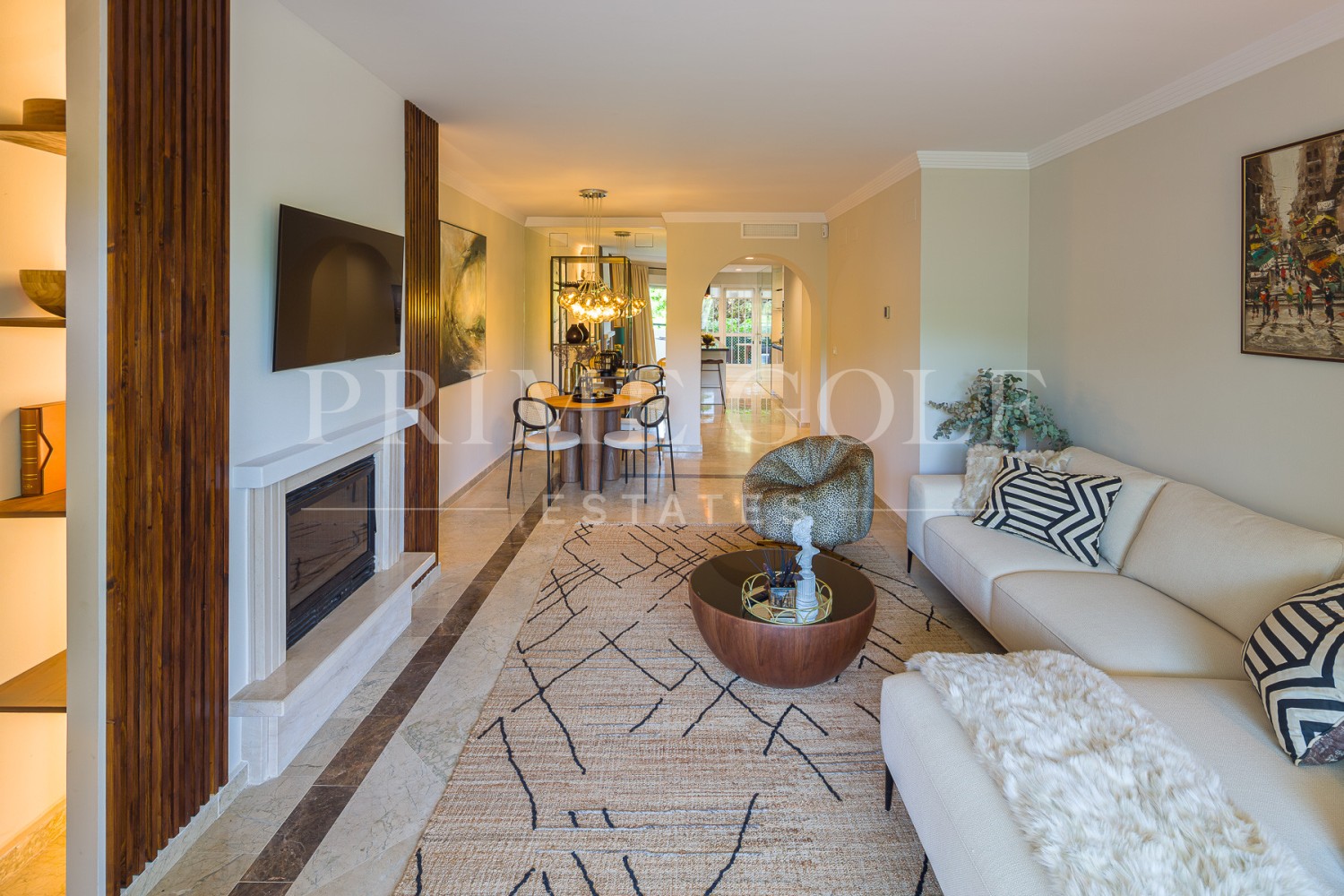 Stunning two bedroom south west facing elevated ground floor apartment in the heart of Marbella's Golden Mile. The apartment is located in a very nice and closed complex with lovely gardens and a large swimming pool. Balcones de Puente Romano is one of the most prestigious urbanizations on the Golden Mile, only a few minutes walk to the beach and the center of Marbella, surrounded by restaurants, shops, supermarkets, schools and all services. This beautifully renovated property consists of an entrance hall; fully fitted kitchen that leads to a private terrace terrace; an open living and dining room with fireplace and access to the terrace; master suite with access to the terrace; and guest suite. Other features include hot and cold air conditioning, fitted wardrobes, private parking space and shutters on the windows.