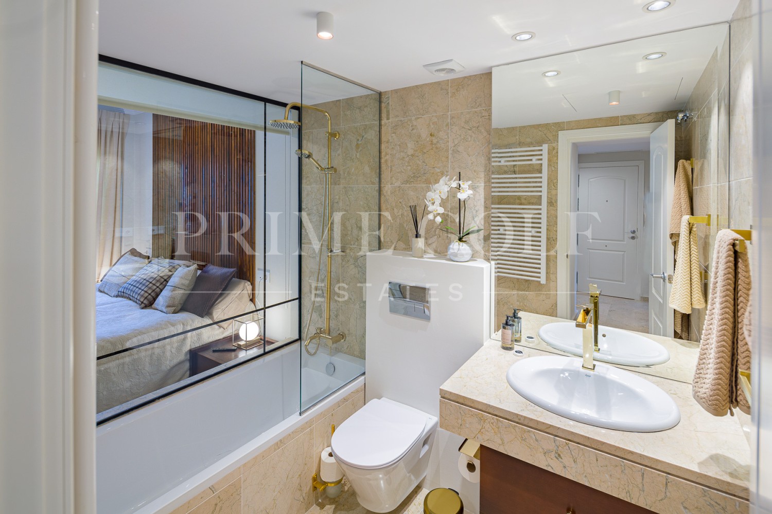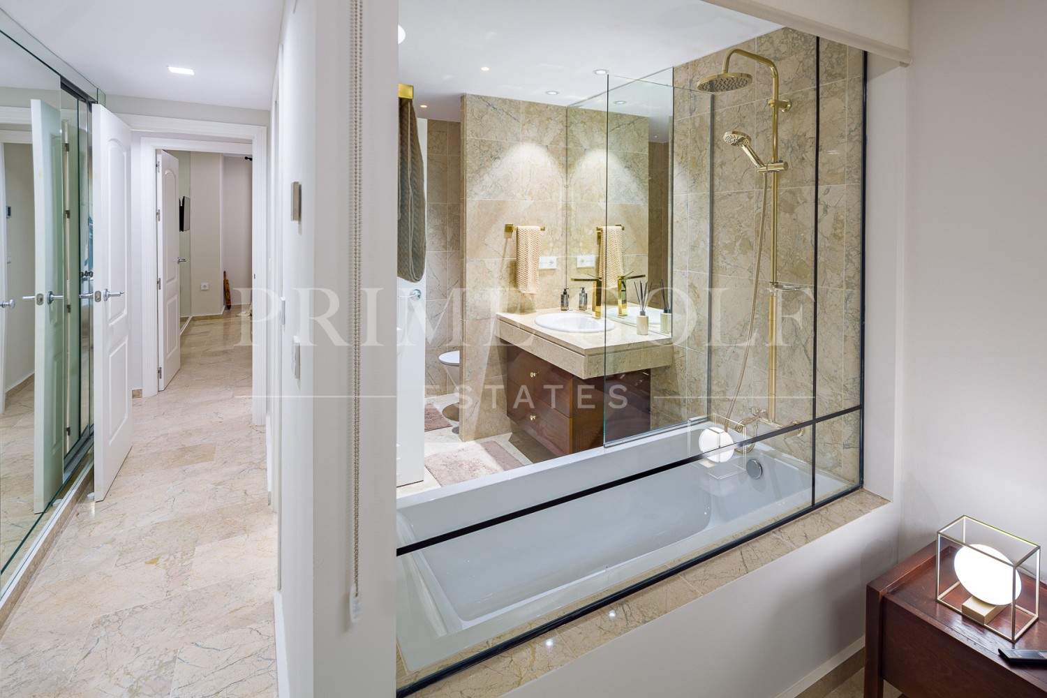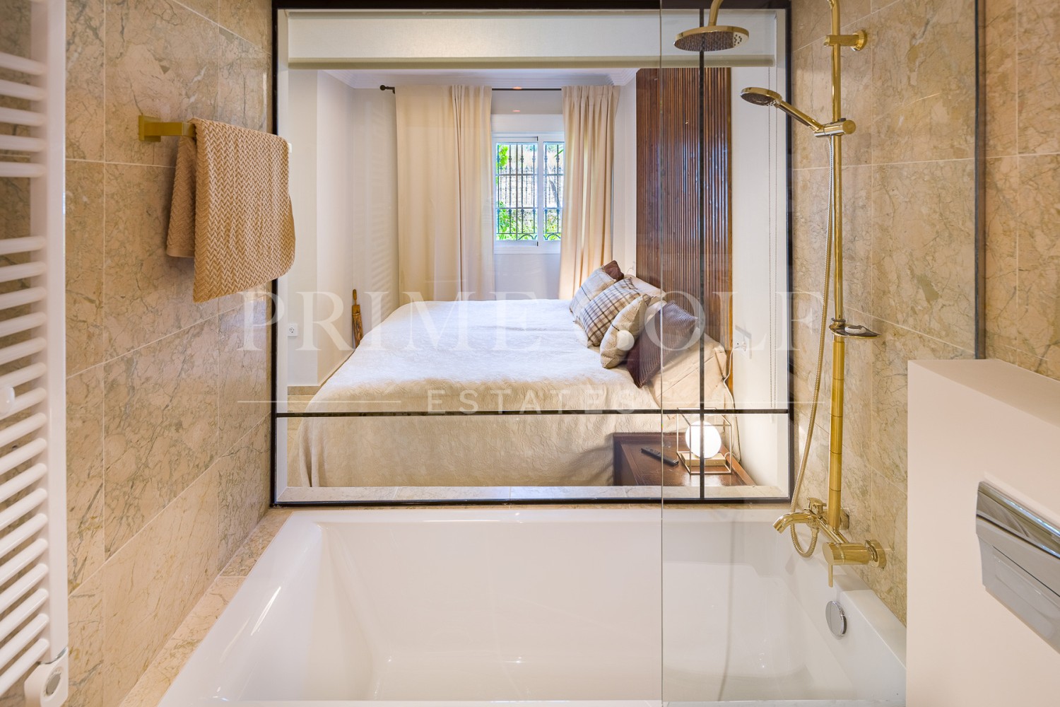 Stunning two bedroom south west facing elevated ground floor apartment in the heart of Marbella's Golden Mile. The apartment is located in a very nice and closed complex with lovely gardens and a large swimming pool. Balcones de Puente Romano is one of the most prestigious urbanizations on the Golden Mile, only a few minutes walk to the beach and the center of Marbella, surrounded by restaurants, shops, supermarkets, schools and all services. This beautifully renovated property consists of an entrance hall; fully fitted kitchen that leads to a private terrace terrace; an open living and dining room with fireplace and access to the terrace; master suite with access to the terrace; and guest suite. Other features include hot and cold air conditioning, fitted wardrobes, private parking space and shutters on the windows.