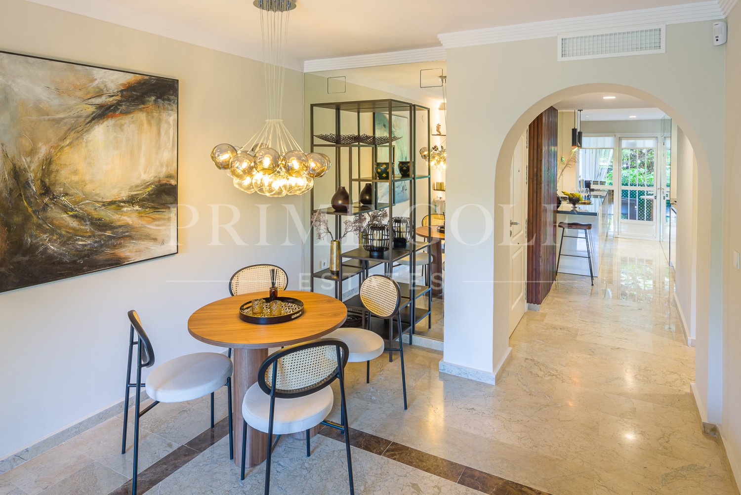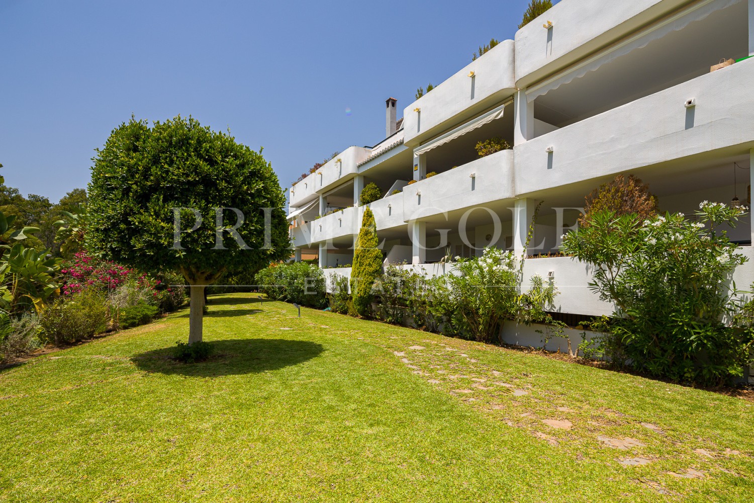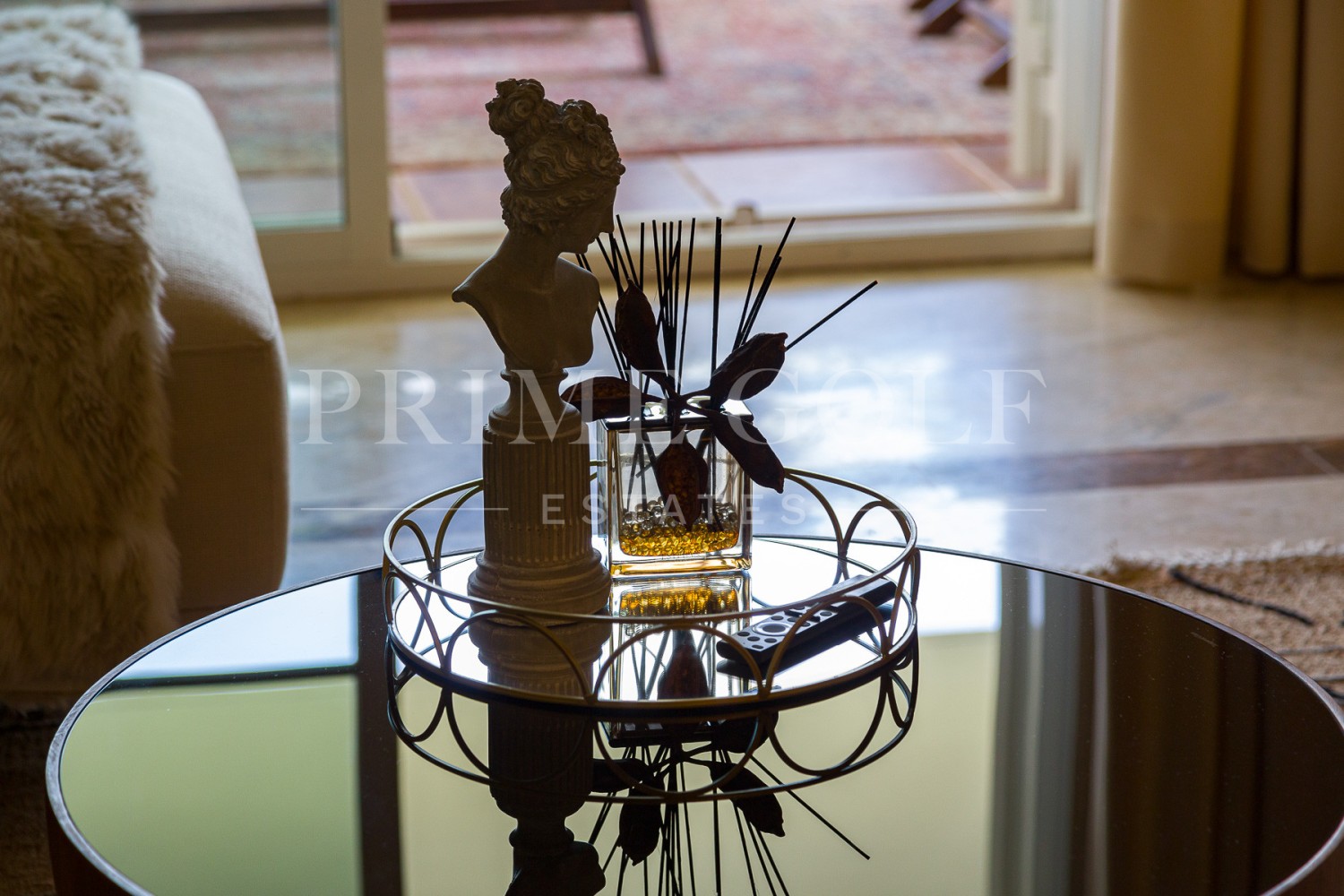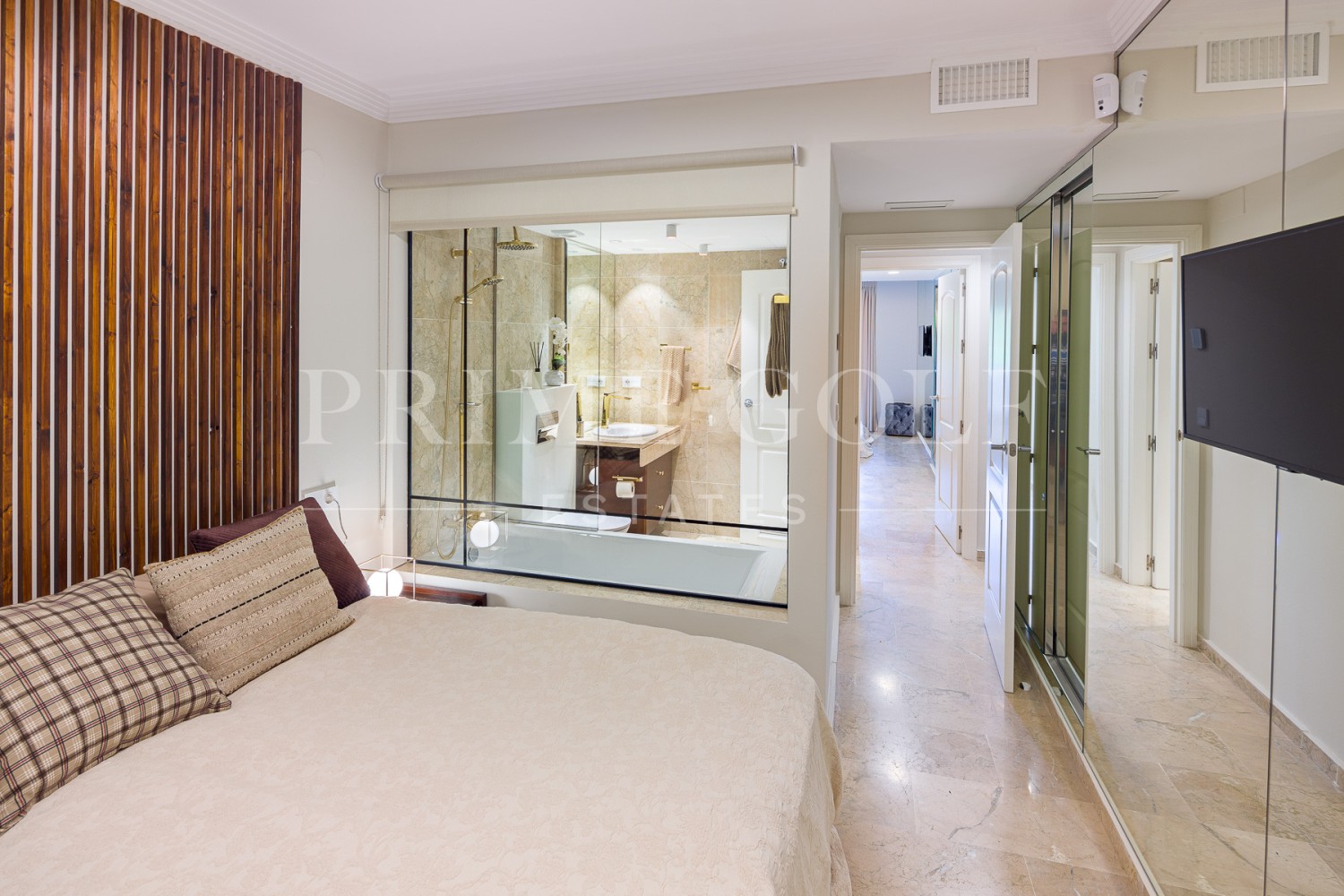 Stunning two bedroom south west facing elevated ground floor apartment in the heart of Marbella's Golden Mile. The apartment is located in a very nice and closed complex with lovely gardens and a large swimming pool. Balcones de Puente Romano is one of the most prestigious urbanizations on the Golden Mile, only a few minutes walk to the beach and the center of Marbella, surrounded by restaurants, shops, supermarkets, schools and all services. This beautifully renovated property consists of an entrance hall; fully fitted kitchen that leads to a private terrace terrace; an open living and dining room with fireplace and access to the terrace; master suite with access to the terrace; and guest suite. Other features include hot and cold air conditioning, fitted wardrobes, private parking space and shutters on the windows.