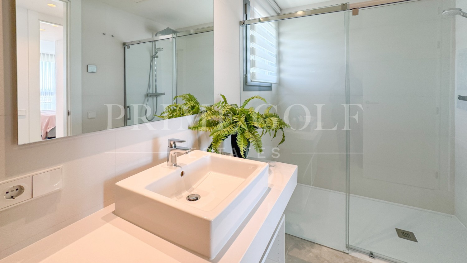 The west-facing penthouse on the Santa Clara Golf Course will fascinate you with picturesque sunsets. The floor-to-ceiling panoramic windows of the open-plan living room with dining area and fully equipped kitchen offer you fantastic views of the mountains and the Mediterranean Sea from every angle. The 29m2 large terrace in front of the living room seamlessly combines the indoor and outdoor areas, creating an extremely spacious and airy living environment. On the same level is the master bedroom with sea views and bathroom en suite with bathtub and shower as well as a dressing area. There are also two further bedrooms that share a family bathroom with spacious shower and a guest toilet. The highlight is the magnificent 110 m2 roof terrace with panoramic views, which gives you plenty of scope for social events with your family and friends.