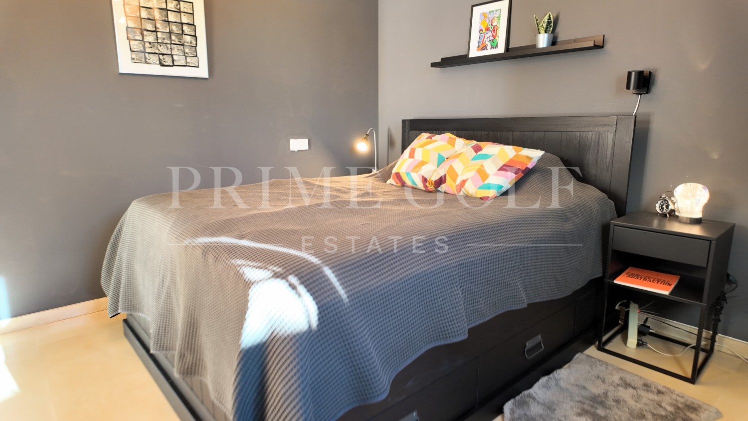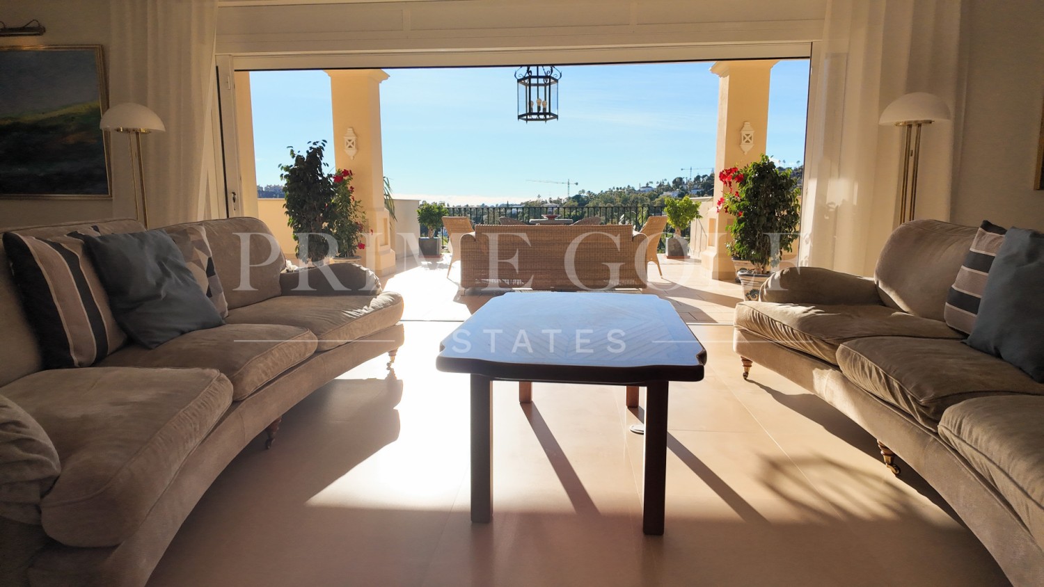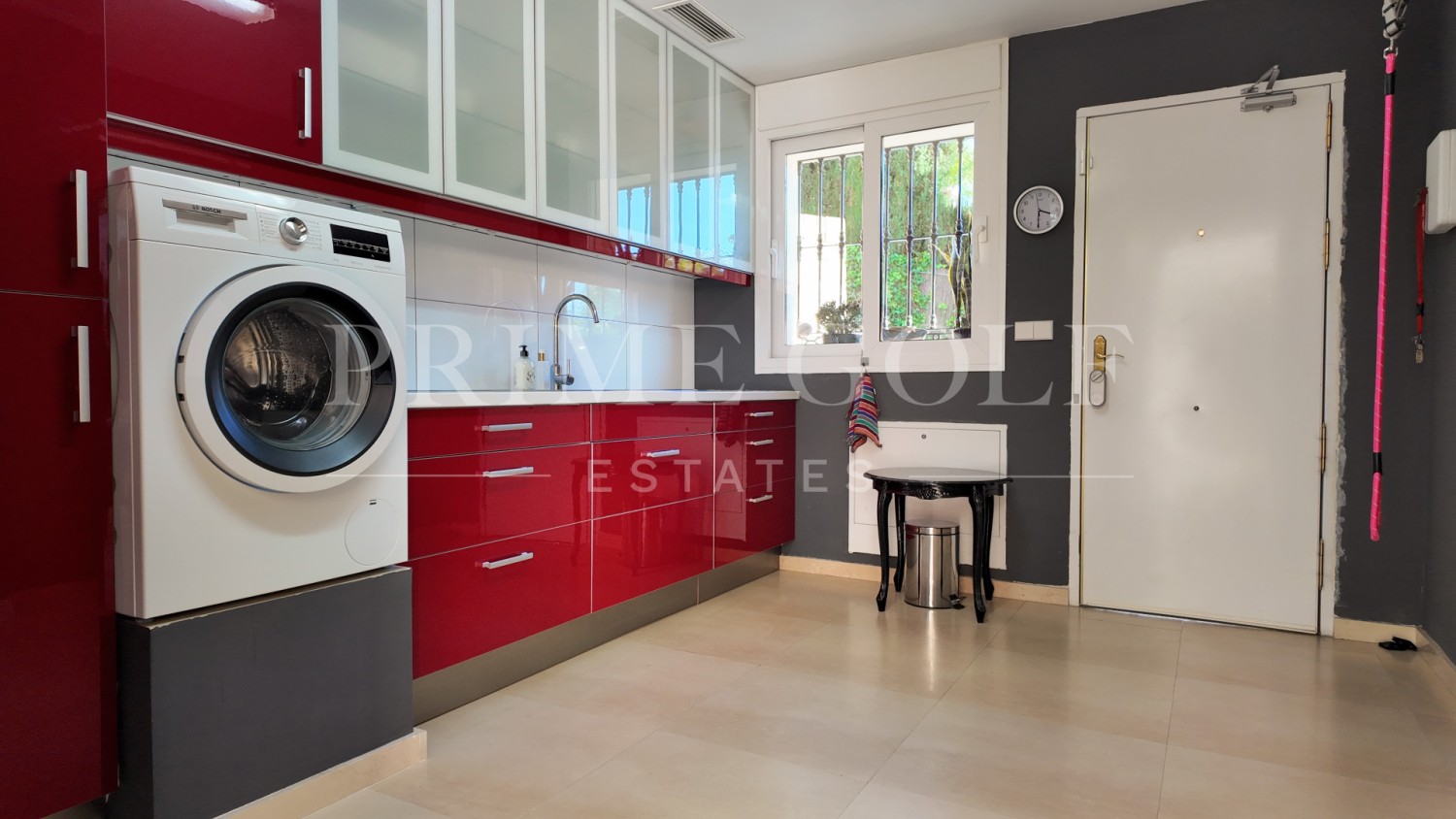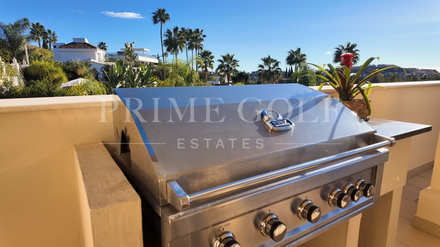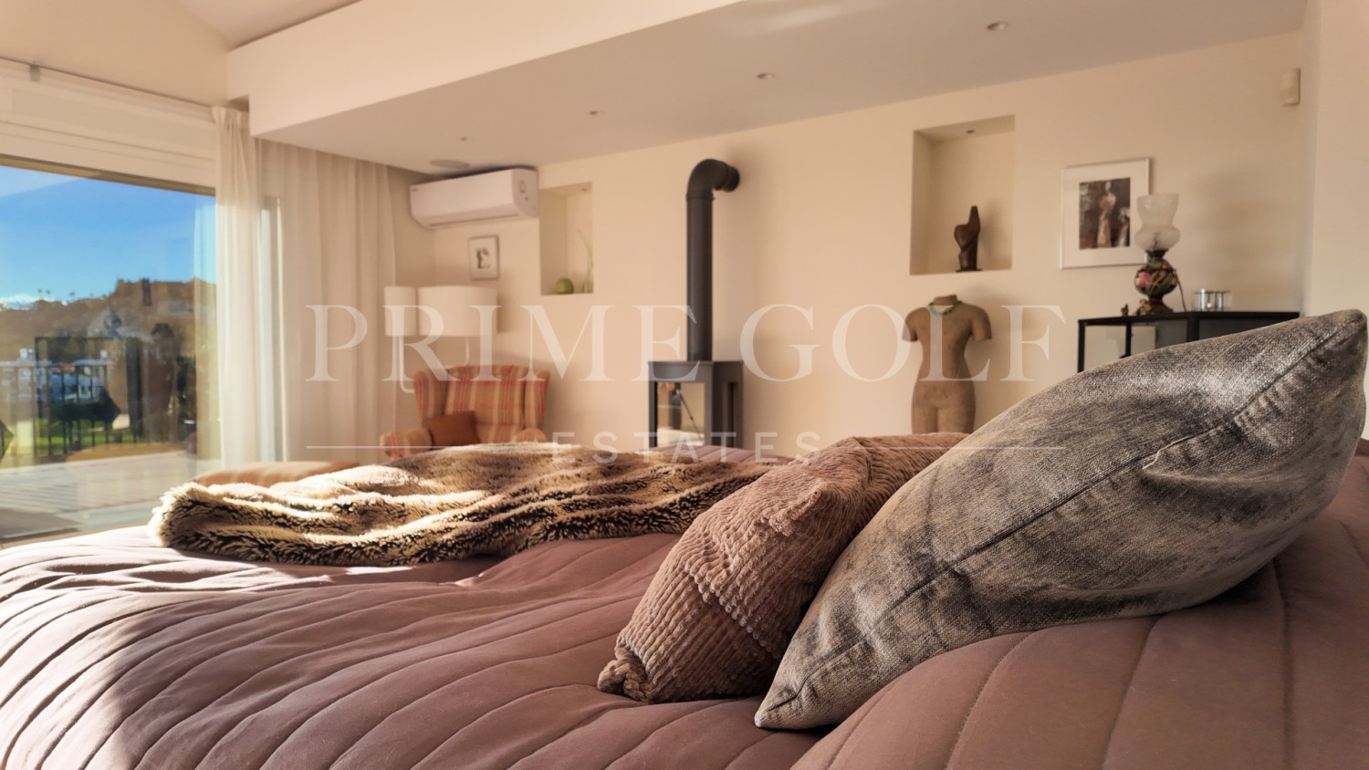 As you walk up the staircase and on to the landing you enter the second bedroom with en-suite bathroom. On the same level sits the 42m2 master suite with a walk in wardrobe, en-suite bathroom and another large terrace. The bathroom is light and airy with his and her sinks, large sunken bath and walk in shower. The bedroom faces out to a 119m2 terrace, here you have views to the golf and mountain range including the famous La Concha at the back of the house.