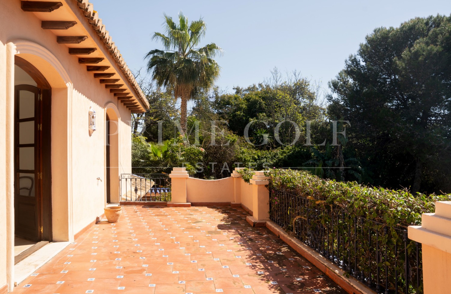 The villa boasts a bright and spacious living room with a fireplace, seamlessly connecting to a private terrace and mature gardens. A fully fitted kitchen provides modern convenience, while an office room adds flexibility for work or study. Large glass doors and a balcony allow for plenty of natural light, offering partial sea views. The property includes both covered and uncovered terraces, perfect for outdoor relaxation.