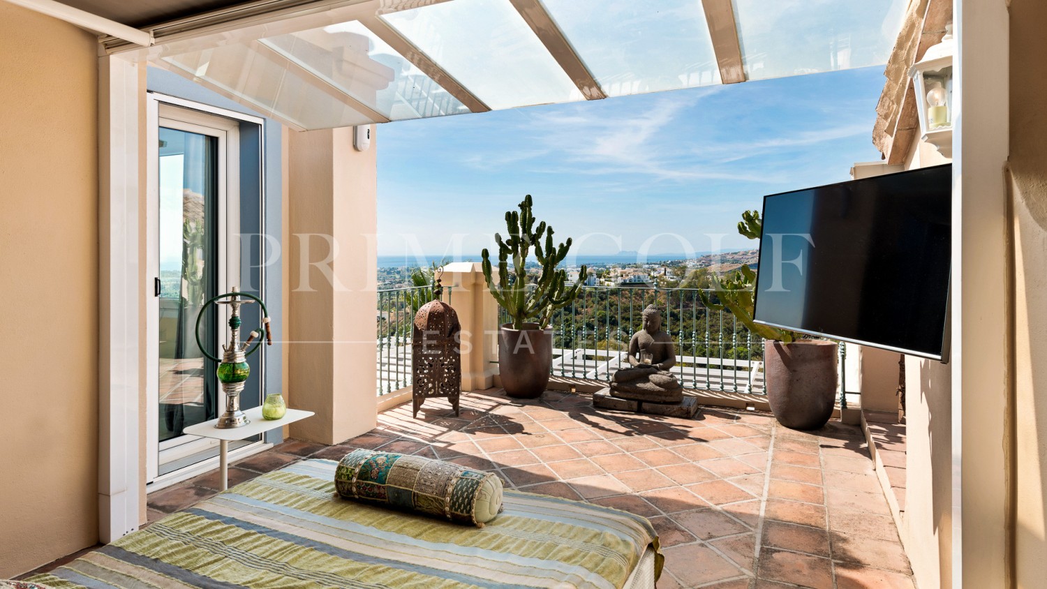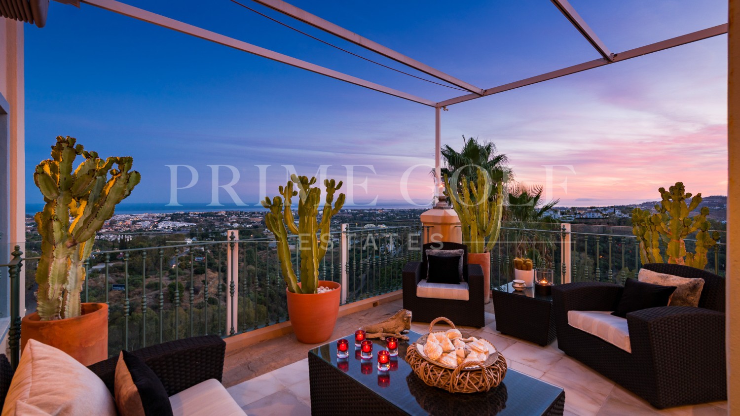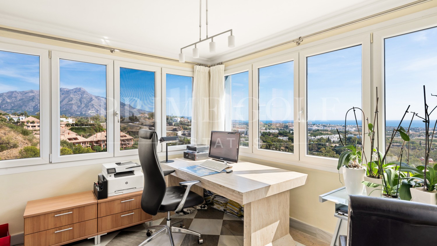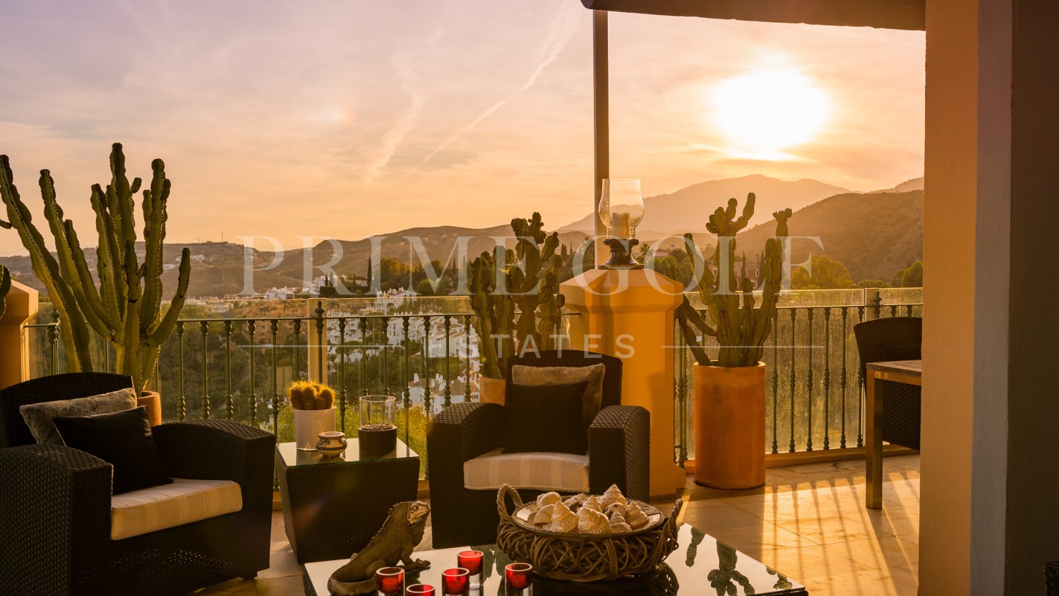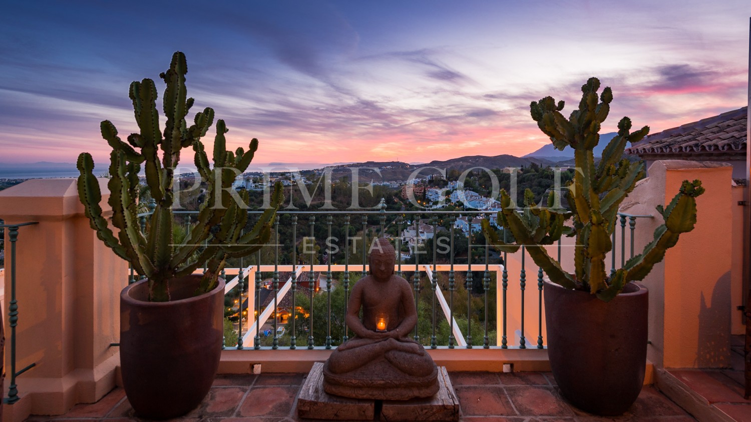 This beautiful penthouse sits atop an elevated position on the edge of a cliff that provides the home with mouth-watering sea and mountain views that stretch beyond Gibraltar and the African coastline. Known as the "penthouse in the sky", the property showcases a perfect blend of traditional Mediterranean architecture with modern design elements and upgrades and the result is a home of exceptional comfort and beauty. Its curving layout allows natural light to liven up the interiors while the lush backdrop of sea and mountains provide an immediate sensation of exclusivity and luxury. Entering the home on its main level there is an entry hall that leads into all the living quarters on this floor. Straight ahead there is a well-appointed living room with a dining area and a modern, upgraded kitchen ideally laid out in a spacious open plan. The large windows allow the beautiful views to be admired from inside the home. There are two en-suite guest rooms on this level in addition to a home office that can also be used as a bedroom. Directly outside is the main terrace that provides ample space for dining outdoors and enjoying the mouth-watering views. Upstairs there are two more en-suite bedrooms including the spectacular master retreat. This luxurious room boasts access to two terraces, a walk-in dressing room and a luxury bathroom that also benefits from the amazing views of the surroundings. The upstairs terrace also features a sauna and is the perfect place to enjoy the sunsets each evening. Being located in Monte Halcones, the property is protected with 24h gated security. The low-density community features beautifully landscaped gardens and a spectacular pool area offering lots of space to take the sun during the warmer months. The community has a shopping centre with a selection of shops and restaurants within walking distance. The beaches of Guadalmina Baja can be reached in 5 minutes by car, and just 10 minutes to Estepona or Marbella centres. For rentals, the property is rented partially furnished, requiring living room furnishings. There are several top golf courses in the area, and Malaga airport is 45 minutes away.