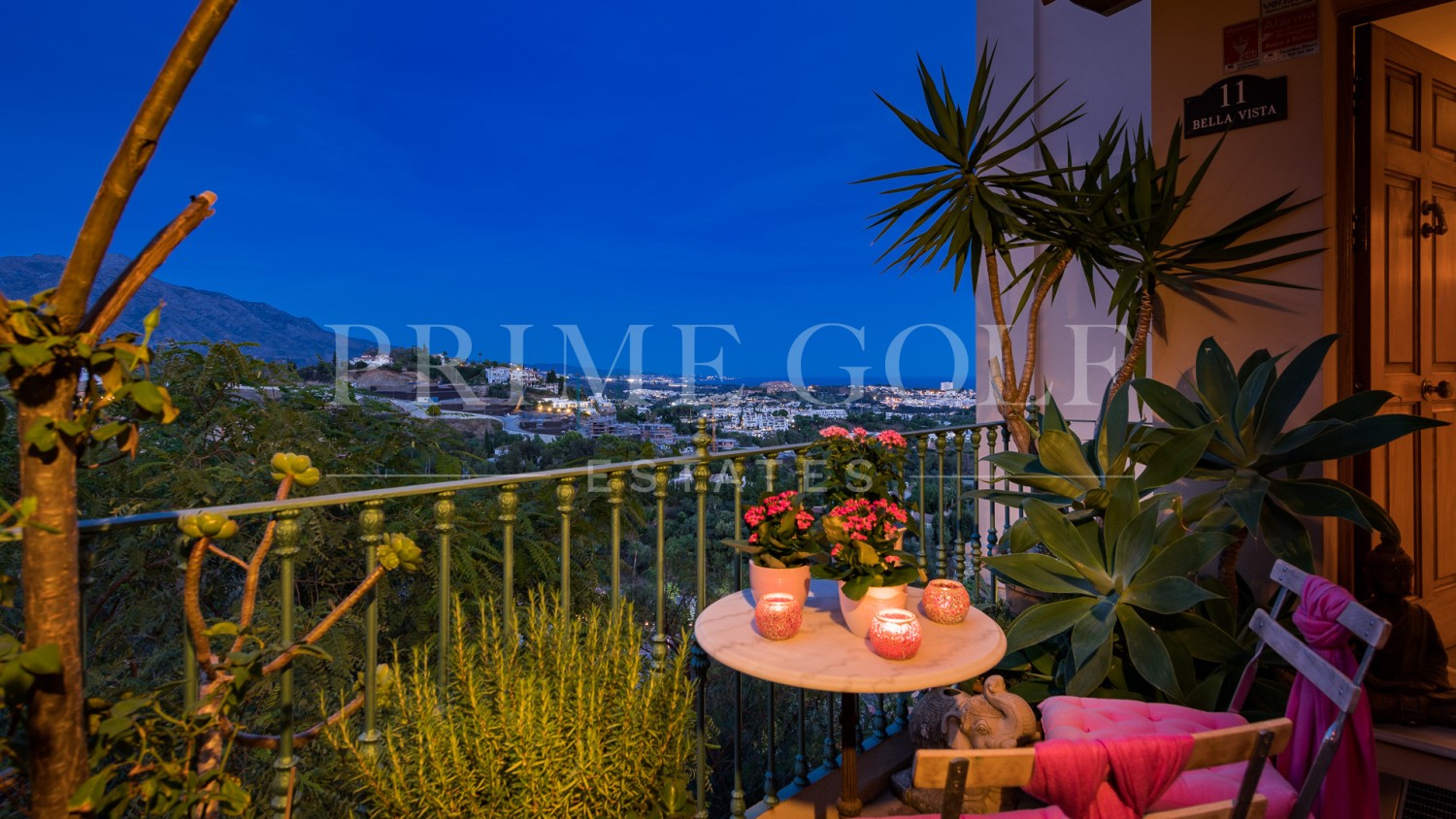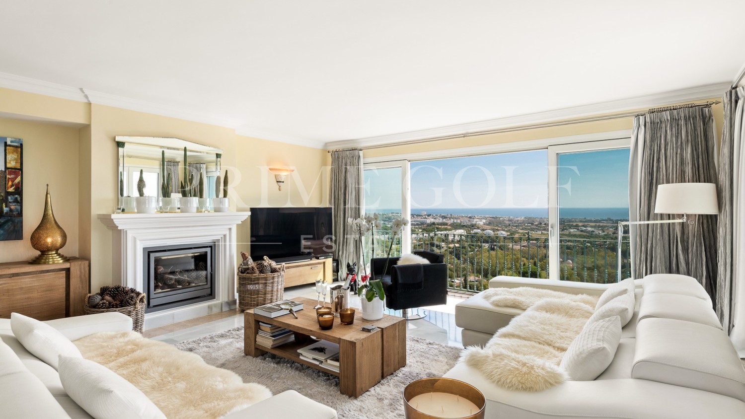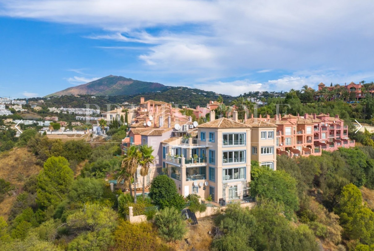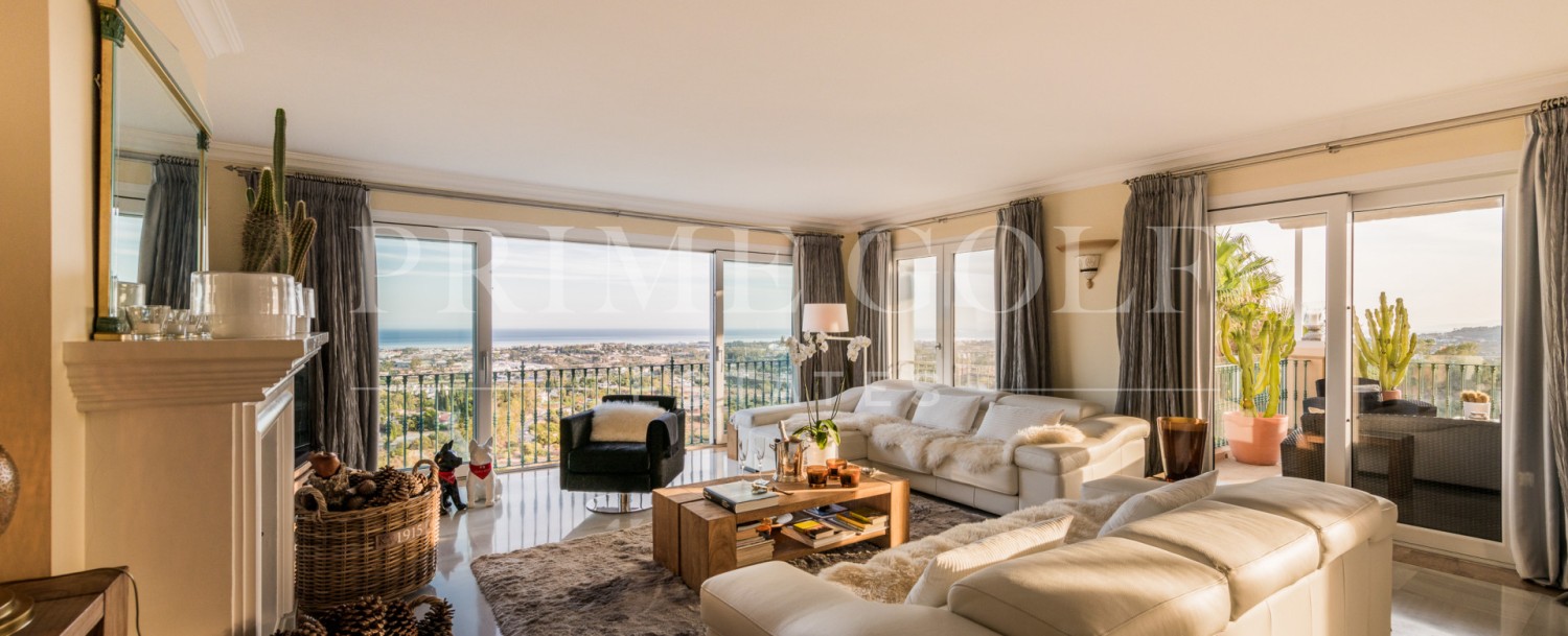 This beautiful penthouse sits atop an elevated position on the edge of a cliff that provides the home with mouth-watering sea and mountain views that stretch beyond Gibraltar and the African coastline. Known as the "penthouse in the sky", the property showcases a perfect blend of traditional Mediterranean architecture with modern design elements and upgrades and the result is a home of exceptional comfort and beauty. Its curving layout allows natural light to liven up the interiors while the lush backdrop of sea and mountains provide an immediate sensation of exclusivity and luxury. Entering the home on its main level there is an entry hall that leads into all the living quarters on this floor. Straight ahead there is a well-appointed living room with a dining area and a modern, upgraded kitchen ideally laid out in a spacious open plan. The large windows allow the beautiful views to be admired from inside the home. There are two en-suite guest rooms on this level in addition to a home office that can also be used as a bedroom. Directly outside is the main terrace that provides ample space for dining outdoors and enjoying the mouth-watering views. Upstairs there are two more en-suite bedrooms including the spectacular master retreat. This luxurious room boasts access to two terraces, a walk-in dressing room and a luxury bathroom that also benefits from the amazing views of the surroundings. The upstairs terrace also features a sauna and is the perfect place to enjoy the sunsets each evening. Being located in Monte Halcones, the property is protected with 24h gated security. The low-density community features beautifully landscaped gardens and a spectacular pool area offering lots of space to take the sun during the warmer months. The community has a shopping centre with a selection of shops and restaurants within walking distance. The beaches of Guadalmina Baja can be reached in 5 minutes by car, and just 10 minutes to Estepona or Marbella centres. For rentals, the property is rented partially furnished, requiring living room furnishings. There are several top golf courses in the area, and Malaga airport is 45 minutes away.