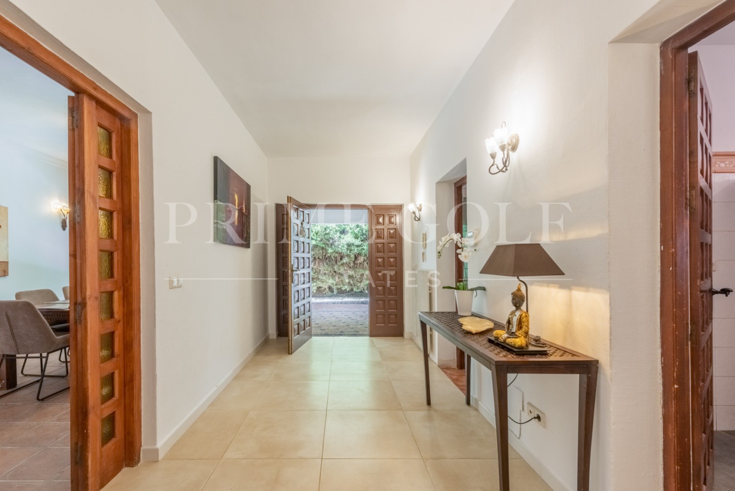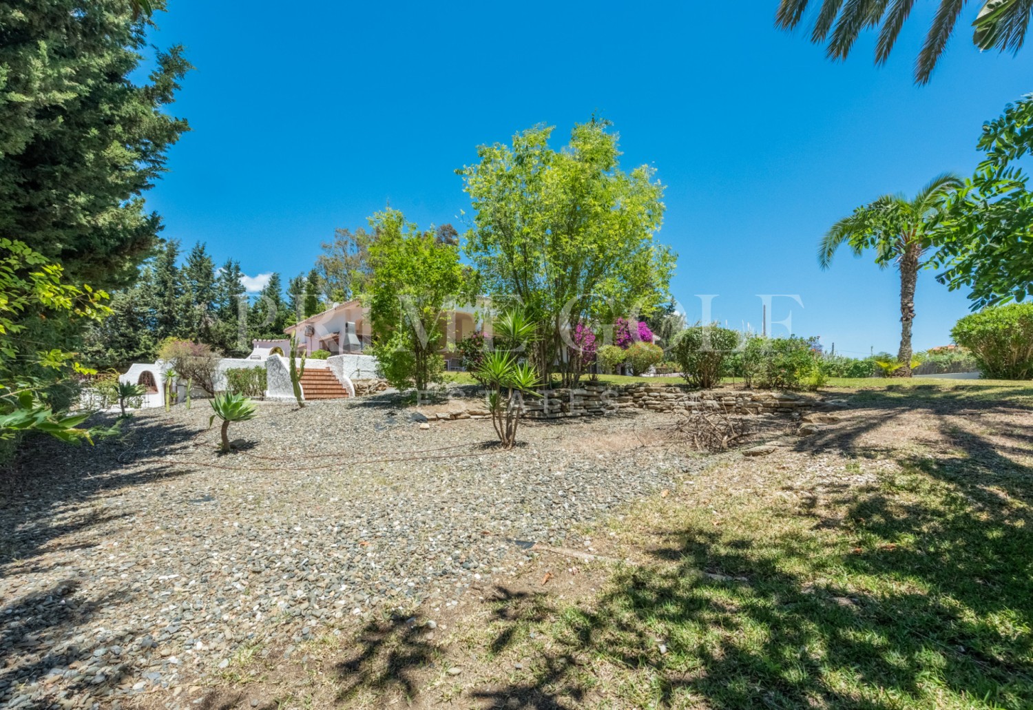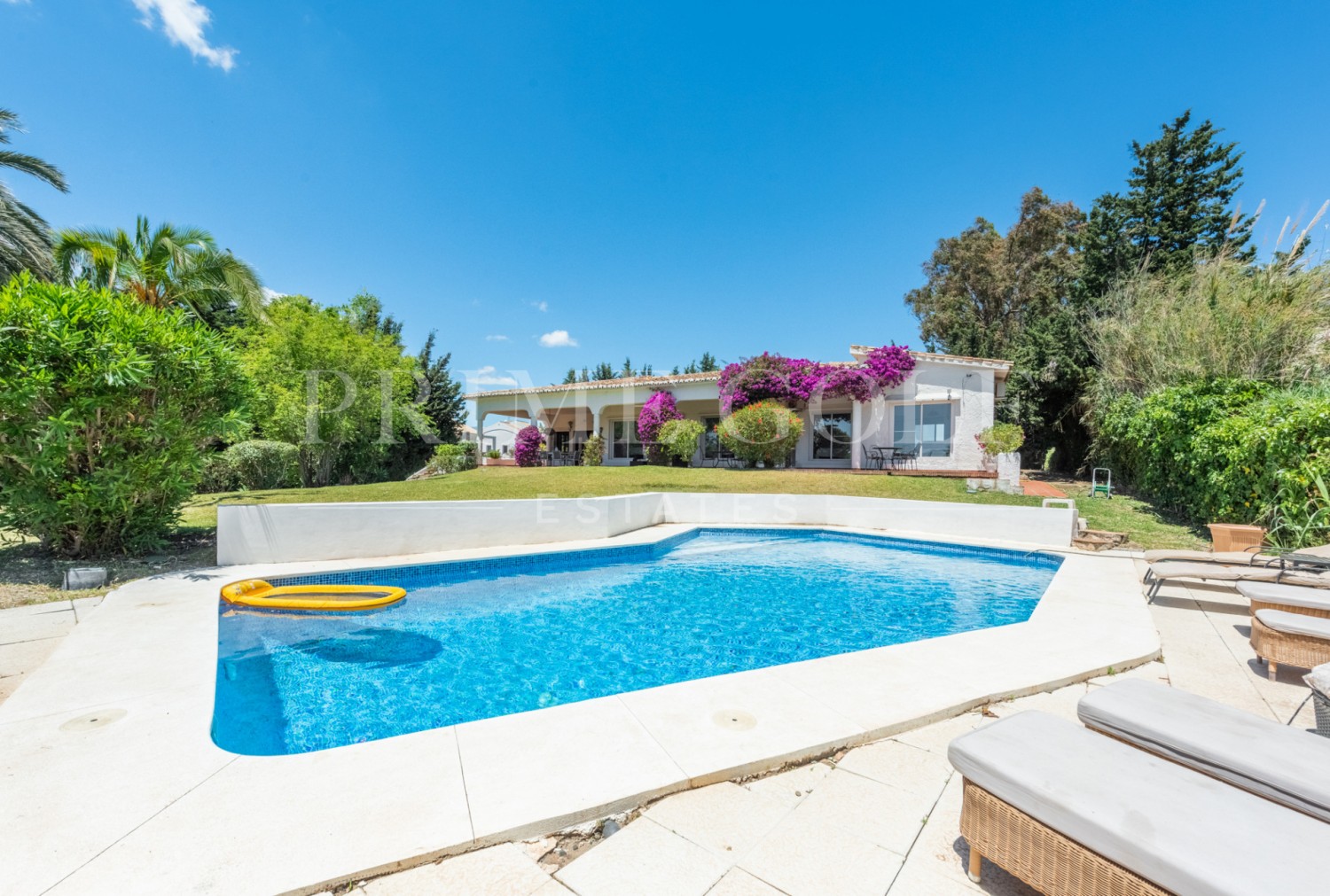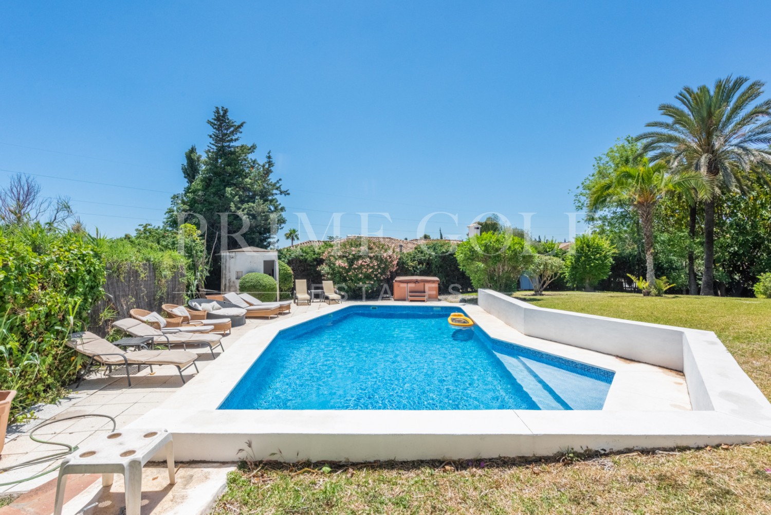 Enchanting Andalusian-style villa boasting a sprawling garden, ideally situated within walking distance of Atalaya Golf. Bathed in sunlight, the villa is designed on a single level, with an expansive garage nestled on the basement floor. Enjoy unparalleled privacy as the property is secluded and not overlooked.
