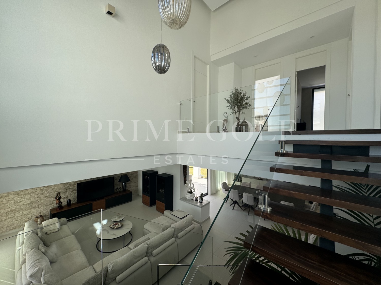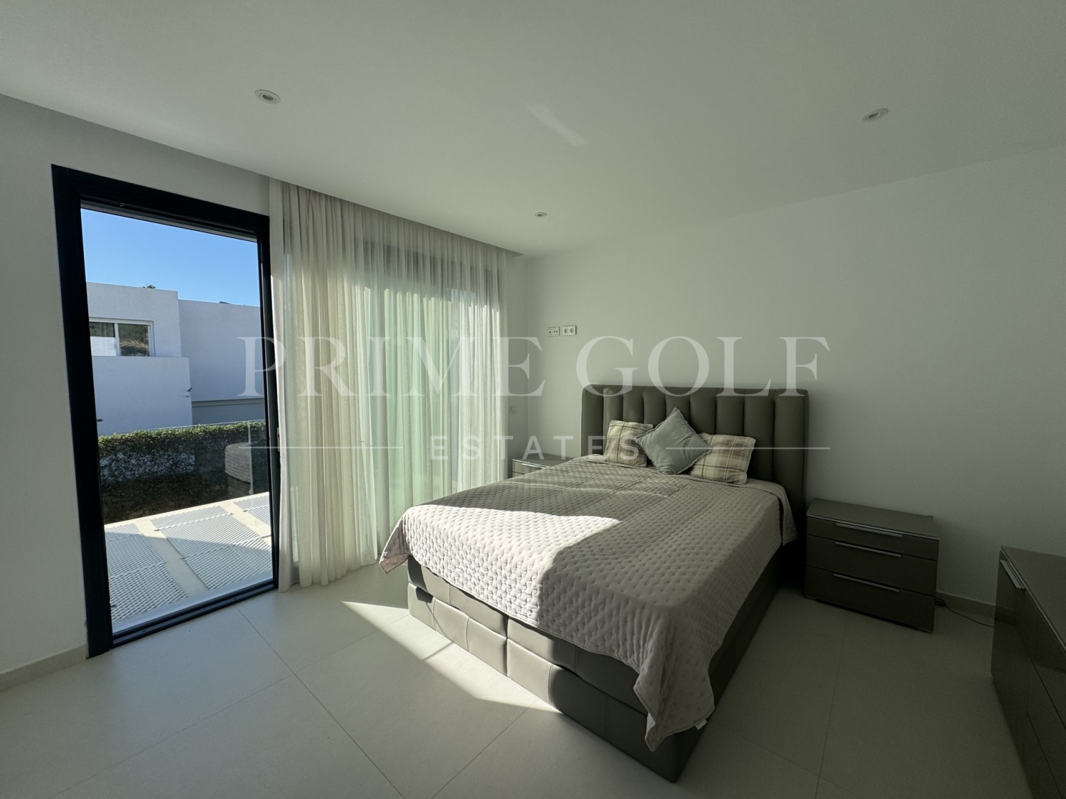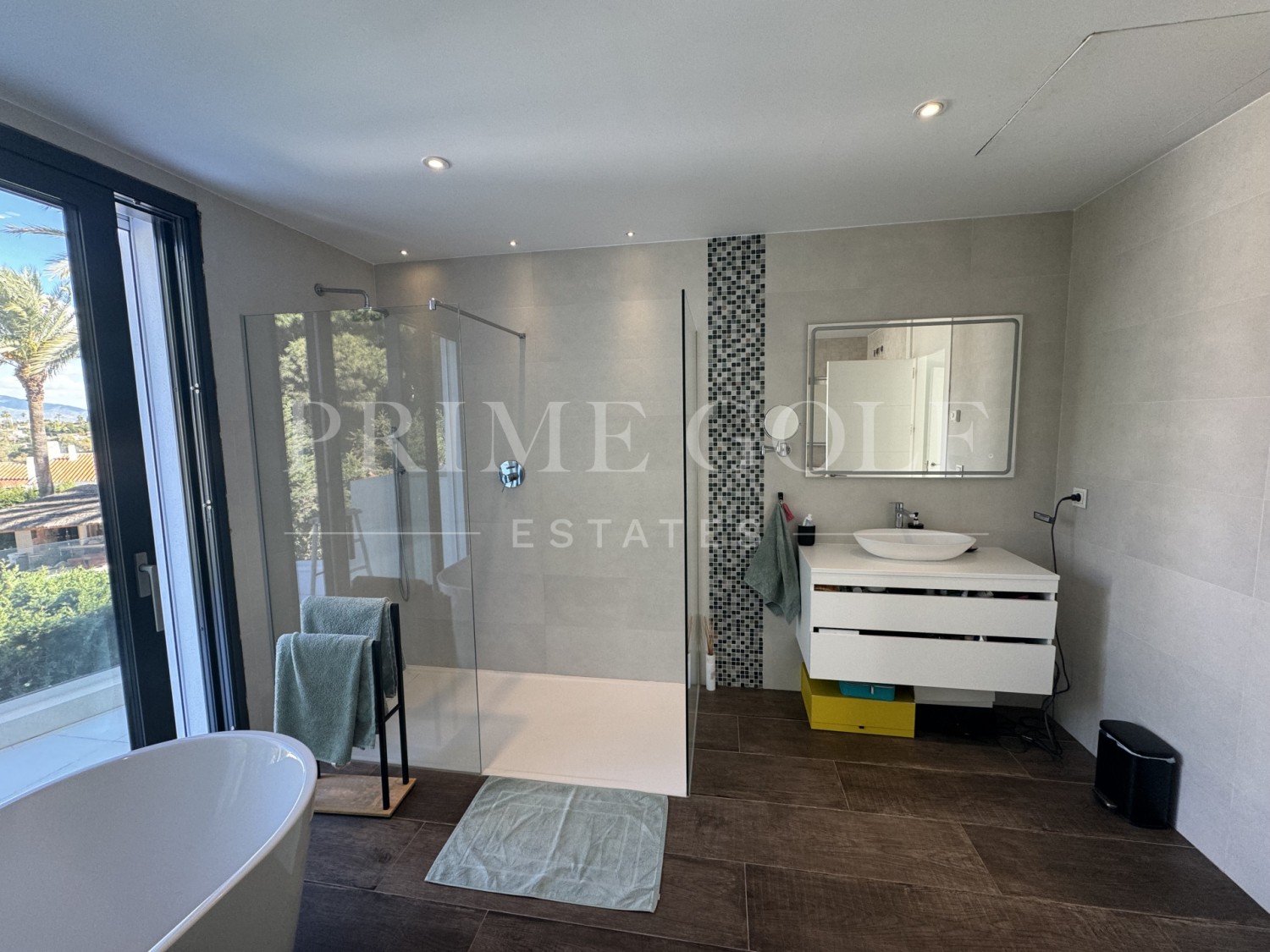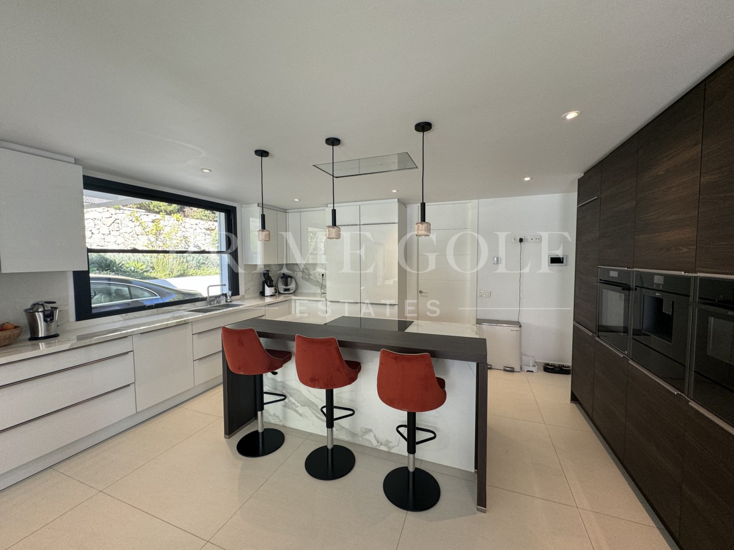 Built to the highest standards, this sleek, contemporary 2 storey villa boasts six bedrooms, five bathrooms, and a guest toilet. The spacious open-plan living area features a modern kitchen, dining space, and a cozy fireplace, all seamlessly flowing onto the sun-drenched terrace. The villa is equipped with underfloor heating throughout, ensuring year-round comfort.