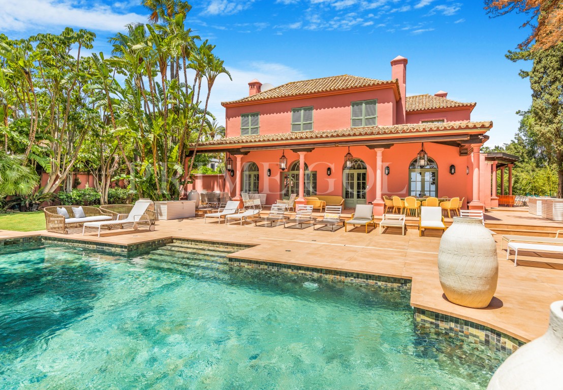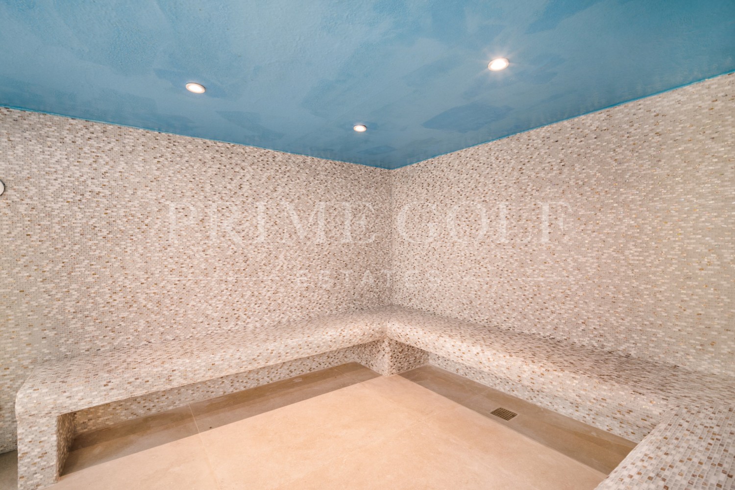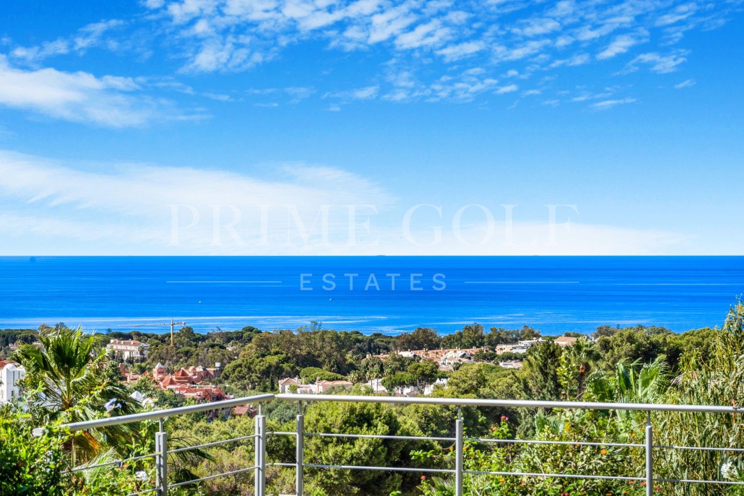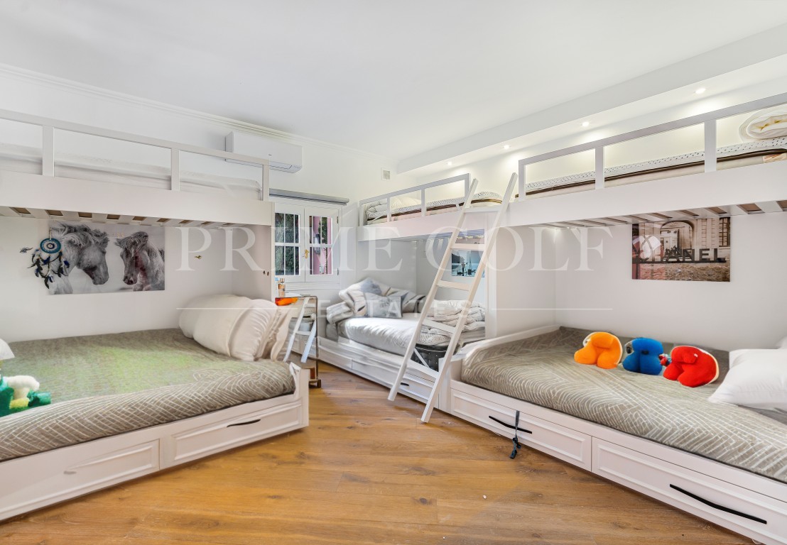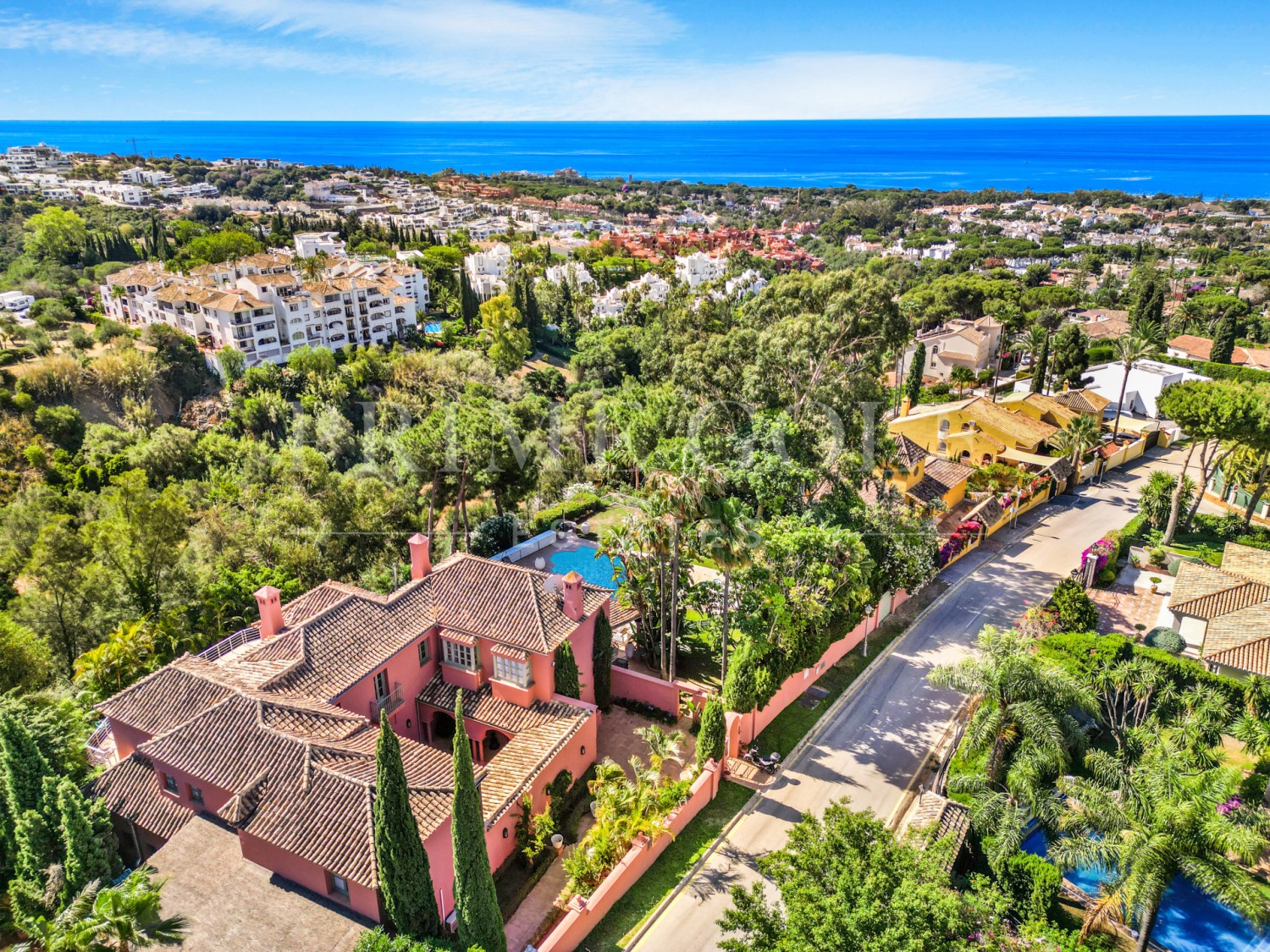 Magnificent six bedroom Villa located in Hacienda Las Chapas, Marbella. This property is close to amenities, golf courses and the beach, with only a short ten minute drive to Marbella. The villa boasts spectacular sea views from both the ground floor and first floor; the entrance level has a spacious open plan living and dining room with built in fireplace, lounge and access to the terrace, garden and private swimming pool; fully fitted kitchen; guest suite; and a guest toilet. The first floor has the master suite with walk in closet and spacious terrace with beautiful views to the sea and pool; four guest suites and a terrace with wonderful sea views. The lower level of the property leads to the gym and spa, complete with bathroom, sauna and Hamam. There is also a storage room; laundry room; and lounge area on this level. Other features include hot and cold air conditioning, double car port, fitted wardrobes and solar panels. There is also an approved project to add an independent guest house of 130m2 with three bedrooms and bathrooms.