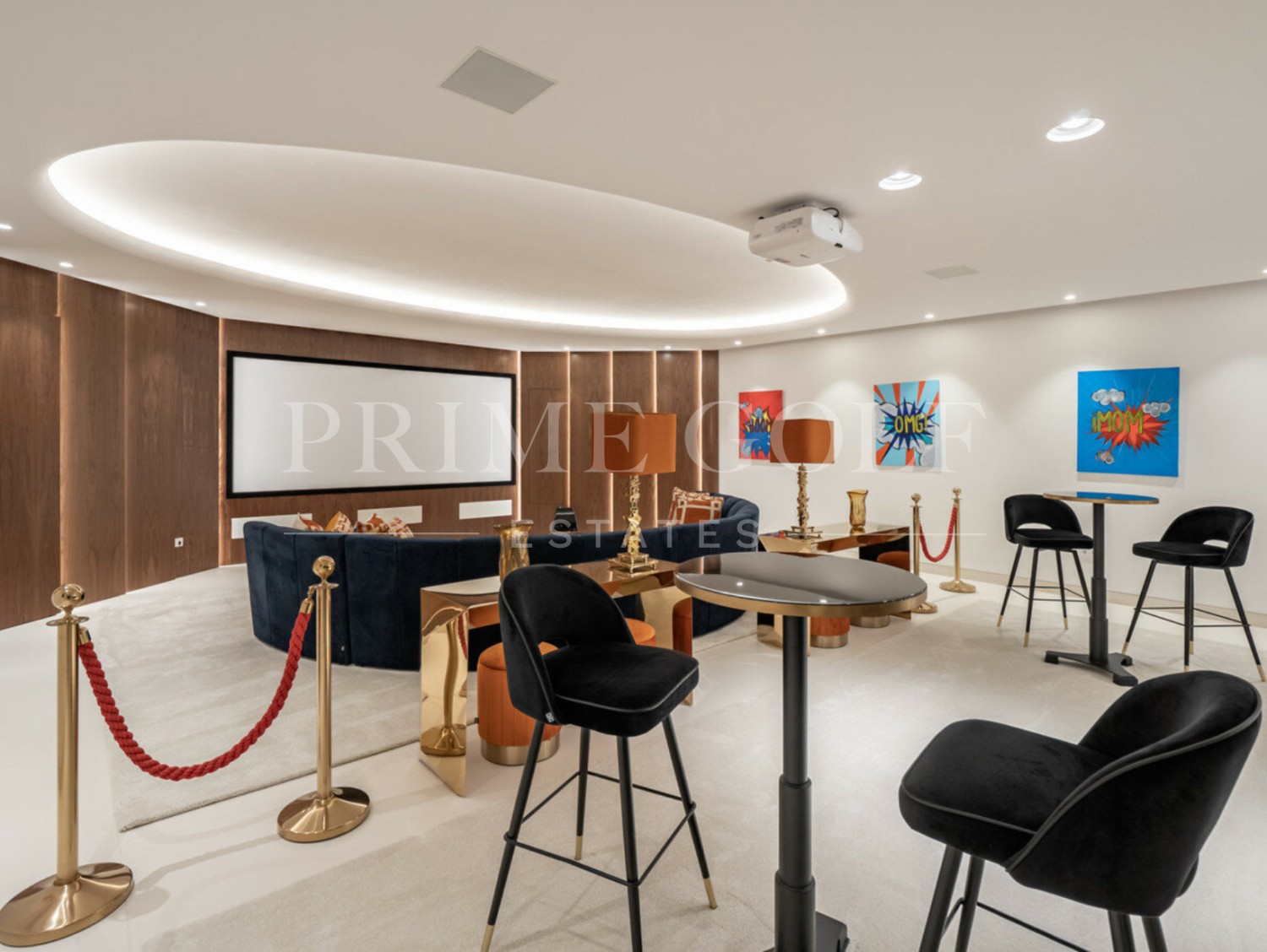 Inside, this house comprises 1.242 m², distributed over two levels plus a lower level, exclusively reserved as an entertainment area with an indoor pool, a state-of-the-art wine cellar, and a fabulous cinema room—the south-orientation grants absolutely stunning panoramic views over the golf course. The villa offers incredible features, such as 7 en-suite bedrooms with dressing rooms, 11 bathrooms; a gorgeous and glamorous living room with outstanding decoration. Furthermore, there’s a library and a dining room that offers direct access to a covered terrace and the incredible garden. The kitchen gets a special mention, blending perfectly and in harmony with the style of this villa, designed by Danespan and equipped with Gaggenau appliances.