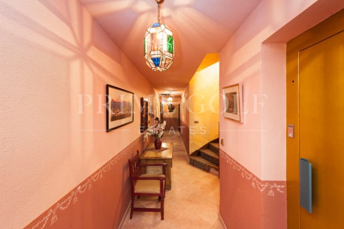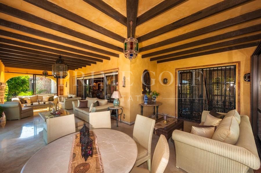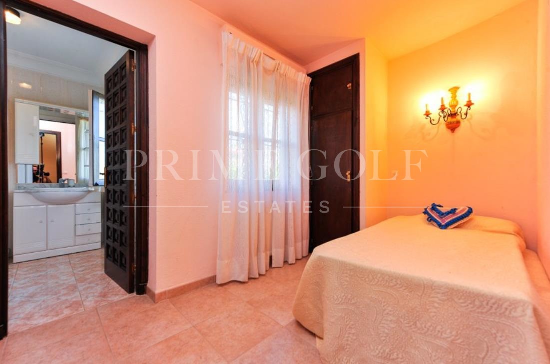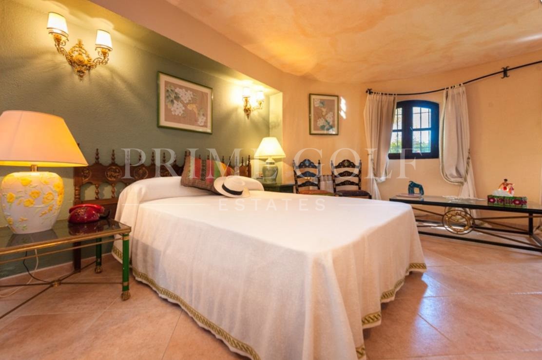 A dining room with direct access to the administrative office and kitchen, a second dining room opens onto a charming traditional Andalusian courtyard. Andalusian courtyard with antique marble mosaic flooring. Master bedroom, living room, dressing room, and solarium terrace facing the garden, pool, golf course, and sea; another en-suite bedroom leading to the main room's terrace overlooking the pool.