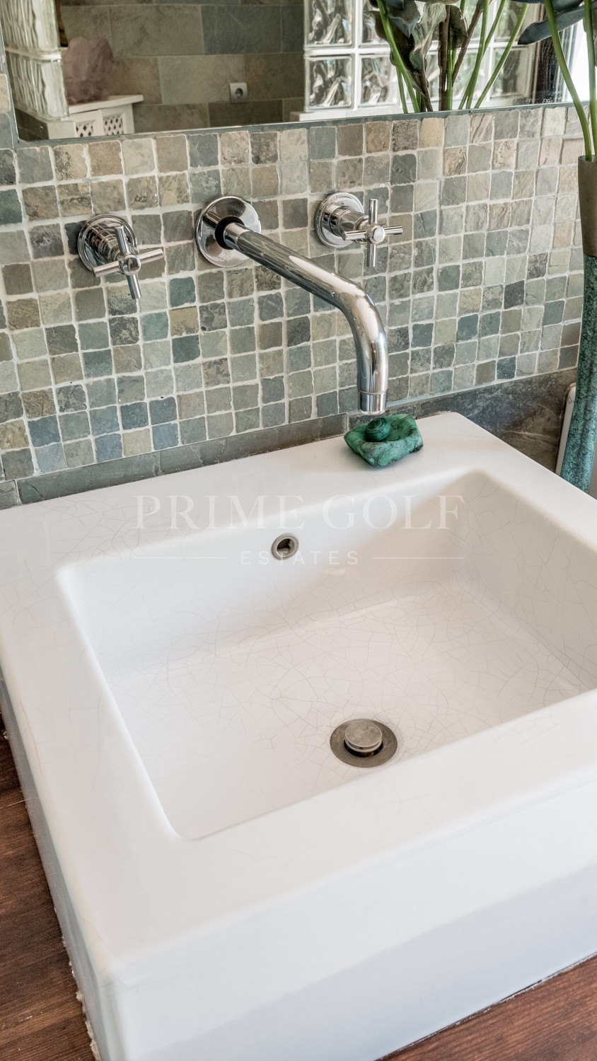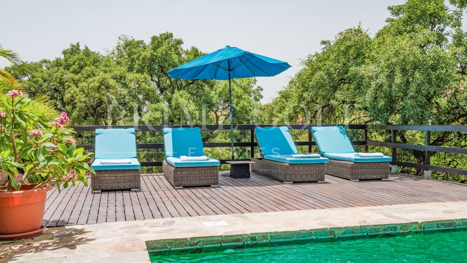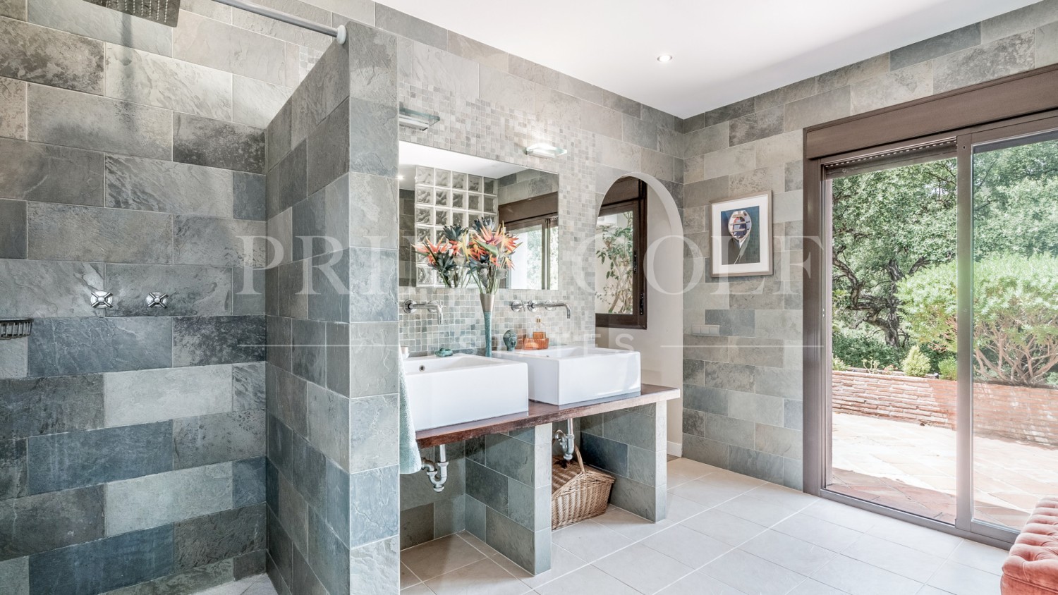 The villa is a contemporary Andalucían style, west-facing, and spans two levels. It features three double-bedroom suites set in the cool overlooking treetops, each with tasteful natural slate mosaic, wood, and glass bathrooms that complement the natural surroundings. The master bedroom suite is exceptionally spacious at 40m2, larger than a typical two- bedroom flat in Central London. All bedrooms open onto large terraces, providing privacy and stunning views.