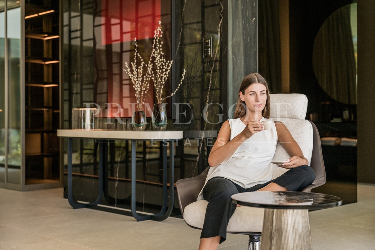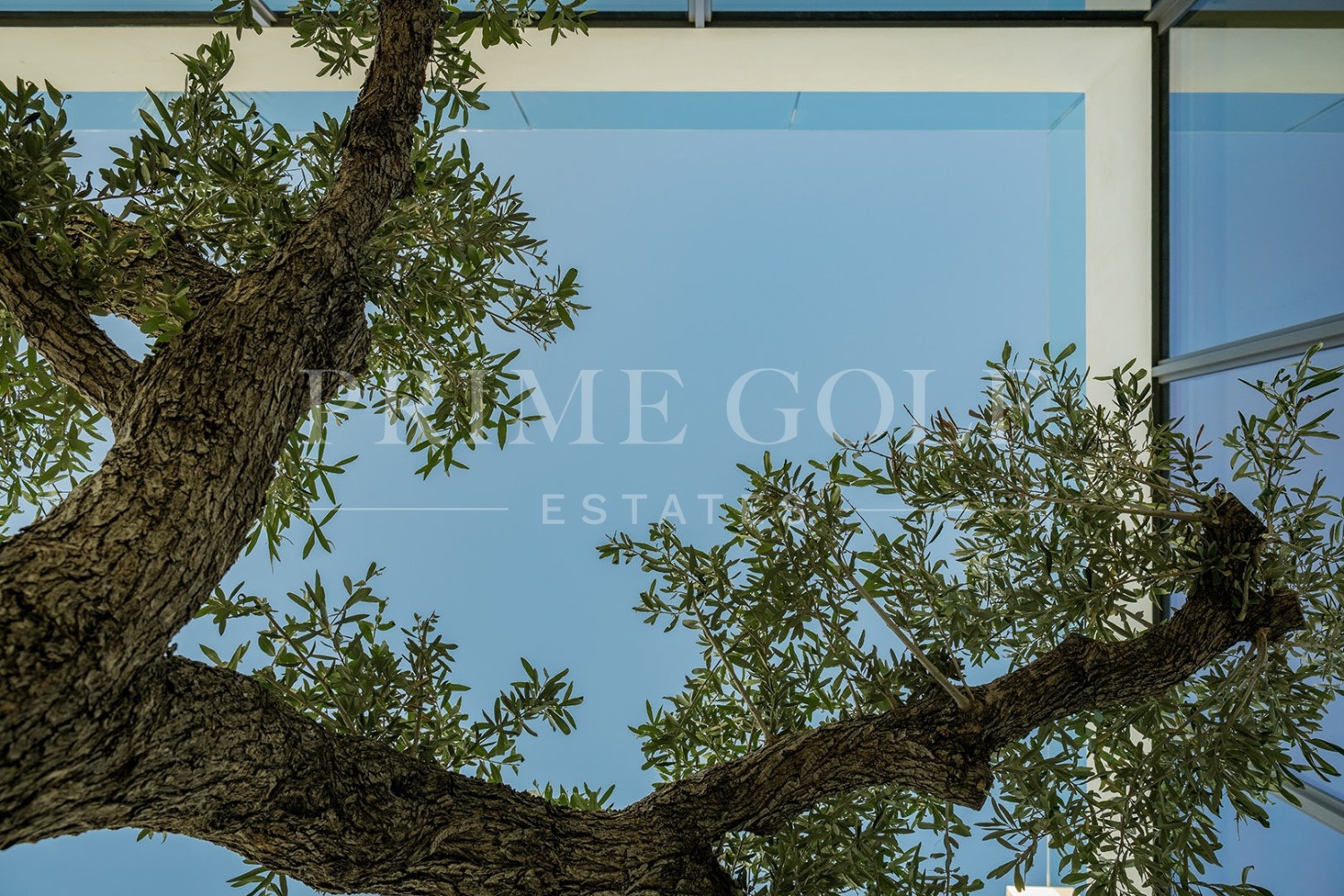 Villa Number 8 spans four meticulously designed floors, connected by a private elevator. The spacious living area features a dramatic double-height ceiling, creating an airy, open atmosphere ideal for entertaining. This flows seamlessly onto a beautifully crafted terrace, perfect for embracing the indoor/outdoor lifestyle. The interior patio, complete with a mature olive tree, further enhances the villa’s expansive feel, blending nature and design. The state-of-the-art Gaggenau kitchen is a chef’s dream, equipped with top-of-the-line appliances, combining style with practicality.