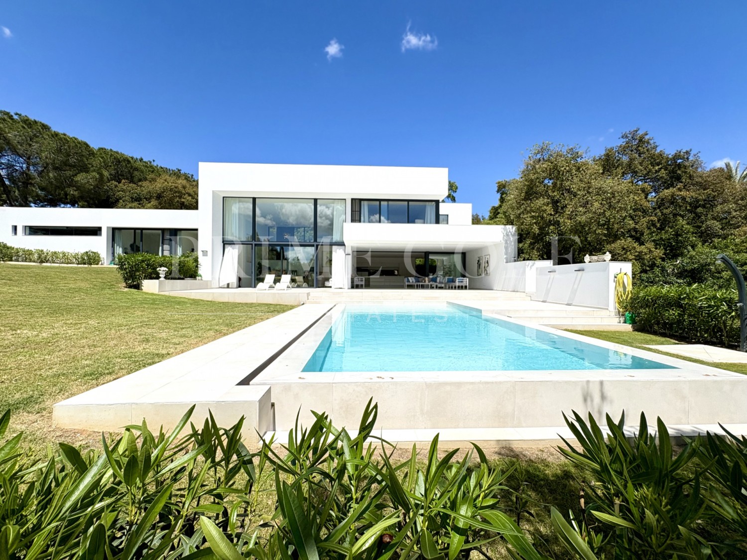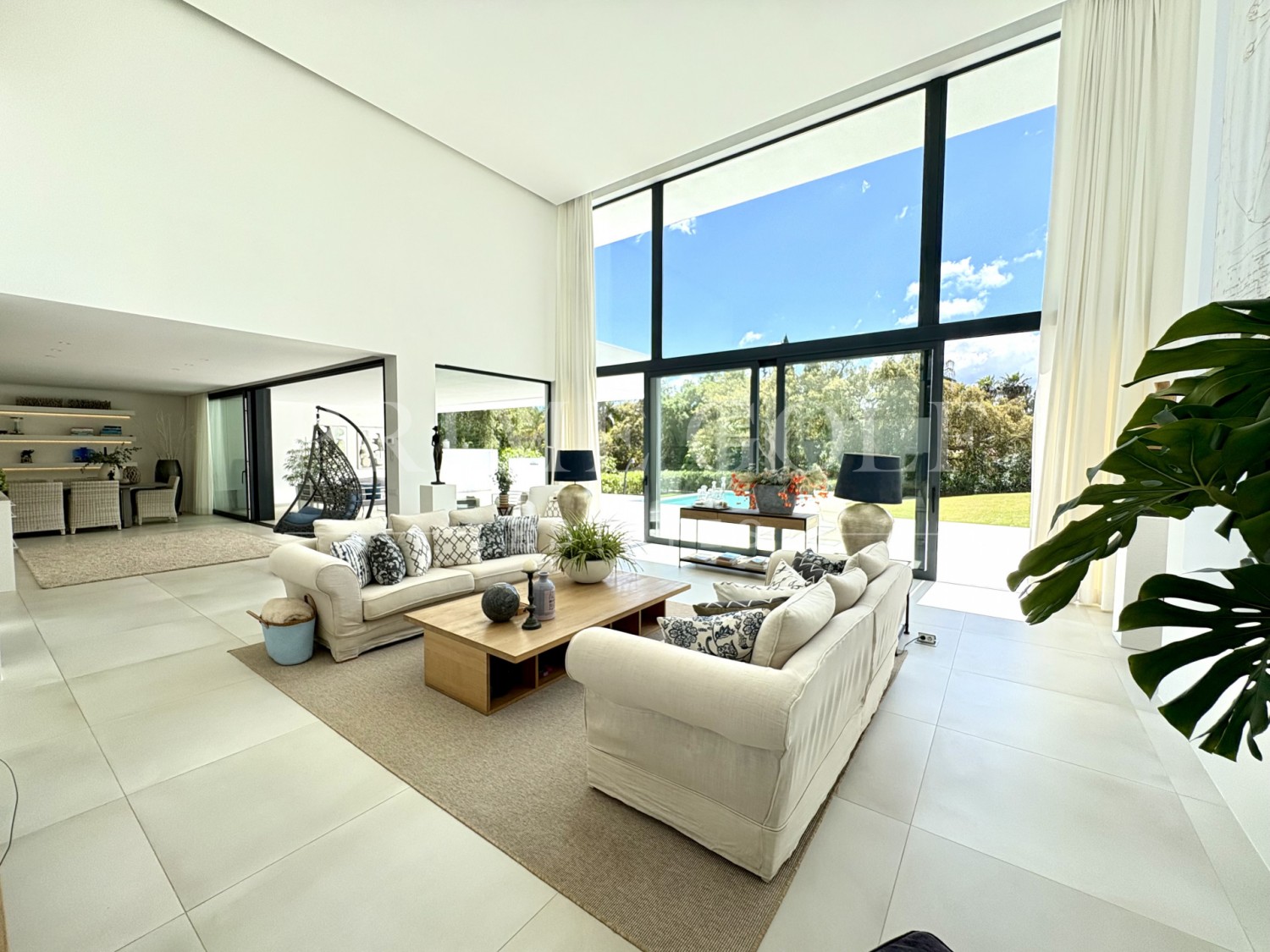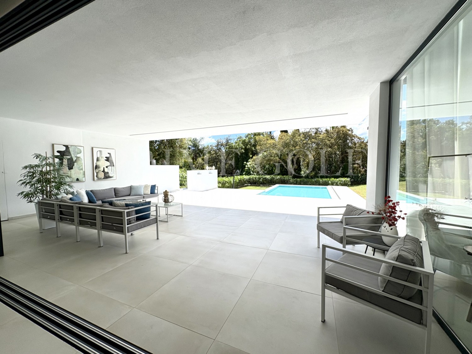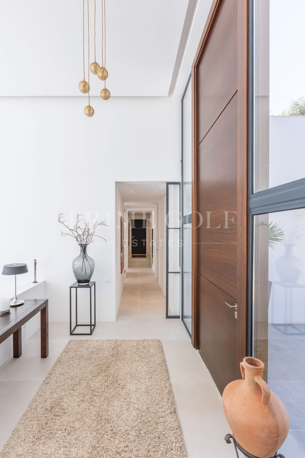 This villa is nestled in a wide, spacious plot of 2.045 square meters in a quiet cul-de-sac in the desired area of Zone D in Sotogrande. The main walkway is surrounded by beautiful oak trees which lead you to an impressive four-meter-high wooden entrance door. Entering this villa offers a wow factoring moment due to the extensive high ceilings and impressive glass windows which look onto a lush spacious and very private garden and pool area. Within one of the wings of the villa, we can find three double ensuite bedrooms which are flooded with natural light due to the large windows and skylights placed in the bathrooms. In this same wing, we can find a