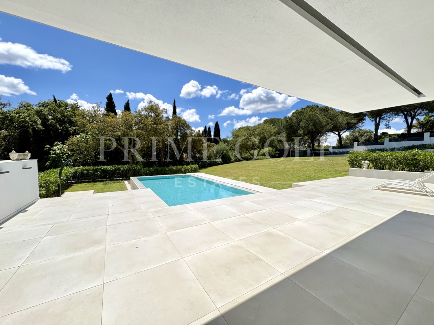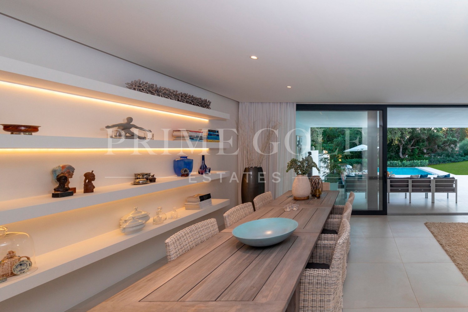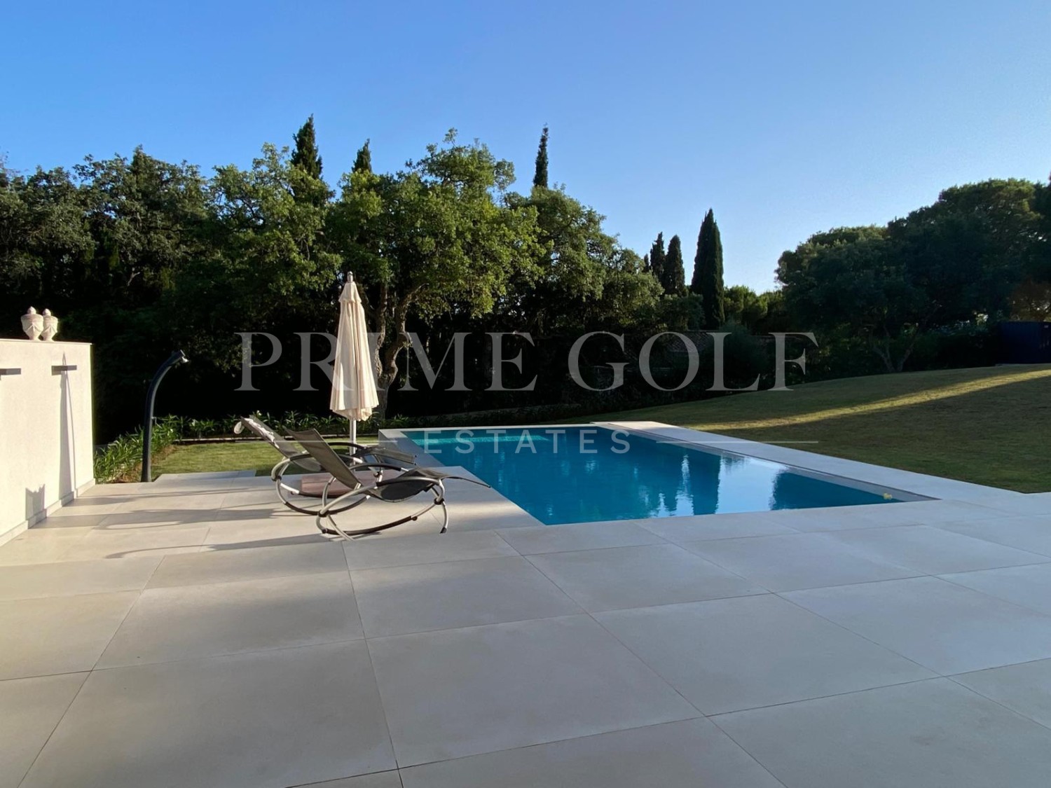 This villa is nestled in a wide, spacious plot of 2.045 square meters in a quiet cul-de-sac in the desired area of Zone D in Sotogrande. The main walkway is surrounded by beautiful oak trees which lead you to an impressive four-meter-high wooden entrance door. Entering this villa offers a wow factoring moment due to the extensive high ceilings and impressive glass windows which look onto a lush spacious and very private garden and pool area. Within one of the wings of the villa, we can find three double ensuite bedrooms which are flooded with natural light due to the large windows and skylights placed in the bathrooms. In this same wing, we can find a