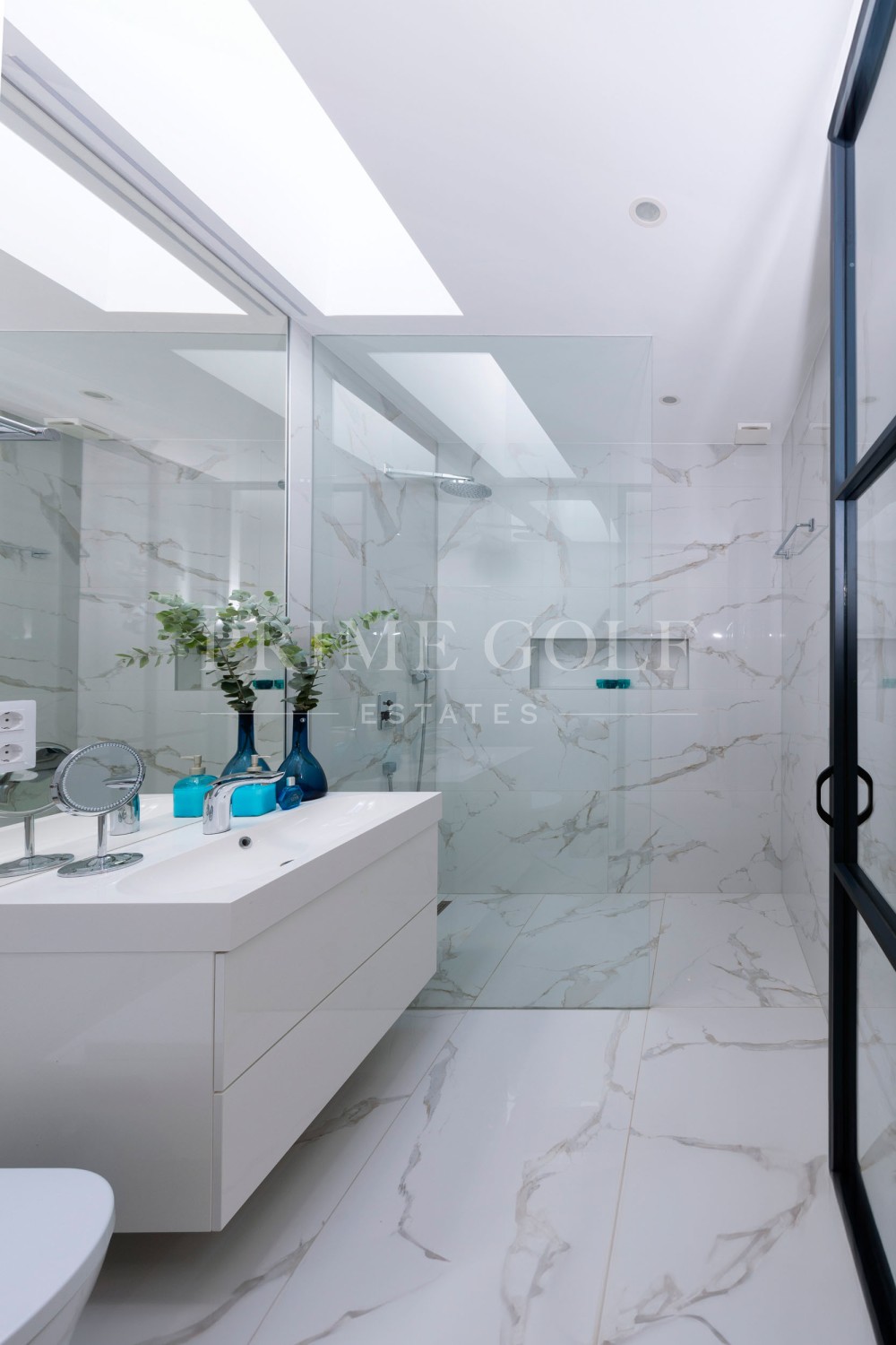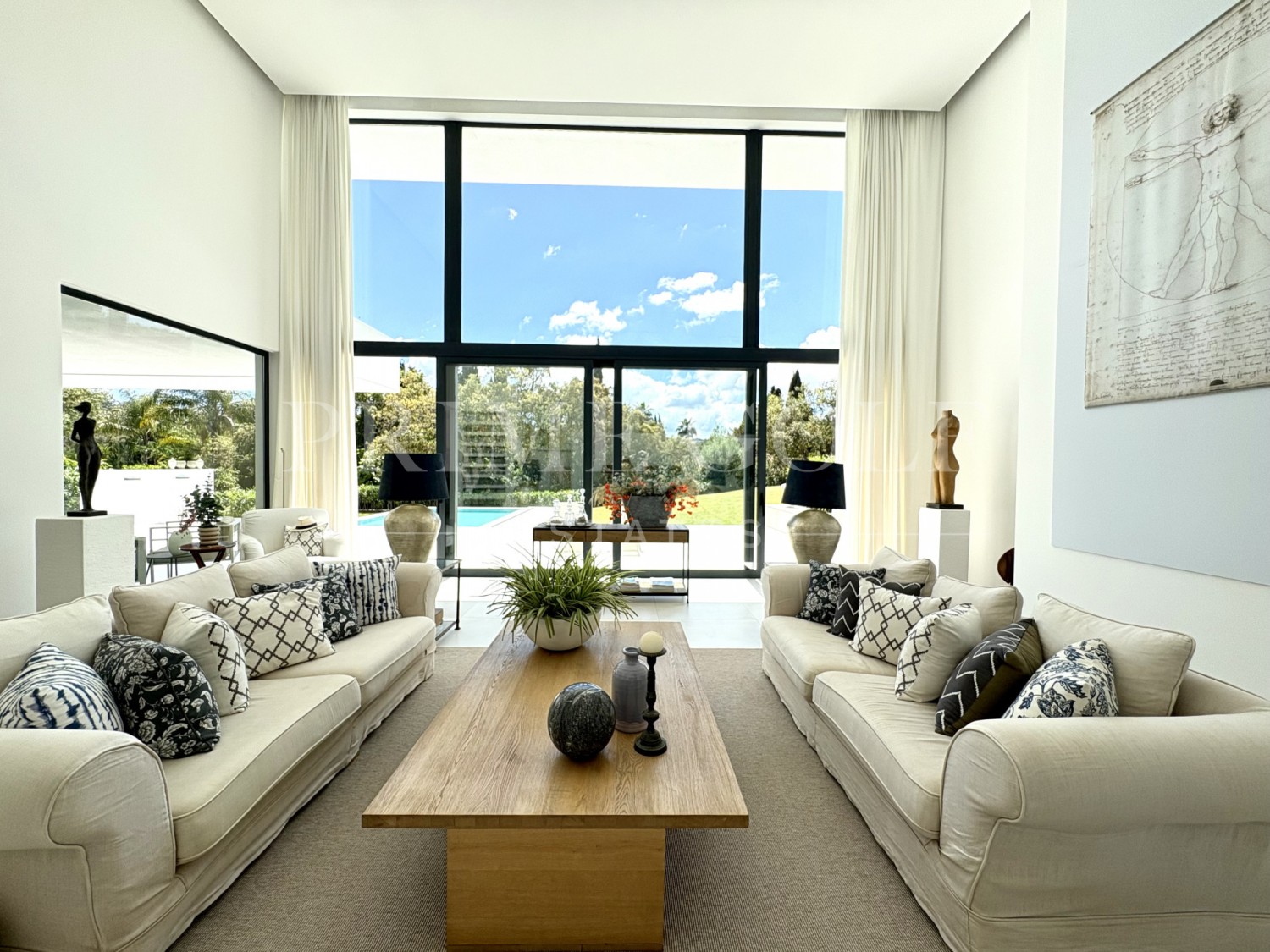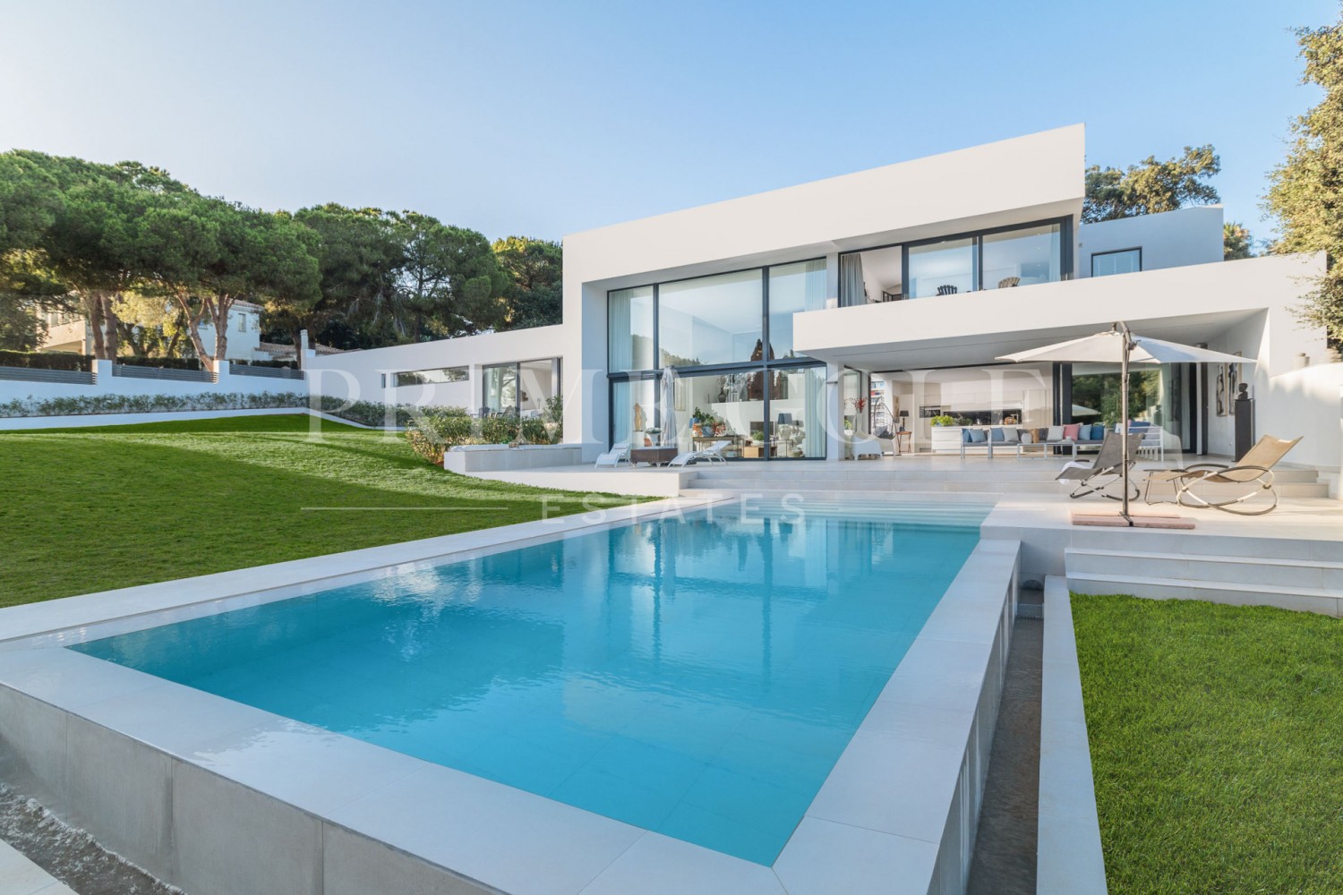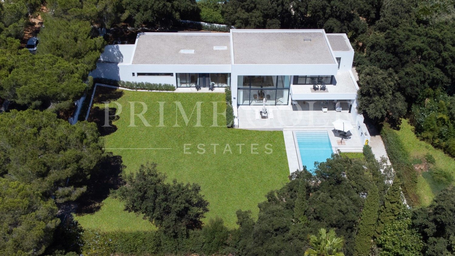 This villa is nestled in a wide, spacious plot of 2.045 square meters in a quiet cul-de-sac in the desired area of Zone D in Sotogrande. The main walkway is surrounded by beautiful oak trees which lead you to an impressive four-meter-high wooden entrance door. Entering this villa offers a wow factoring moment due to the extensive high ceilings and impressive glass windows which look onto a lush spacious and very private garden and pool area. Within one of the wings of the villa, we can find three double ensuite bedrooms which are flooded with natural light due to the large windows and skylights placed in the bathrooms. In this same wing, we can find a