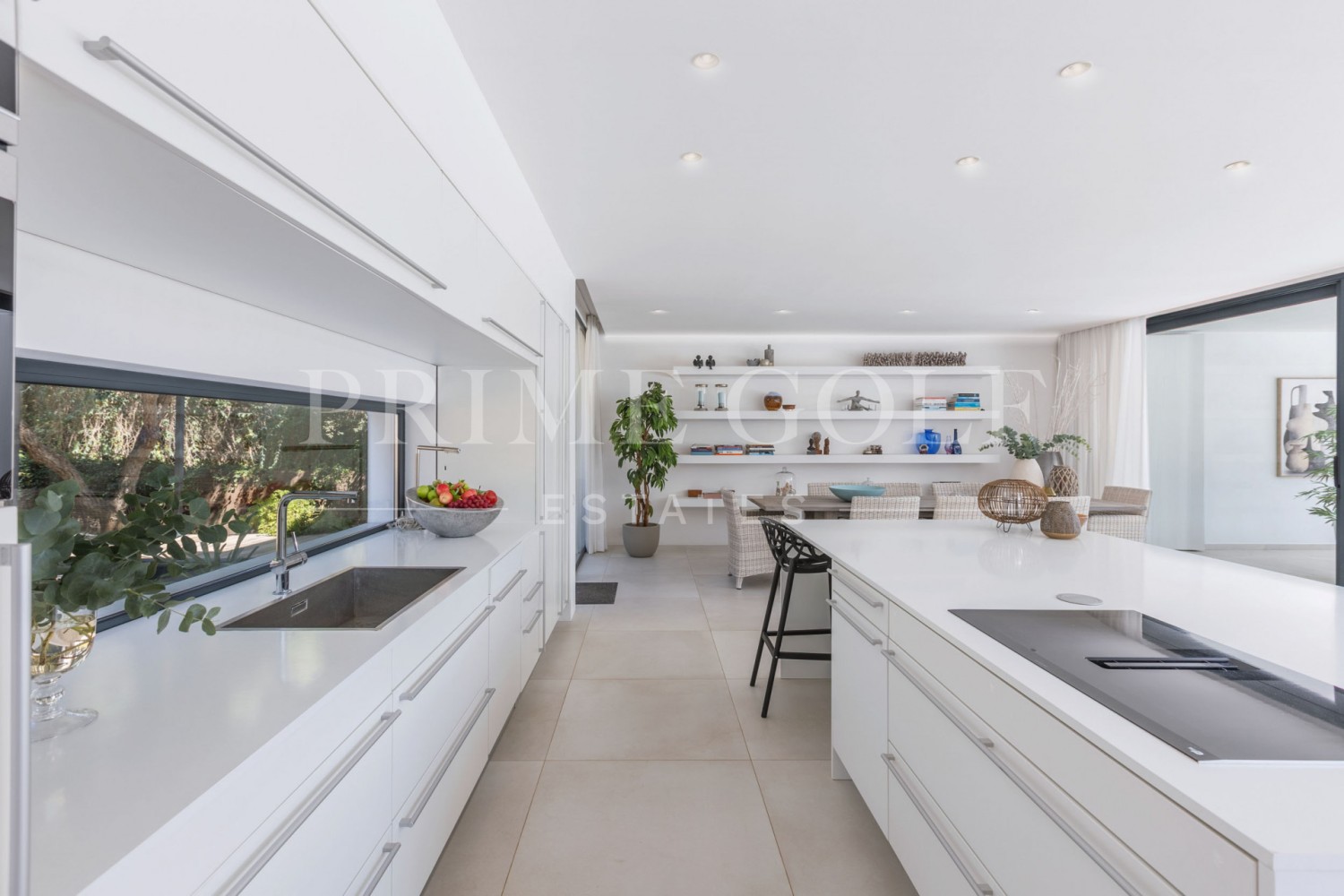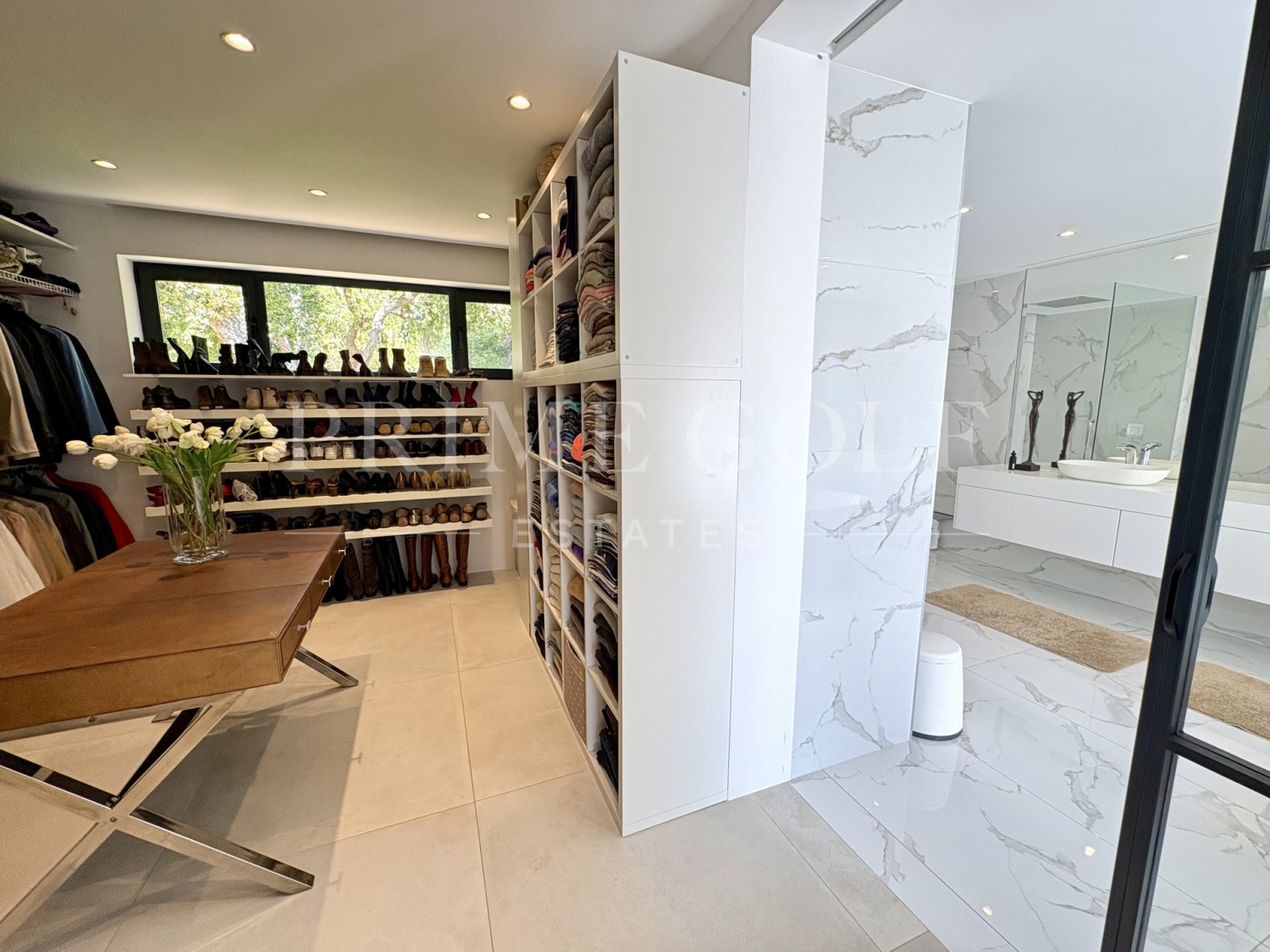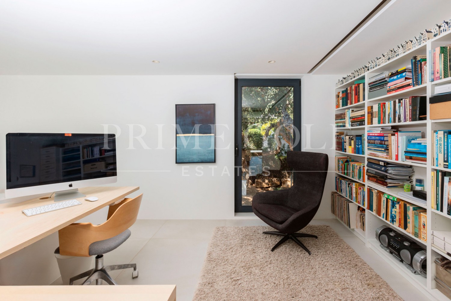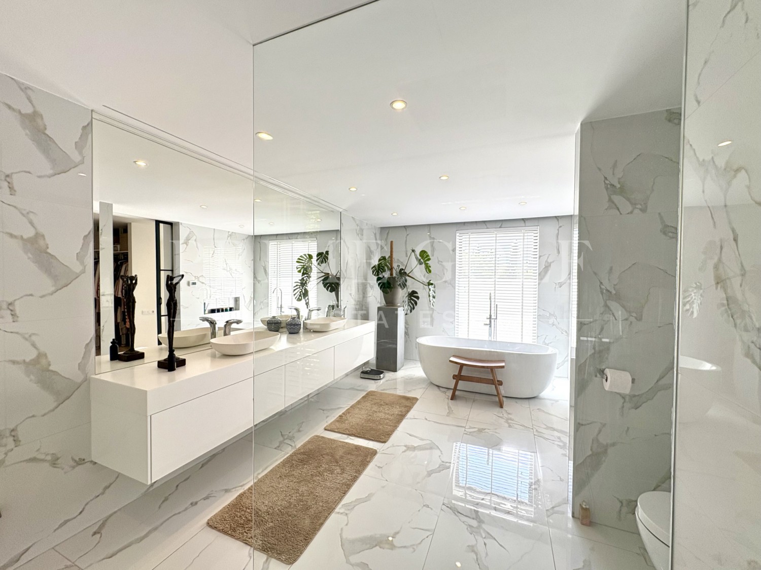 spacious and very needed double garage and storage as well as a very well-thought-out laundry area with an exterior covered patio. On the other wing of the villa, we have an upper level, which has been fully dedicated to offering an open-concept office with beautiful views and a wow-fracturing large master bedroom with a large walk-in closet, a Spa-like bathroom that includes a floating bath, and a rain shower. The living area is fully communicated with a beautifully designed kitchen and dining area which leads to two wonderful outdoor spaces. In the back, we can find a quaint covered dining and barbecue area whilst in the front we find a well-sized terrace that leads to the overflowing saltwater infinity pool. Other features include partial aerothermal underfloor heating and cooling system, indirect lighting, highly insulating windows, electric curtains, an anti-kalk filter system throughout, an Alarm video system, and a spacious underground basement area.