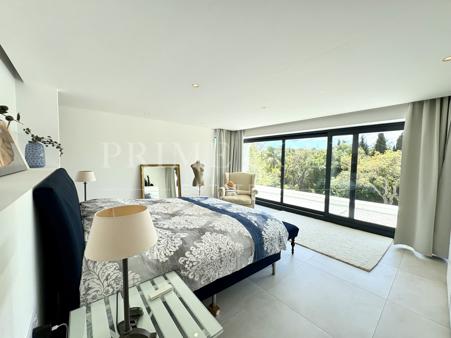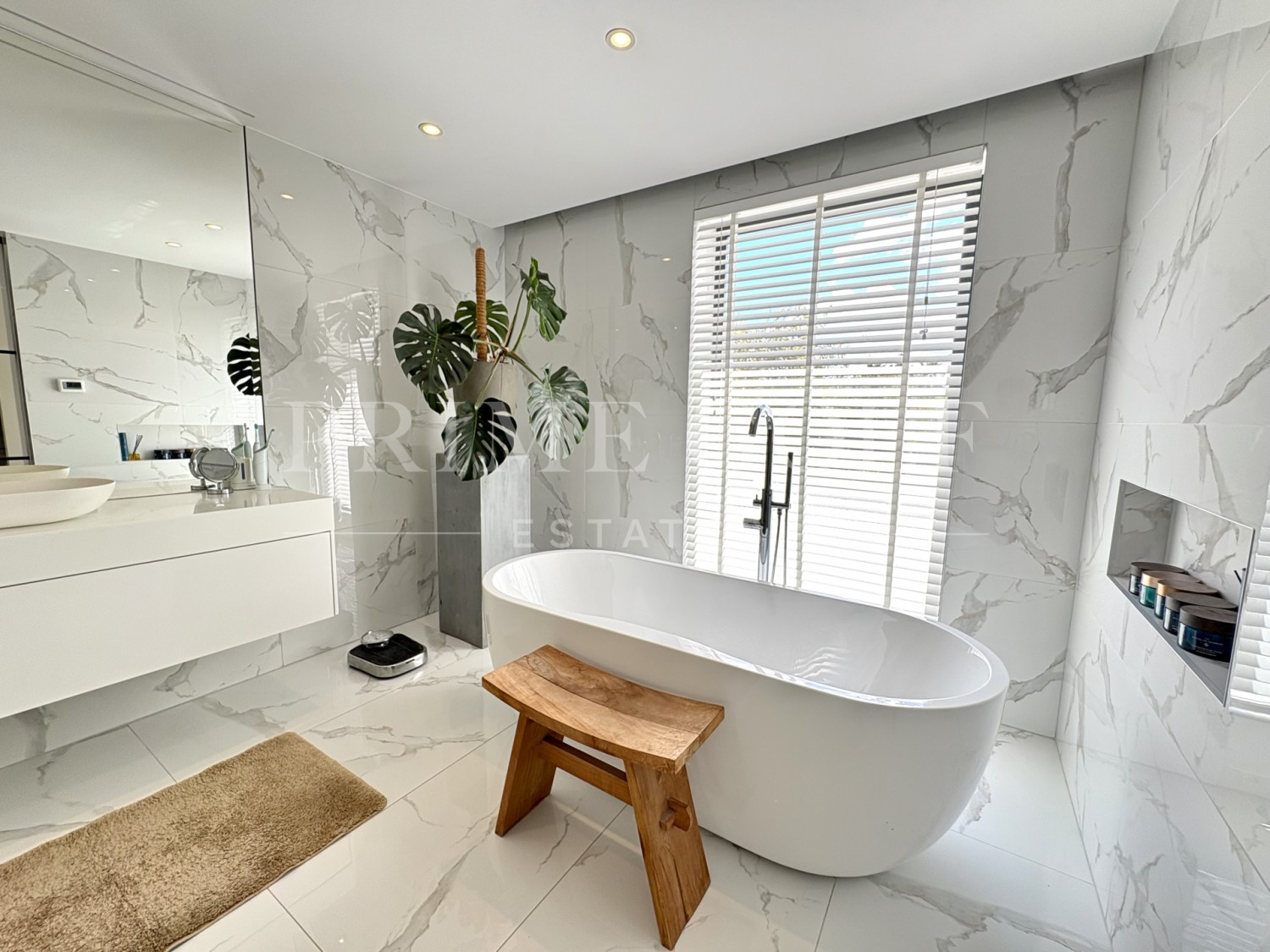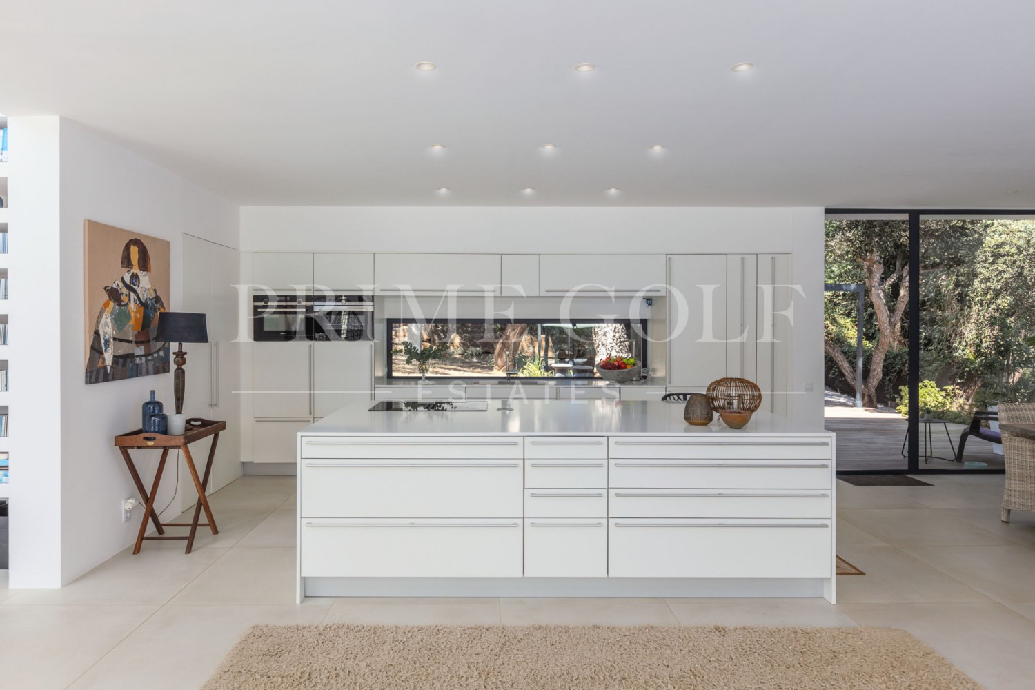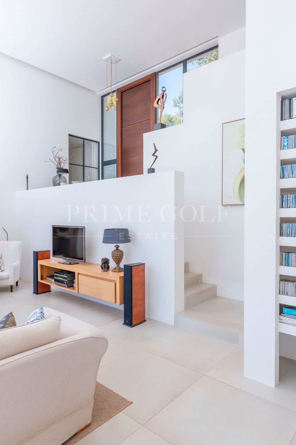 spacious and very needed double garage and storage as well as a very well-thought-out laundry area with an exterior covered patio. On the other wing of the villa, we have an upper level, which has been fully dedicated to offering an open-concept office with beautiful views and a wow-fracturing large master bedroom with a large walk-in closet, a Spa-like bathroom that includes a floating bath, and a rain shower. The living area is fully communicated with a beautifully designed kitchen and dining area which leads to two wonderful outdoor spaces. In the back, we can find a quaint covered dining and barbecue area whilst in the front we find a well-sized terrace that leads to the overflowing saltwater infinity pool. Other features include partial aerothermal underfloor heating and cooling system, indirect lighting, highly insulating windows, electric curtains, an anti-kalk filter system throughout, an Alarm video system, and a spacious underground basement area.