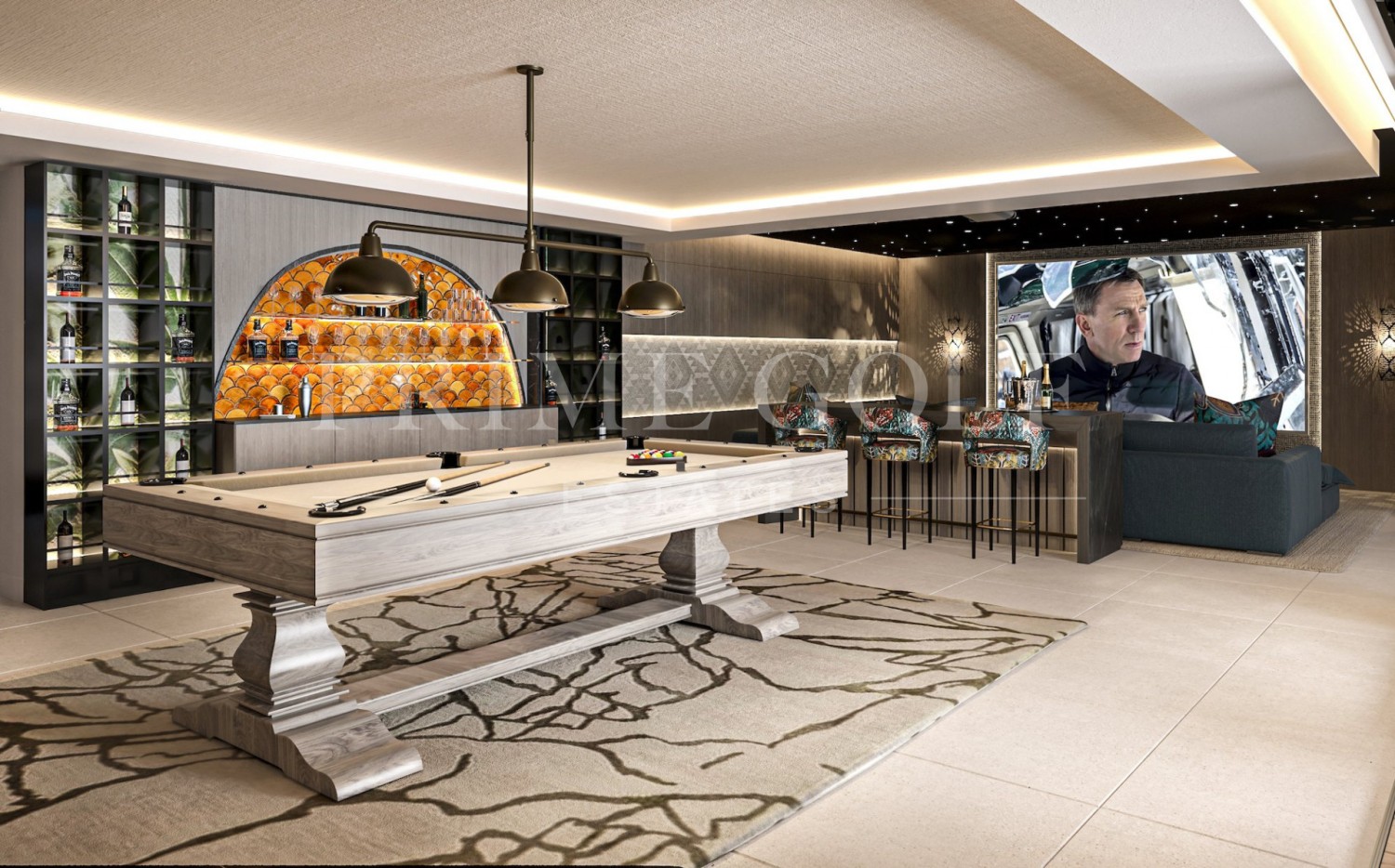 The basement got everything you could wish for, entertaining your family and friends. Coming down the stairs you are immediately welcomed by two interior garden areas with water features, nicely dividing up the spa with sauna and hamman and the large playroom with cinema, wine cellar and bar. Further in the basement you have the fifth bedroom en-suit, a large garage for 3-4 cars, the laundry and technical room.