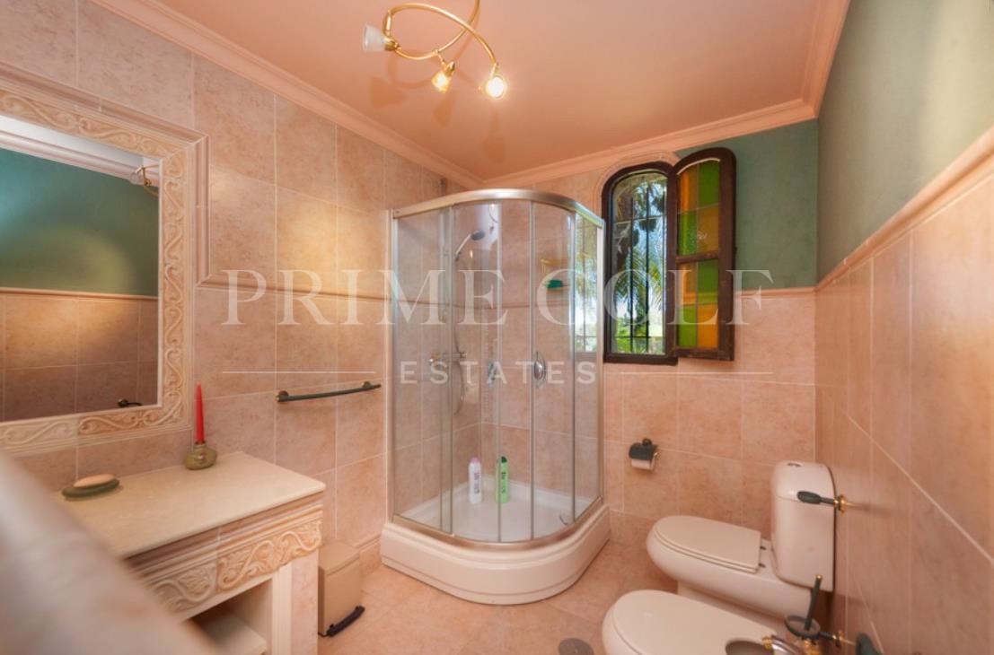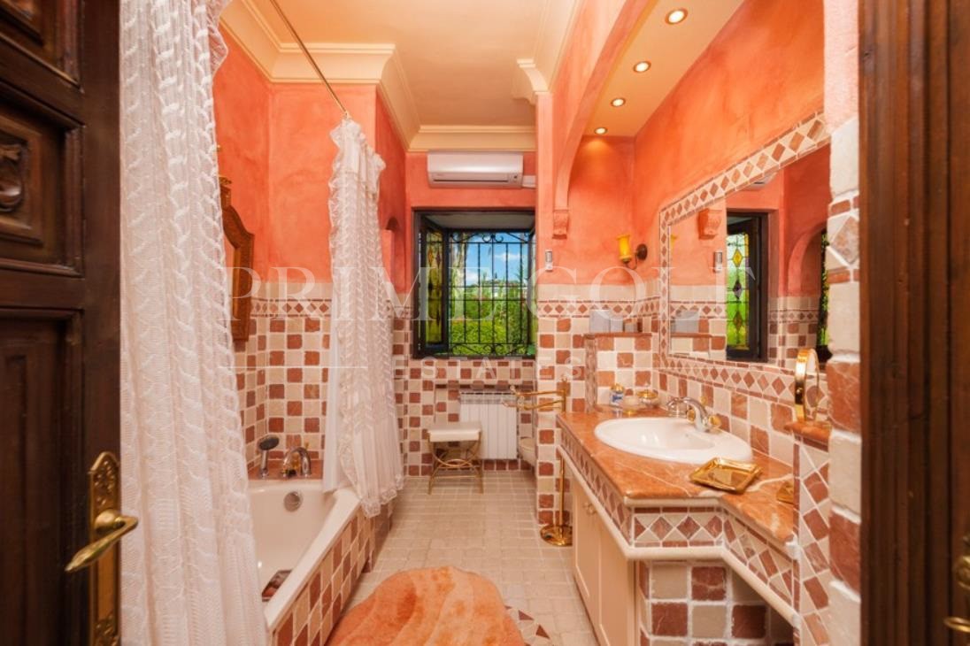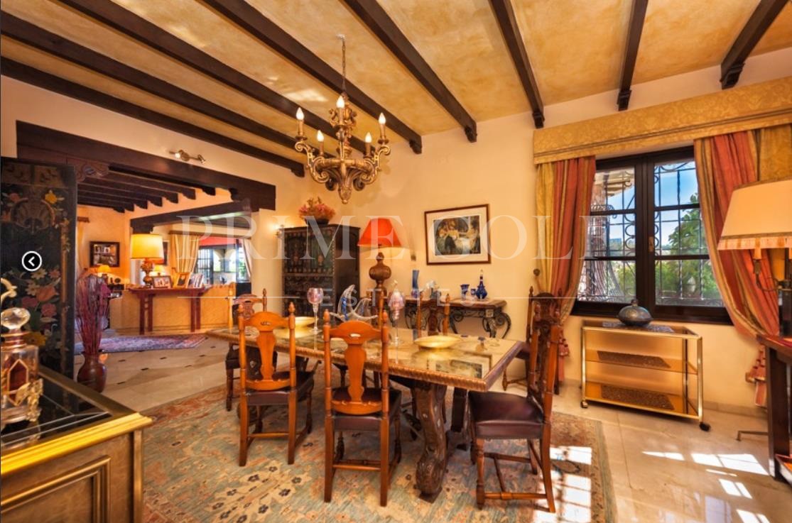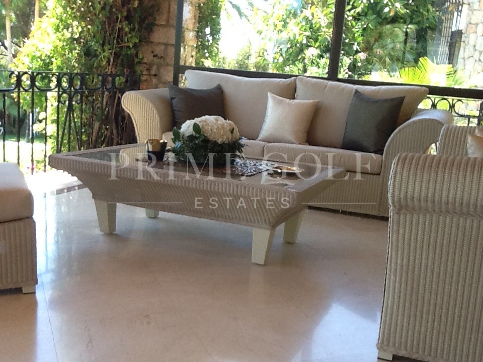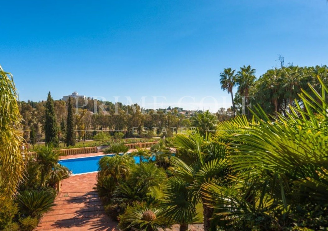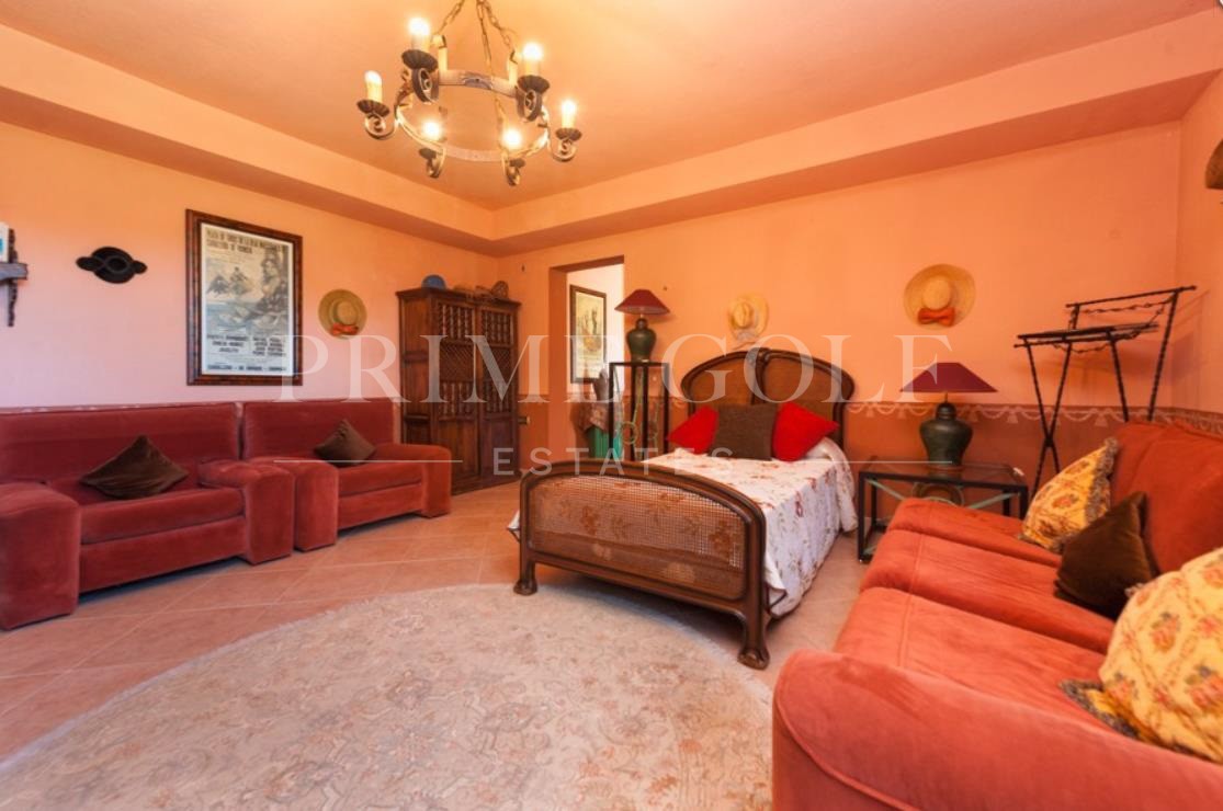 A dining room with direct access to the administrative office and kitchen, a second dining room opens onto a charming traditional Andalusian courtyard. Andalusian courtyard with antique marble mosaic flooring. Master bedroom, living room, dressing room, and solarium terrace facing the garden, pool, golf course, and sea; another en-suite bedroom leading to the main room's terrace overlooking the pool.