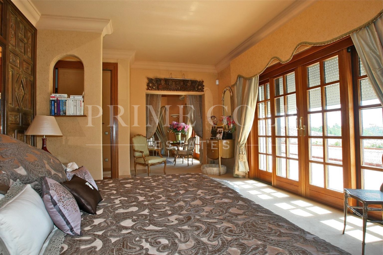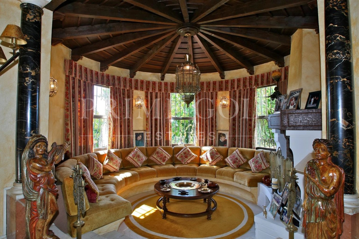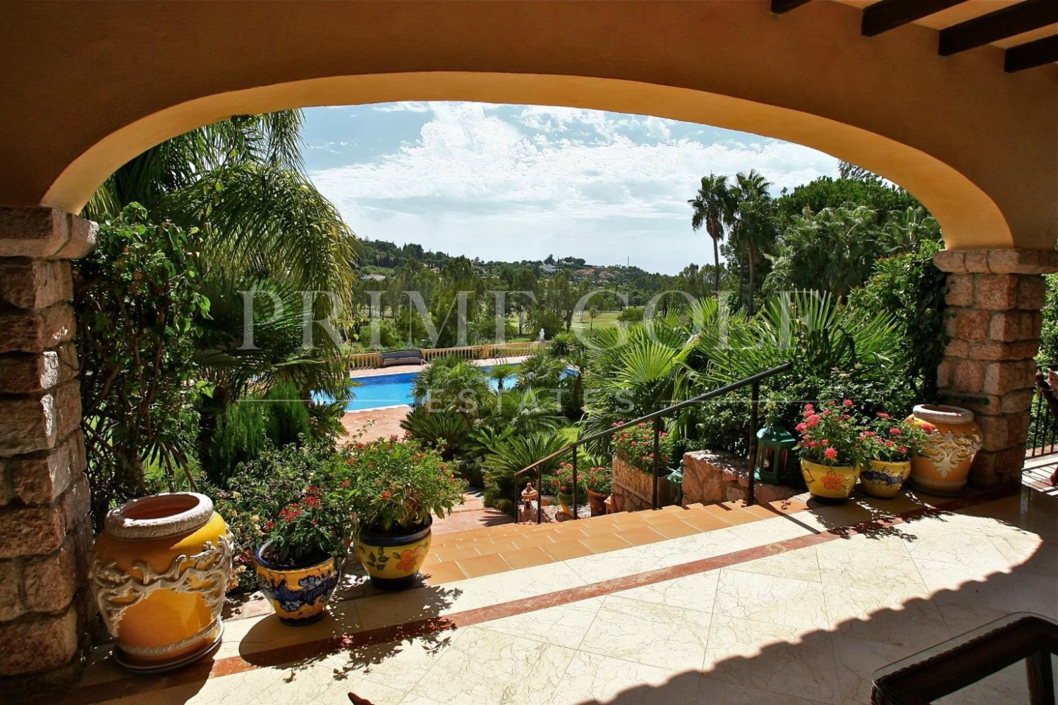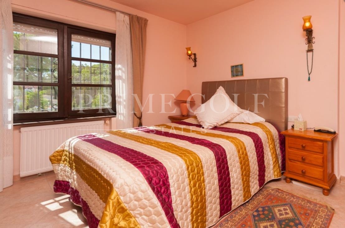 A dining room with direct access to the administrative office and kitchen, a second dining room opens onto a charming traditional Andalusian courtyard. Andalusian courtyard with antique marble mosaic flooring. Master bedroom, living room, dressing room, and solarium terrace facing the garden, pool, golf course, and sea; another en-suite bedroom leading to the main room's terrace overlooking the pool.
