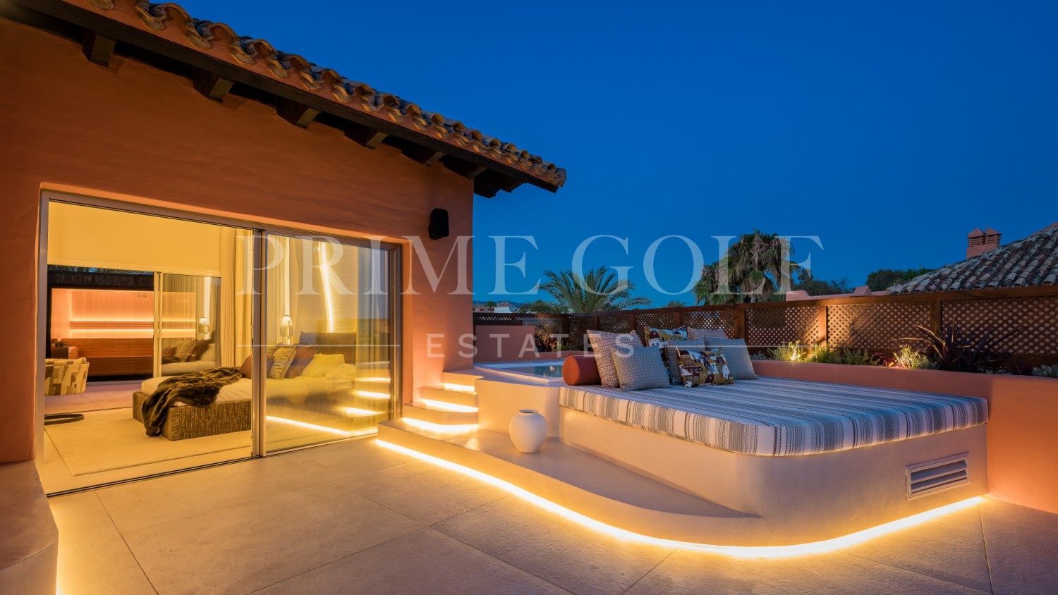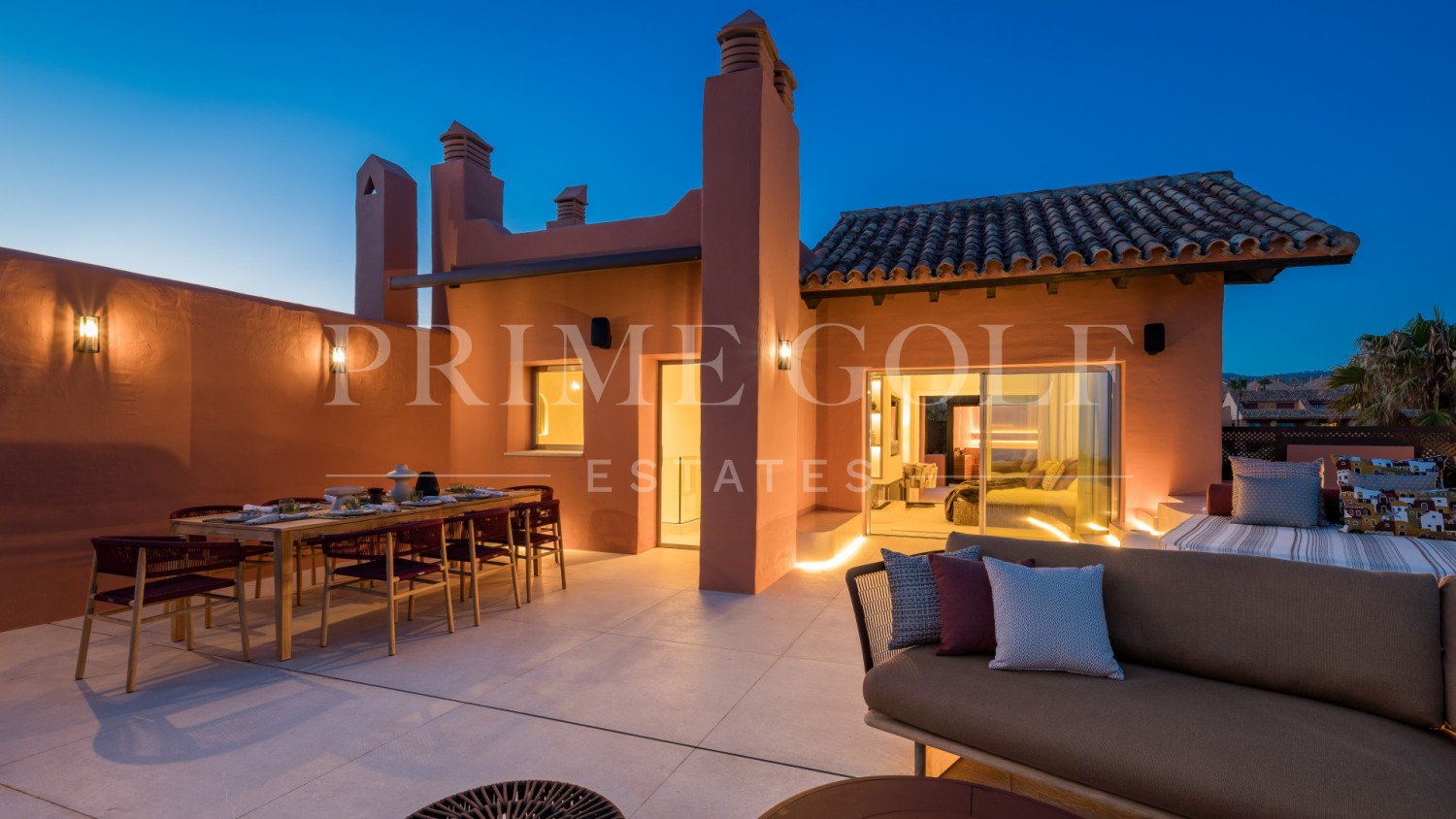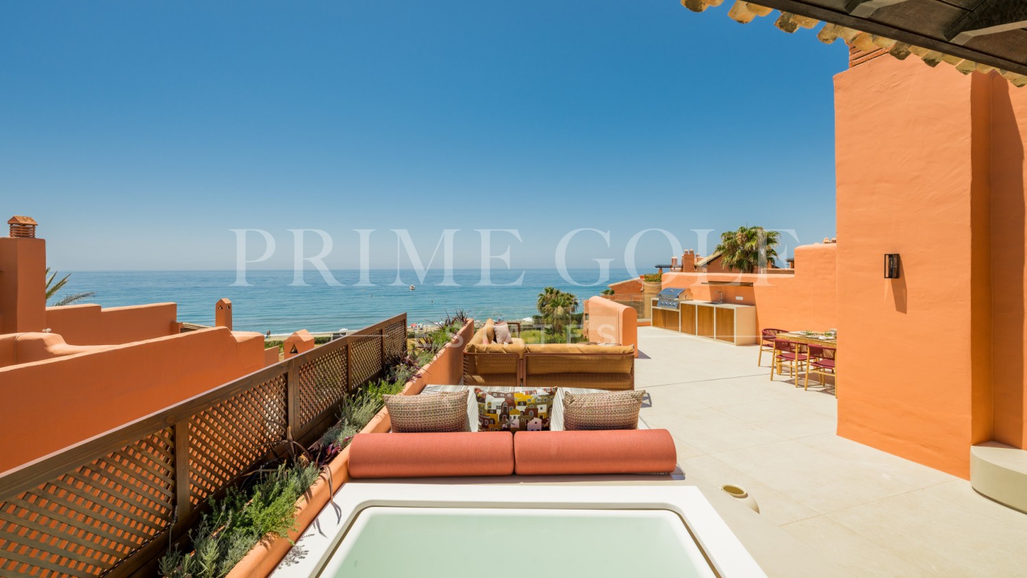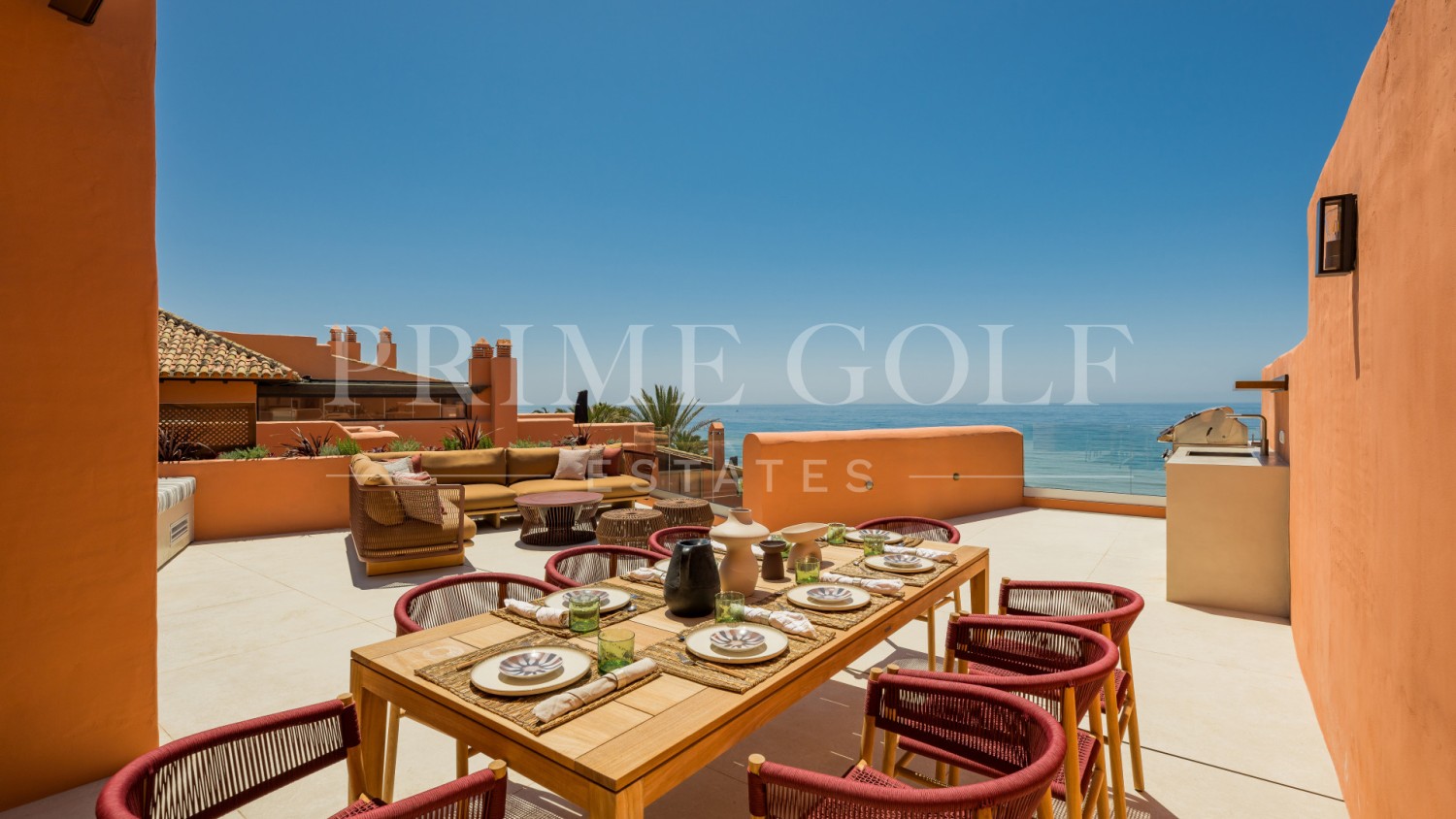 Exquisite four-bedroom, frontline beach duplex penthouse in La Morera, Reserva de Los Monteros. This beachside gated community has 24hr security, communal swimming pool, indoor pool, tropical gardens and direct access to the beach. This luxury property has been finished using high quality materials and elegant furniture. On the entrance level you have an open plan living and dining area with access to a spacious terrace with wonderful sea views; fully fitted open plan kitchen with Miele appliances; three guest suites; guest toilet; and a laundry room. The upper-level leads to the impressive master suite, complete with a walk-in closet and two private terraces. One of the terraces has a sauna and gym and the other gives access to an outdoor kitchen, jacuzzi lounge area and dining area; where you can relax and enjoy the amazing views. Other features include hot and cold air conditioning, underfloor heating, two private parking spaces and a storeroom.