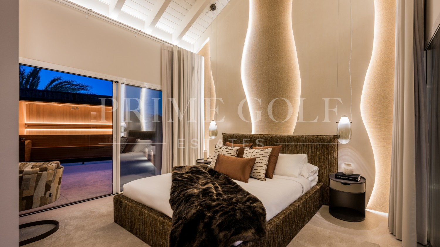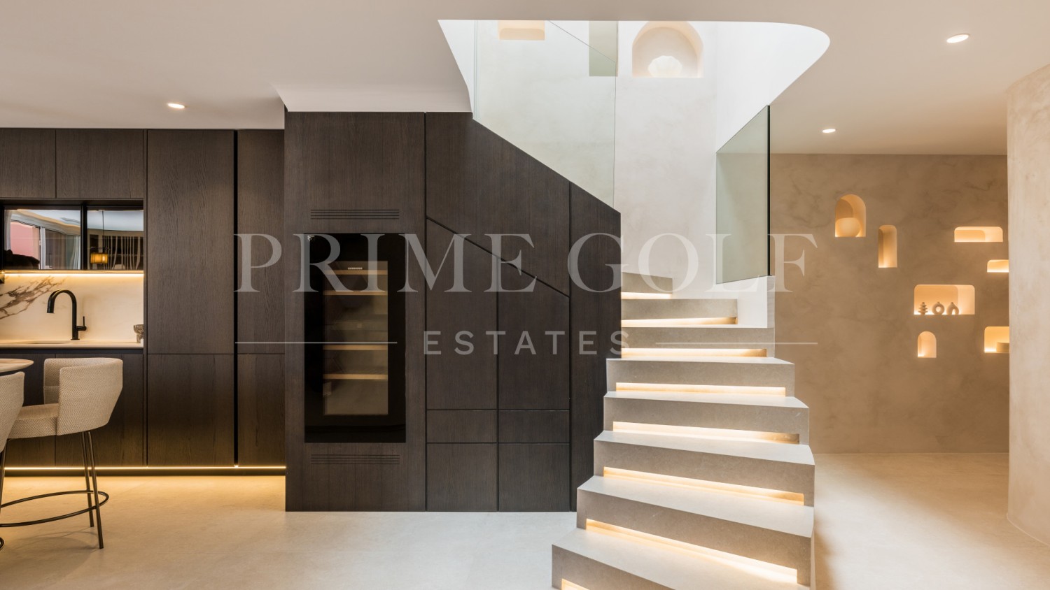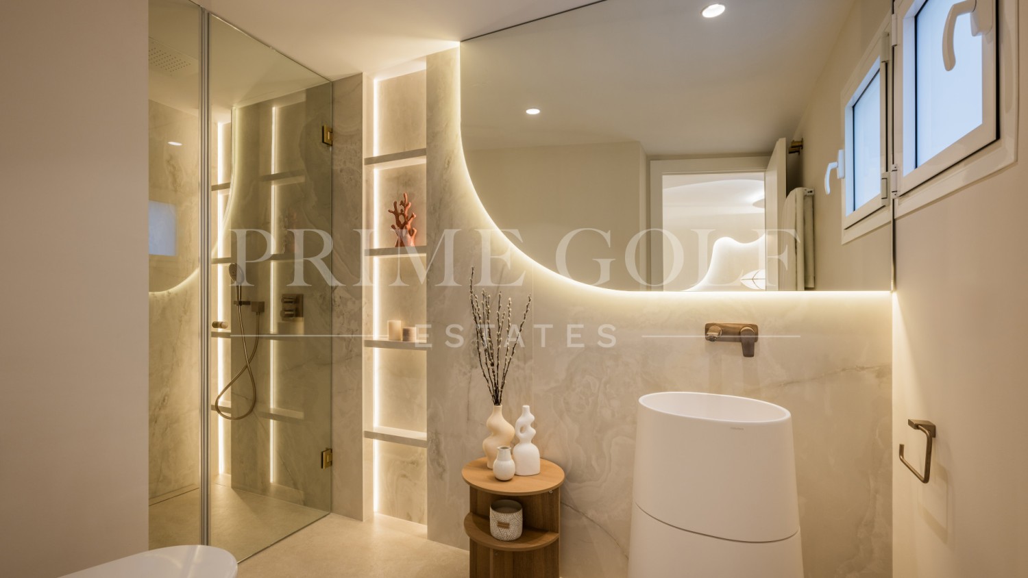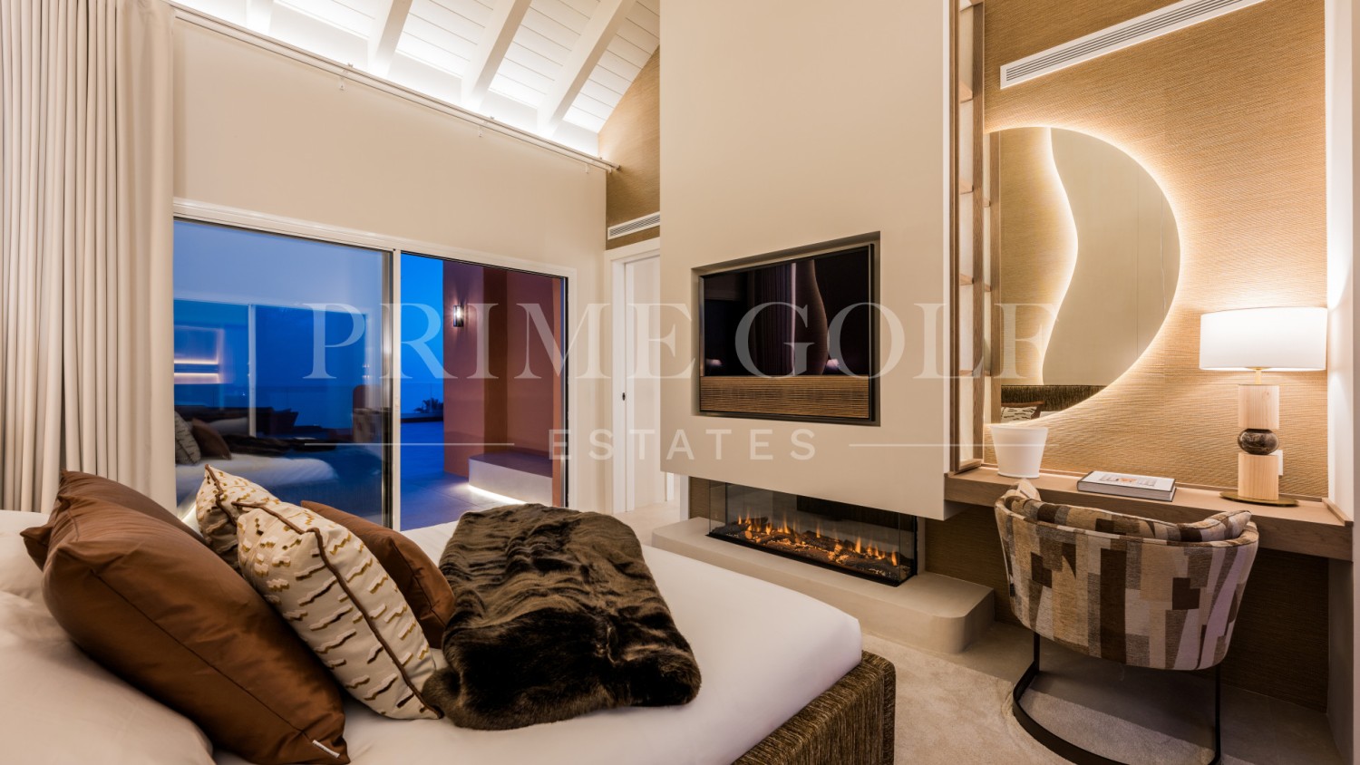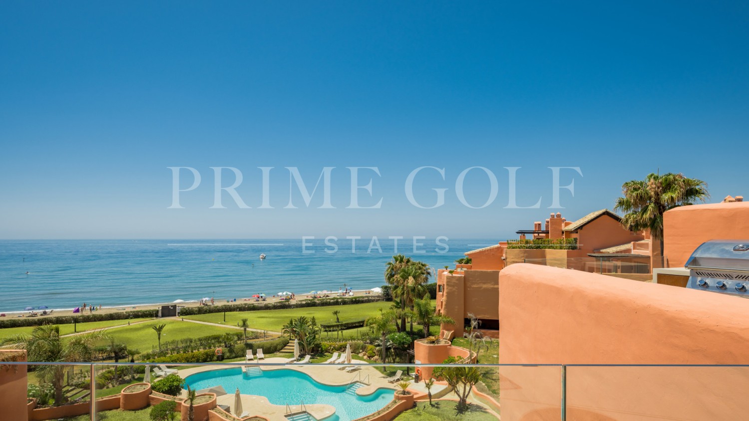 Exquisite four-bedroom, frontline beach duplex penthouse in La Morera, Reserva de Los Monteros. This beachside gated community has 24hr security, communal swimming pool, indoor pool, tropical gardens and direct access to the beach. This luxury property has been finished using high quality materials and elegant furniture. On the entrance level you have an open plan living and dining area with access to a spacious terrace with wonderful sea views; fully fitted open plan kitchen with Miele appliances; three guest suites; guest toilet; and a laundry room. The upper-level leads to the impressive master suite, complete with a walk-in closet and two private terraces. One of the terraces has a sauna and gym and the other gives access to an outdoor kitchen, jacuzzi lounge area and dining area; where you can relax and enjoy the amazing views. Other features include hot and cold air conditioning, underfloor heating, two private parking spaces and a storeroom.