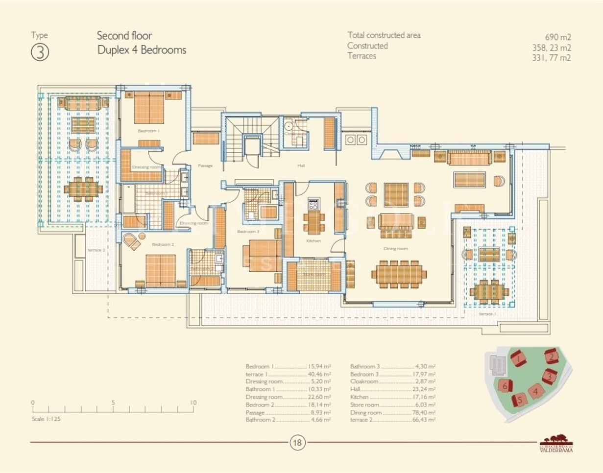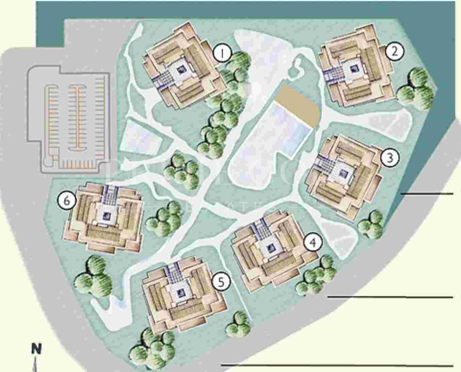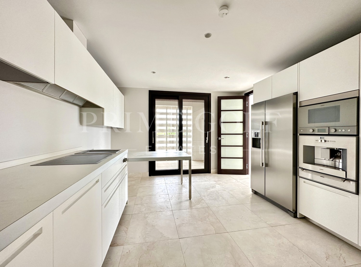 It is accessed from the first floor via stairs or elevator to the main floor divided into living / dining room of ample dimensions and exit to the east/south facing terrace overlooking the complex. Equipped kitchen, laundry terrace, guest bathroom and sleeping quarters area. There are three bedrooms with en suite bathrooms and closets.