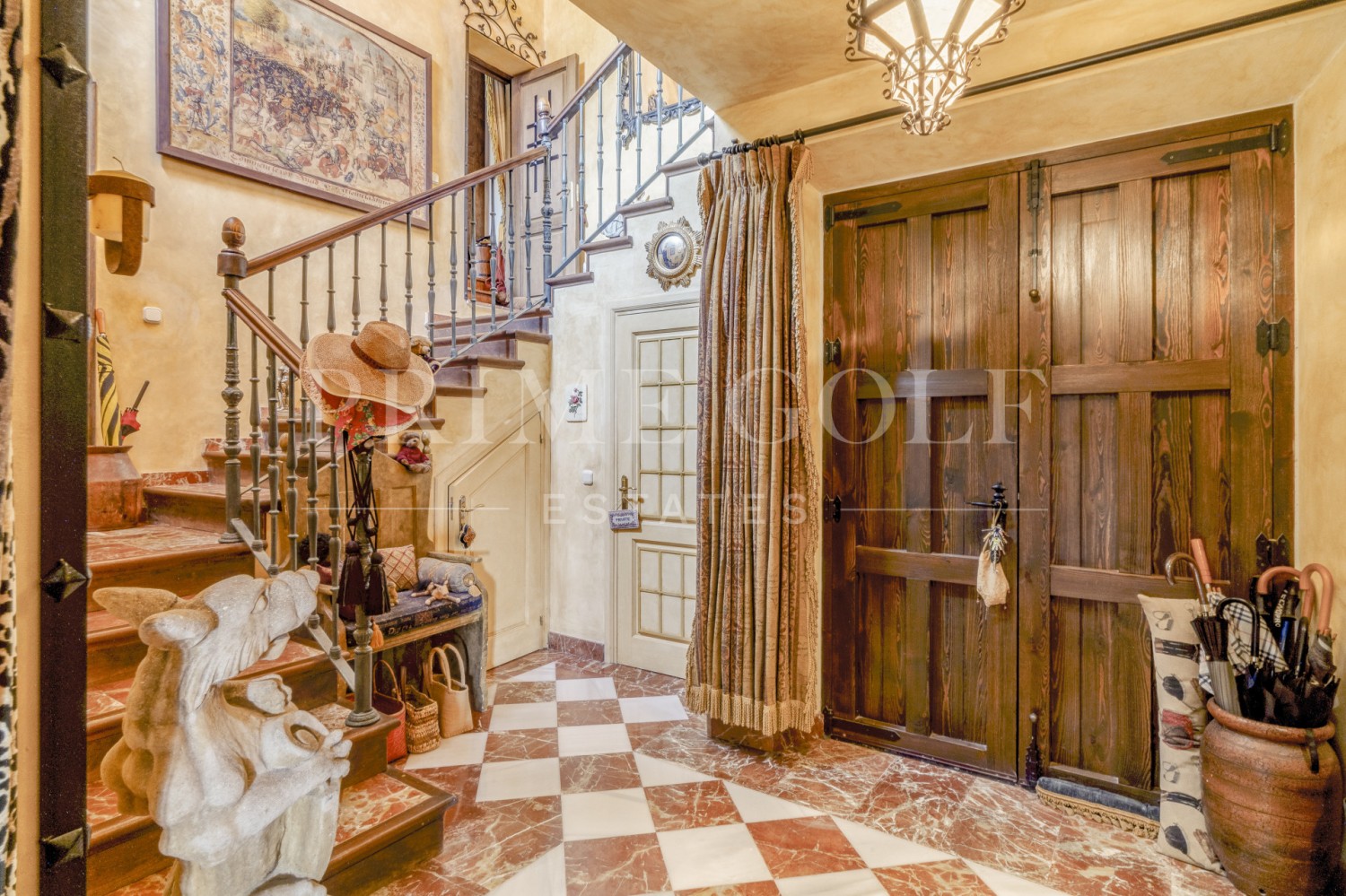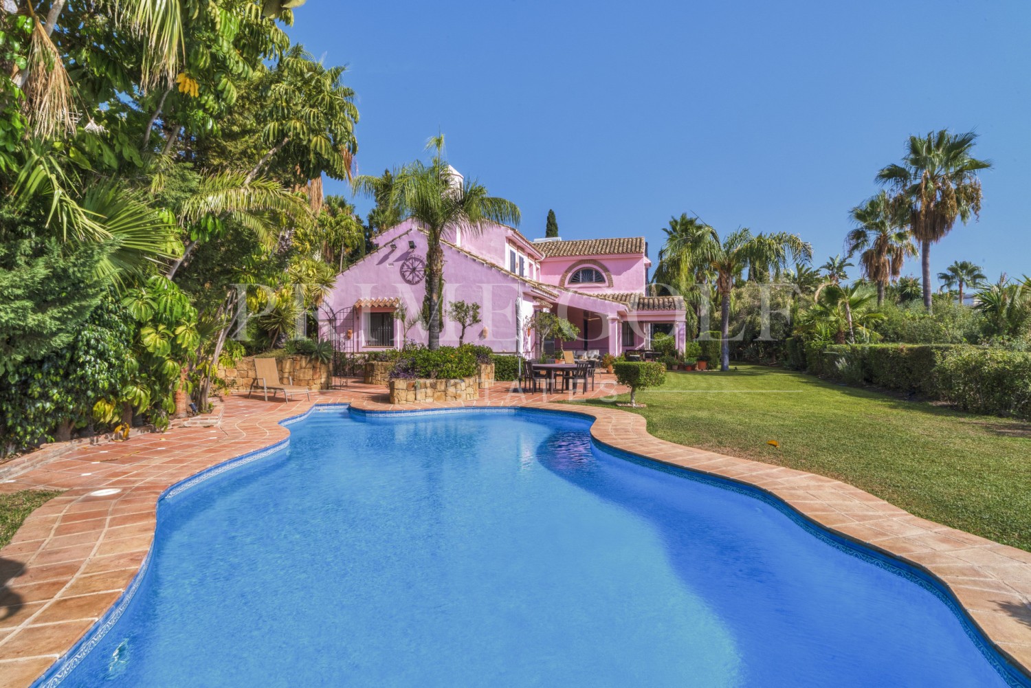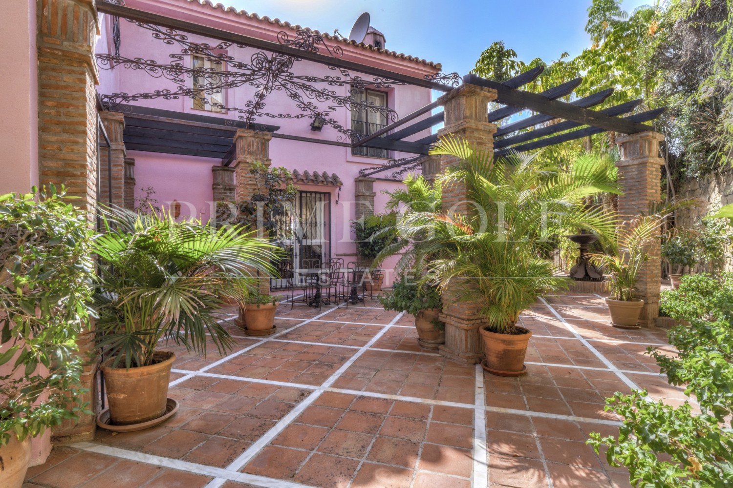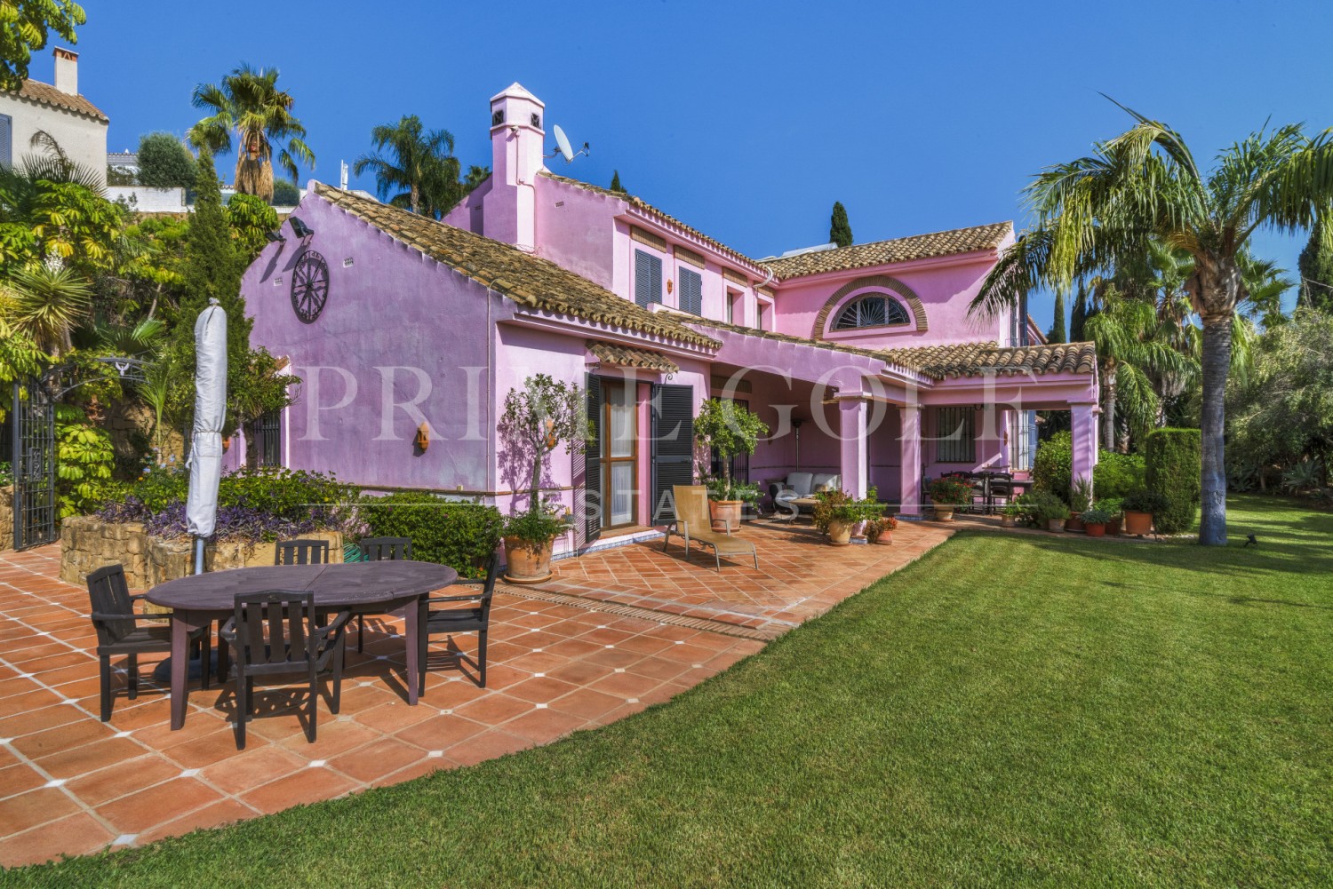 Charming five-bedroom Andalusian style villa in the gated community Puerto de Los Almendros, Benahavis. Located in a sought-after area, only ten minutes from Puerto Banús and the beach. The property is set on a large plot with mature gardens, swimming pool, barbecue area, and a courtyard with a fountain. The villa has a southwest orientation that boasts stunning views of the golf course and the country side which are fully protected. You enter the grounds through impressive gates into a courtyard with ample parking. The villa is distributed over 2 floors with a double height entrance hall and spacious rooms offering plenty of natural light throughout the house. The ground floor offers both formal and informal lounges; a dining room connected to a fully fitted kitchen, perfect for entertaining; and a Guest Suite. The first floor has the master suite and two bedrooms with an ensuite bathroom, all of the bedrooms open on to lovely balconies which can be accessed without entering the villa. In addition to reception areas this wonderful home also has a library, which could be the 6th bedroom, utility, laundry and storage rooms, and a studio apartment with independent access. Other features include air-conditioning, gas central heating, security window bars, fitted wardrobes and solar panels. This traditional villa was designed by renowned architect Cesar De Leyva and is the epitome of luxury living; it can be your full-time residence or a holiday retreat offering absolute peace and privacy.