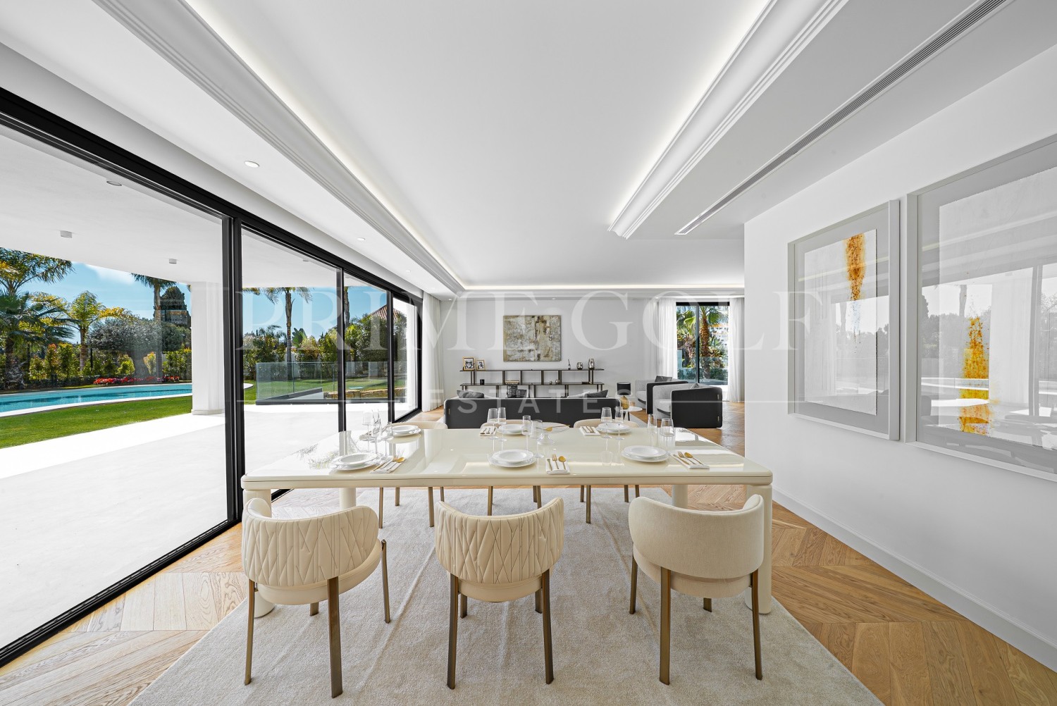 Entering the villa, the main floor has a large space divided into several areas. The fully equipped kitchen with state-of-the-art appliances has a custom-made island.
