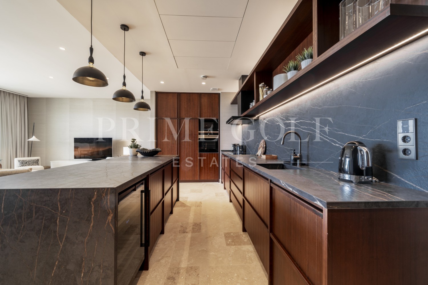 The apartment includes three spacious en-suite bedrooms, each adorned with warm sand-toned Carrara marble bathrooms, complete with double sinks and showers. The master suite boasts a bespoke walk-in closet, a bathtub, and an immense window that opens directly onto the terrace. Characterful wooden finishes and high-quality materials throughout enhance the inviting atmosphere. The muted palette in sandy tones creates a warm aesthetic, harmonising beautifully with the natural surroundings.