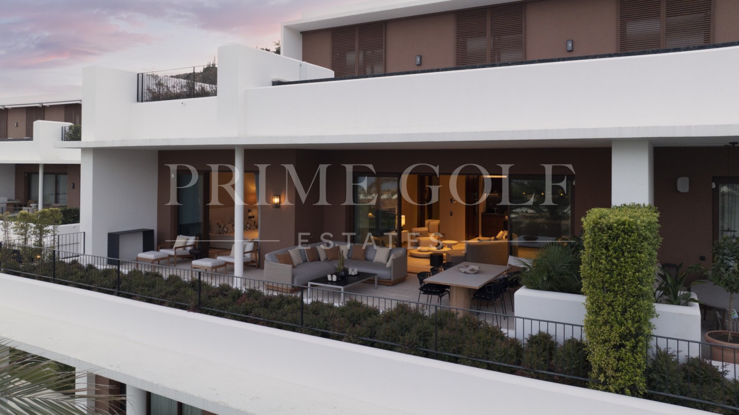 An elegant entrance leads to a bright, open-plan living and dining area, where dark stone and wood create a sophisticated kitchen space. This thoughtful design is complemented by an independent laundry room. The living area extends to a large terrace with shaded areas for sunny days, a dining space, and a chill-out zone offering stunning views of the sea and the golf course.