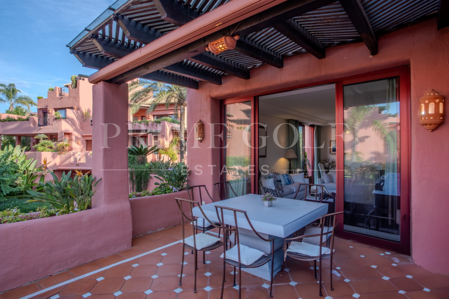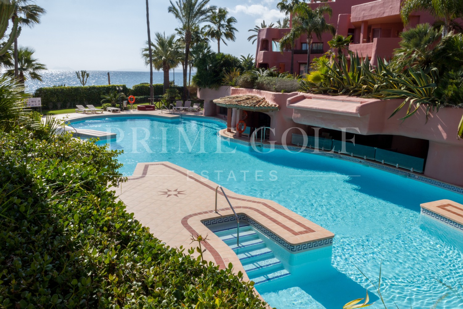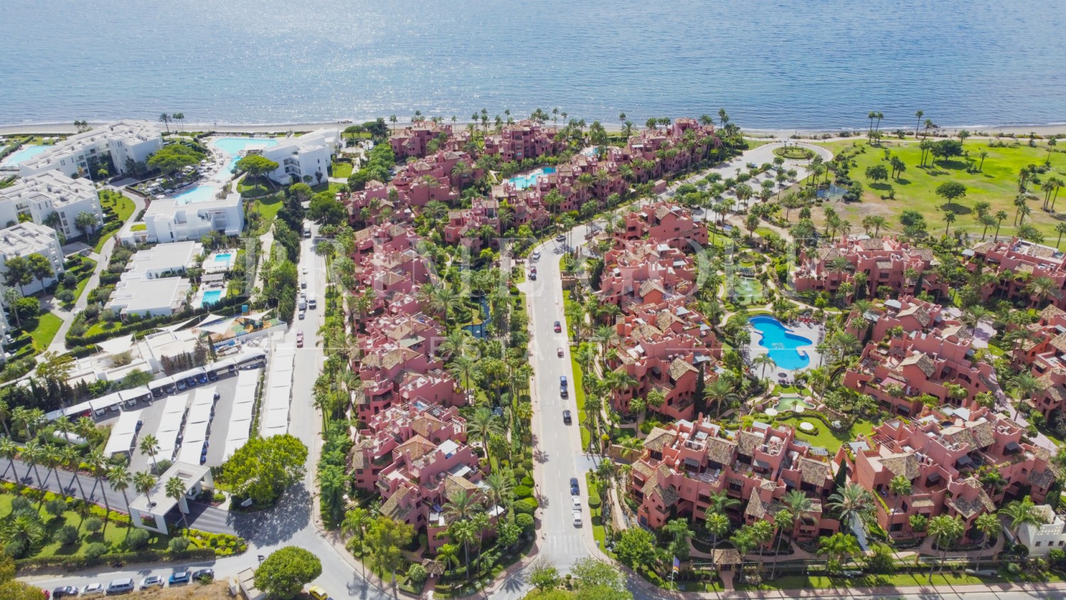 Impressive three bedroom south facing duplex penthouse in the prestigious and gated beachfront community Menara Beach, Estepona. This sought-after complex has well-kept tropical gardens, outdoor communal swimming pool, indoor heated swimming pool and gymnasium, as well as being just ten minutes’ drive to Puerto Banus and a short drive to shops, restaurants and all amenities. The property has an open plan living and dining area with patio doors leading to two private terraces with beautiful sea views; fully fitted kitchen with separate laundry area; guest suite with access to the terrace; guest bedroom; and a guest bathroom. The upper-level leads to the impressive master suite with vaulted ceilings and a private terrace; on this level there is an additional large terrace with BBQ area and stunning views of the community and sea. Other features include fitted wardrobes throughout, marble floors, hot and cold air conditioning, underfloor heating in the bathrooms, private parking and store room.