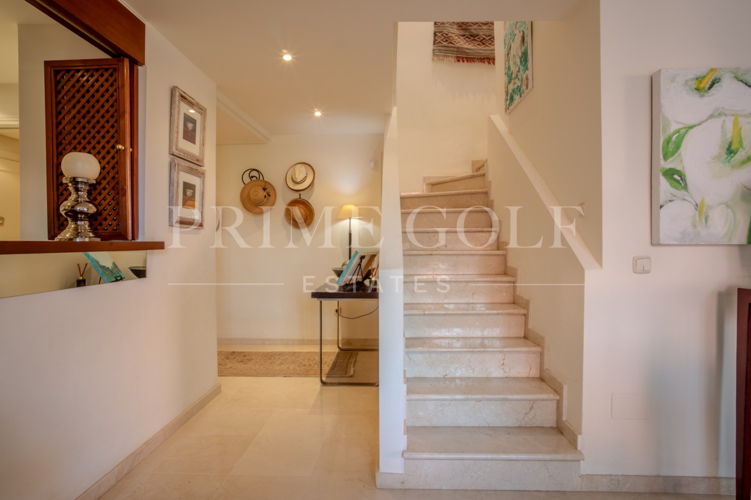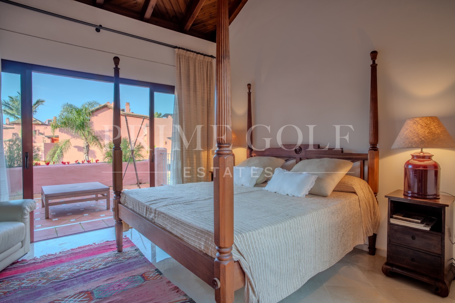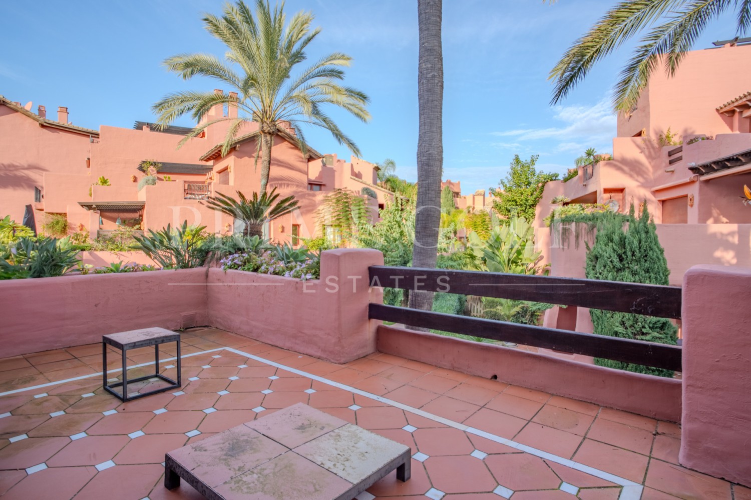 Impressive three bedroom south facing duplex penthouse in the prestigious and gated beachfront community Menara Beach, Estepona. This sought-after complex has well-kept tropical gardens, outdoor communal swimming pool, indoor heated swimming pool and gymnasium, as well as being just ten minutes’ drive to Puerto Banus and a short drive to shops, restaurants and all amenities. The property has an open plan living and dining area with patio doors leading to two private terraces with beautiful sea views; fully fitted kitchen with separate laundry area; guest suite with access to the terrace; guest bedroom; and a guest bathroom. The upper-level leads to the impressive master suite with vaulted ceilings and a private terrace; on this level there is an additional large terrace with BBQ area and stunning views of the community and sea. Other features include fitted wardrobes throughout, marble floors, hot and cold air conditioning, underfloor heating in the bathrooms, private parking and store room.